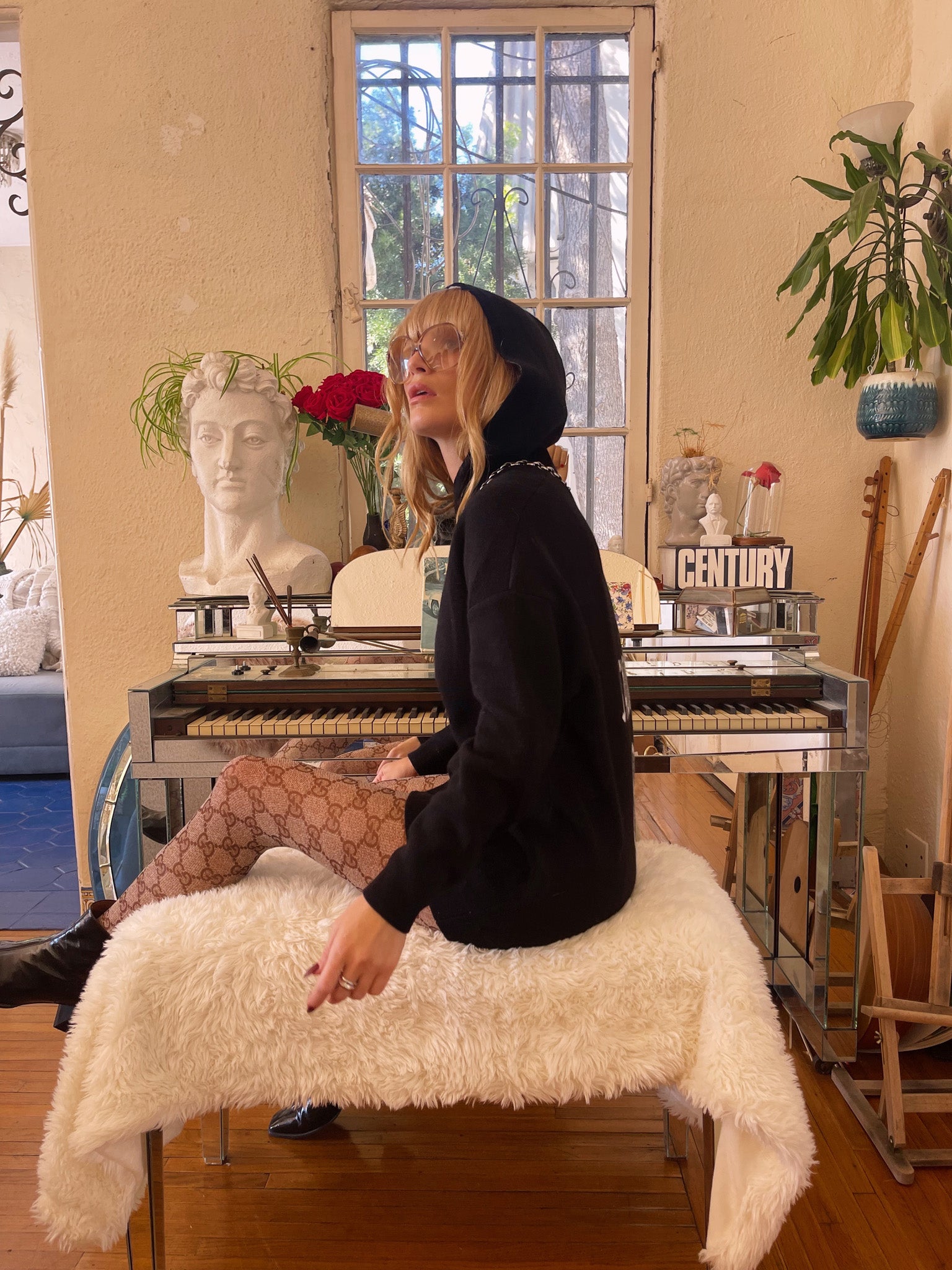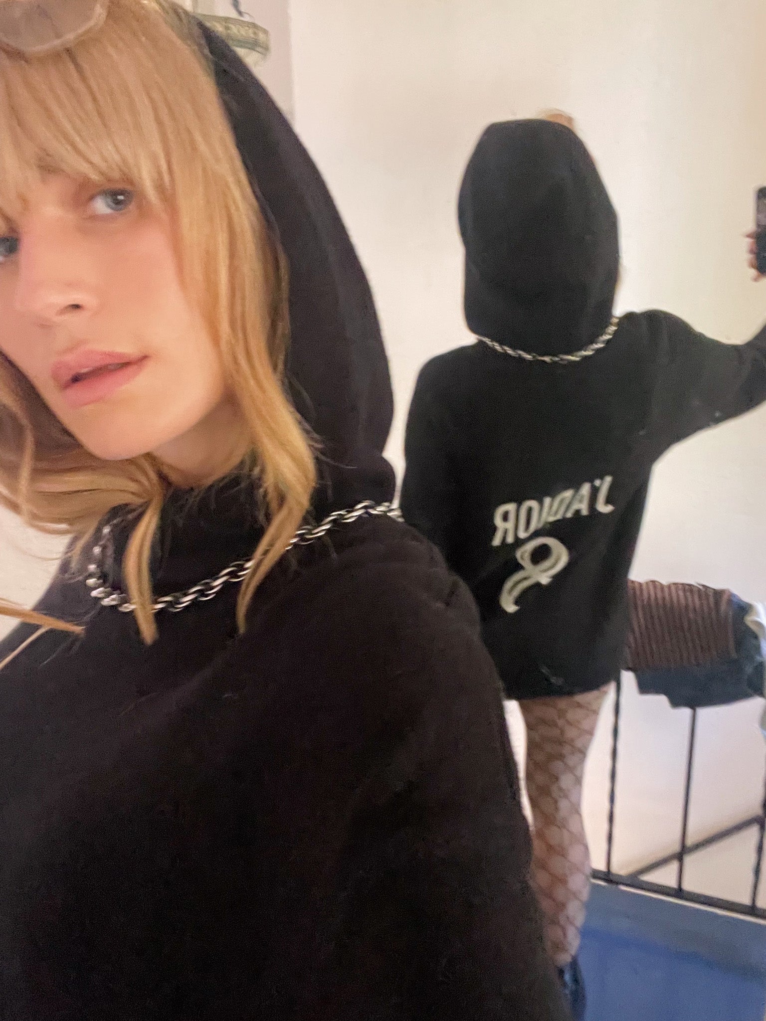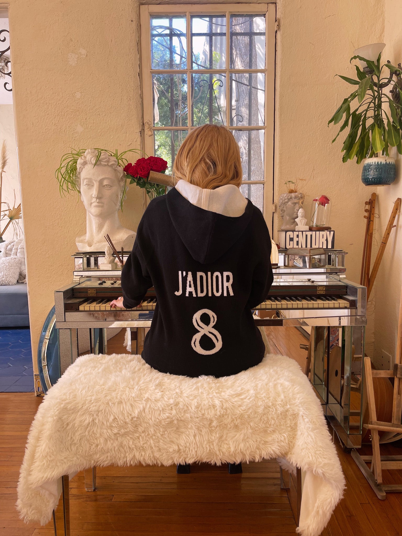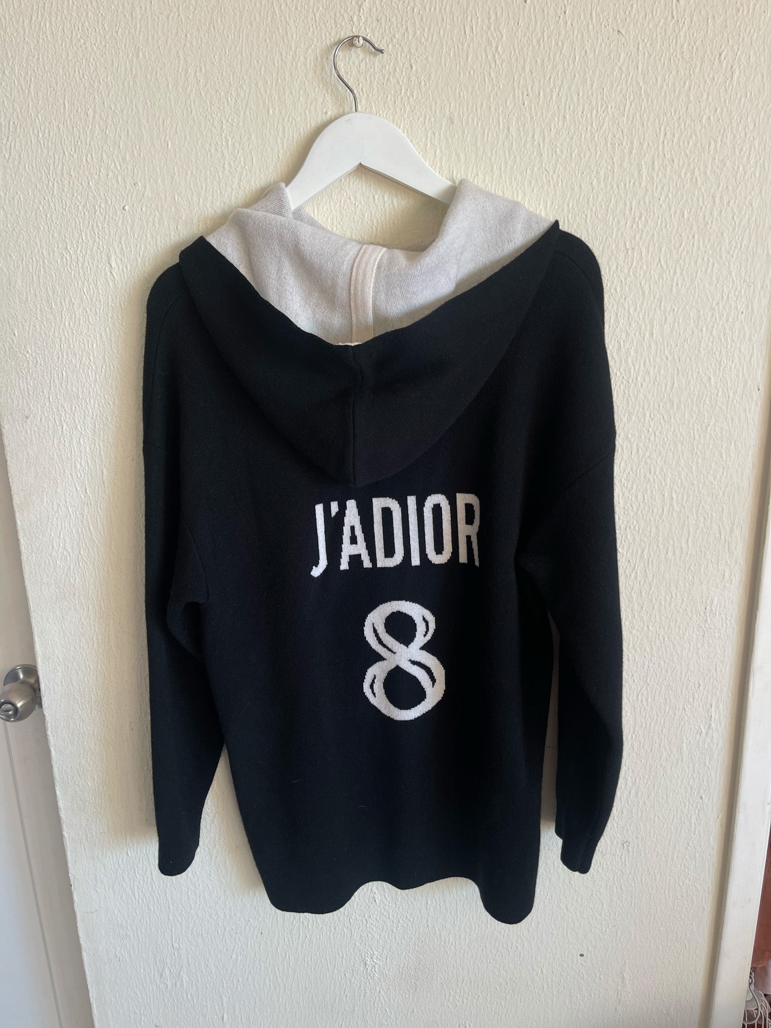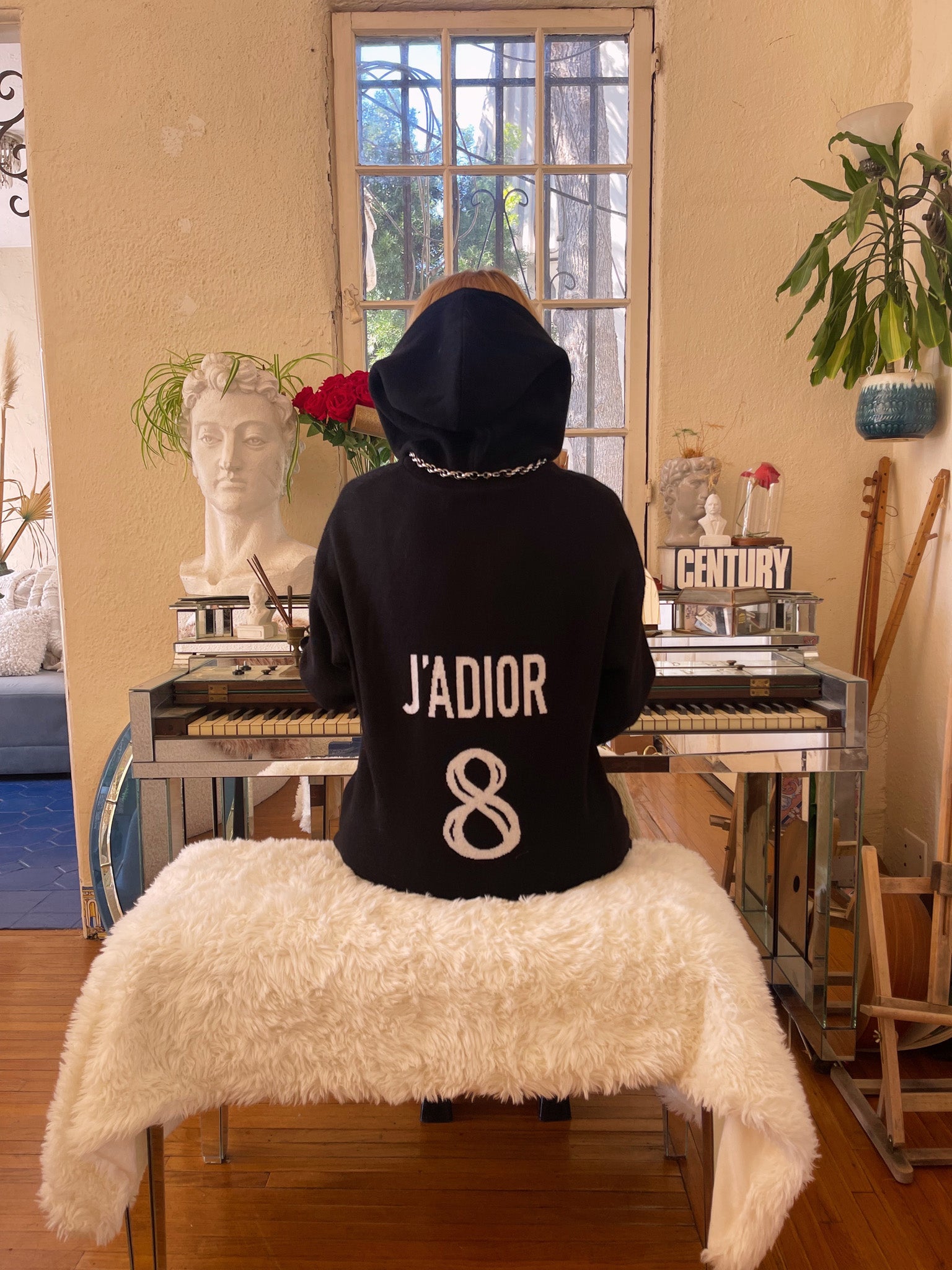 Off-duty couture — this Christian Dior J’ADIOR 8 hooded sweater blends cashmere luxury with iconic house branding, giving laid-back elegance a Parisian twist.