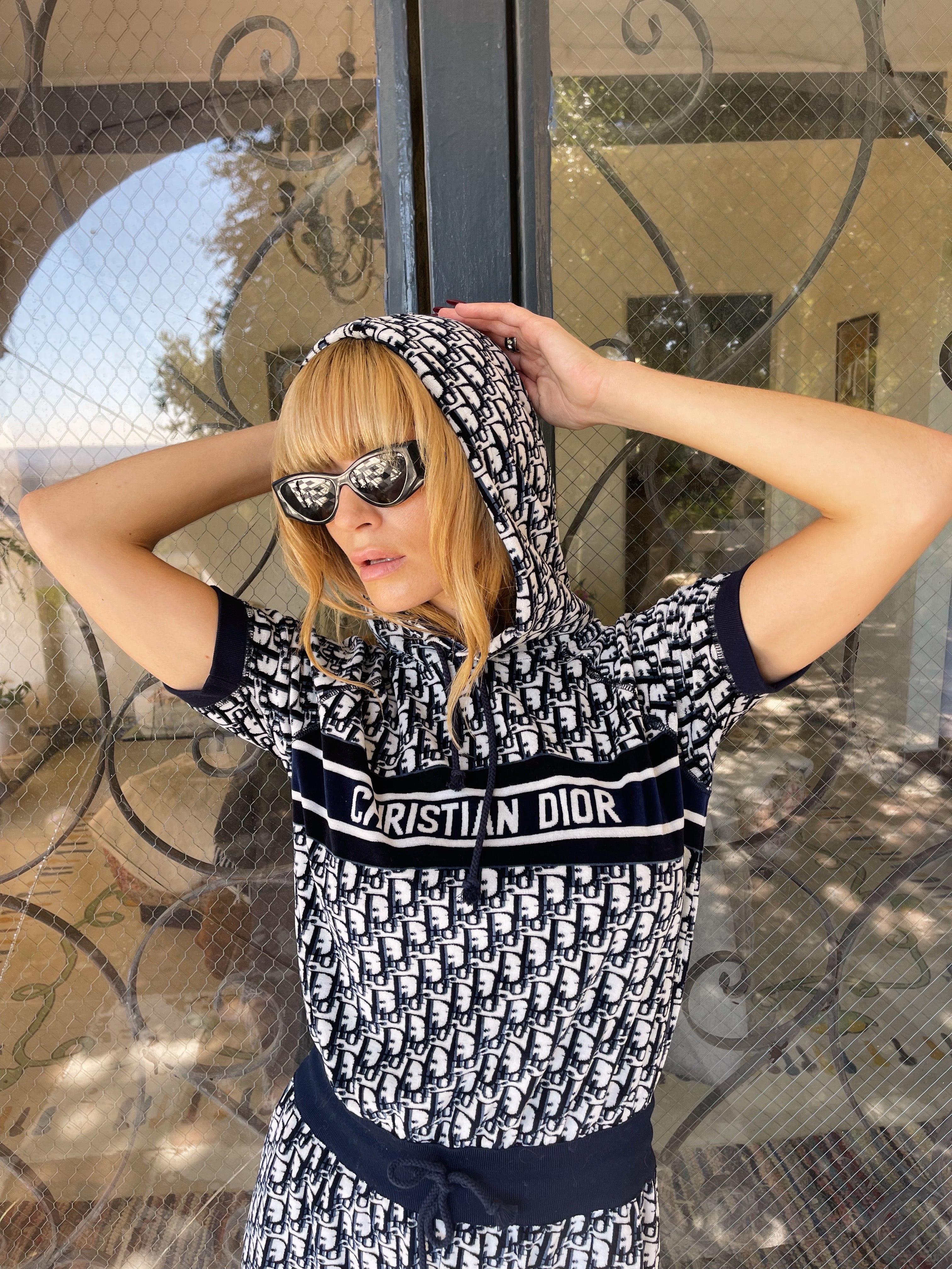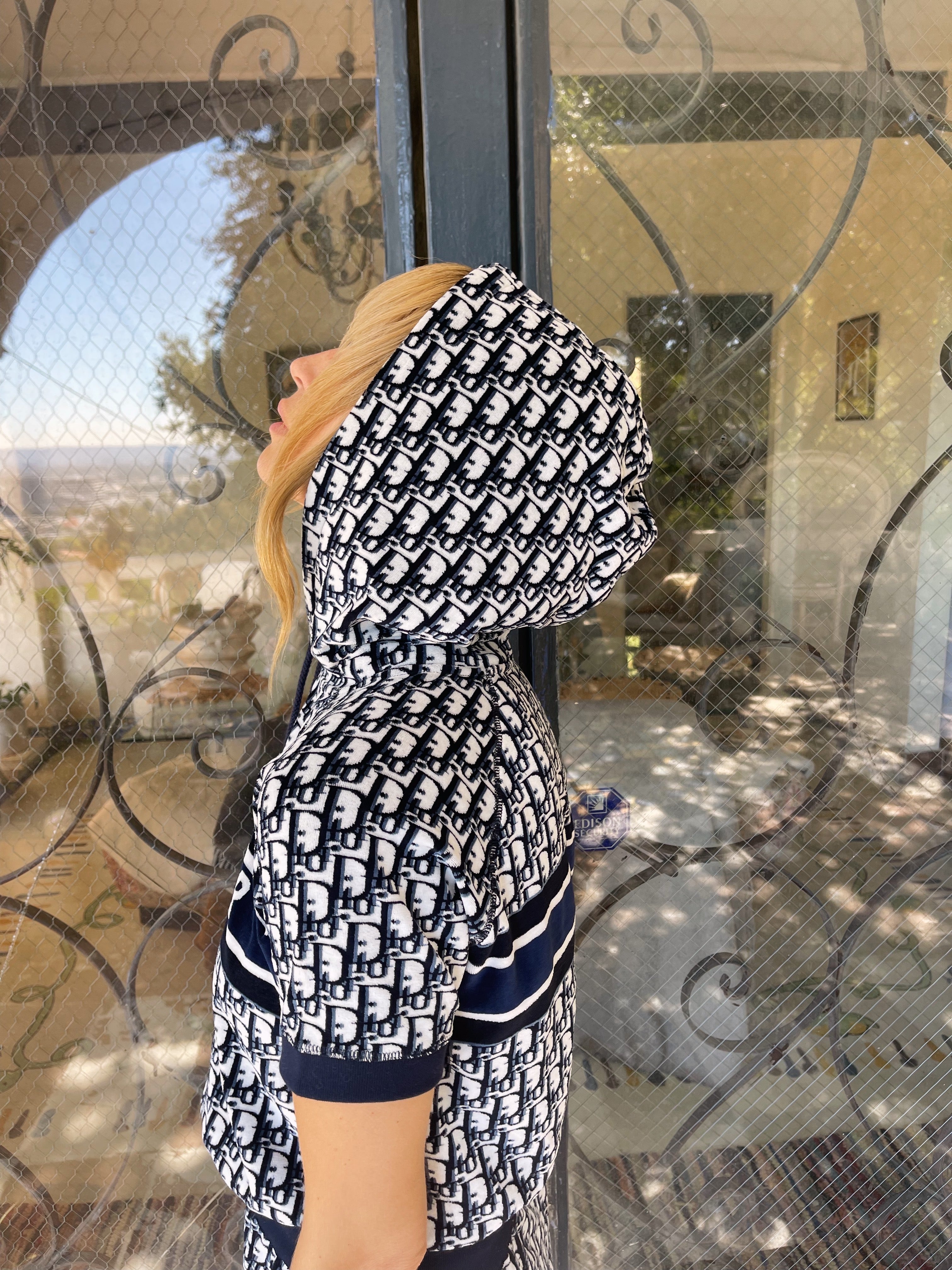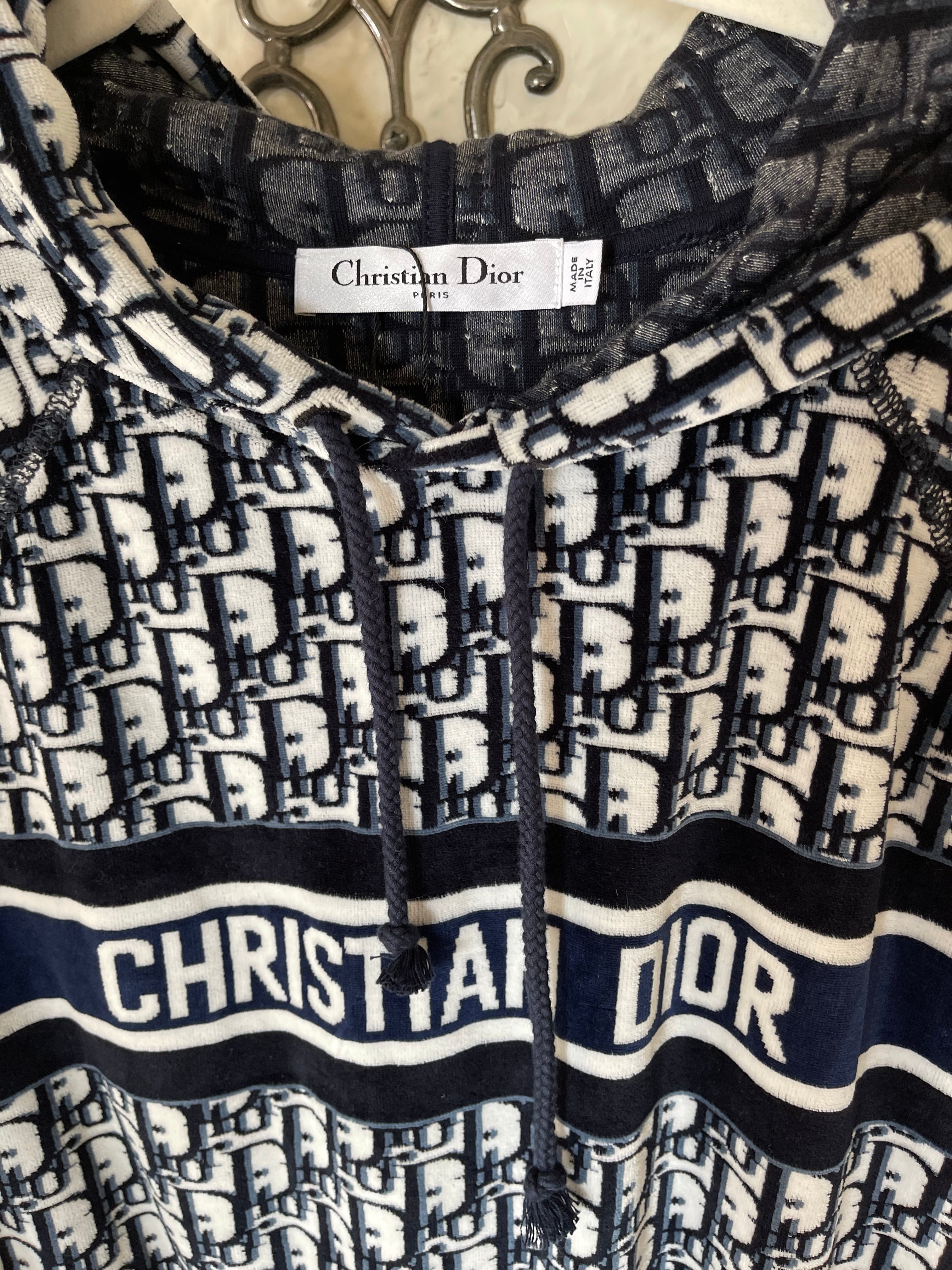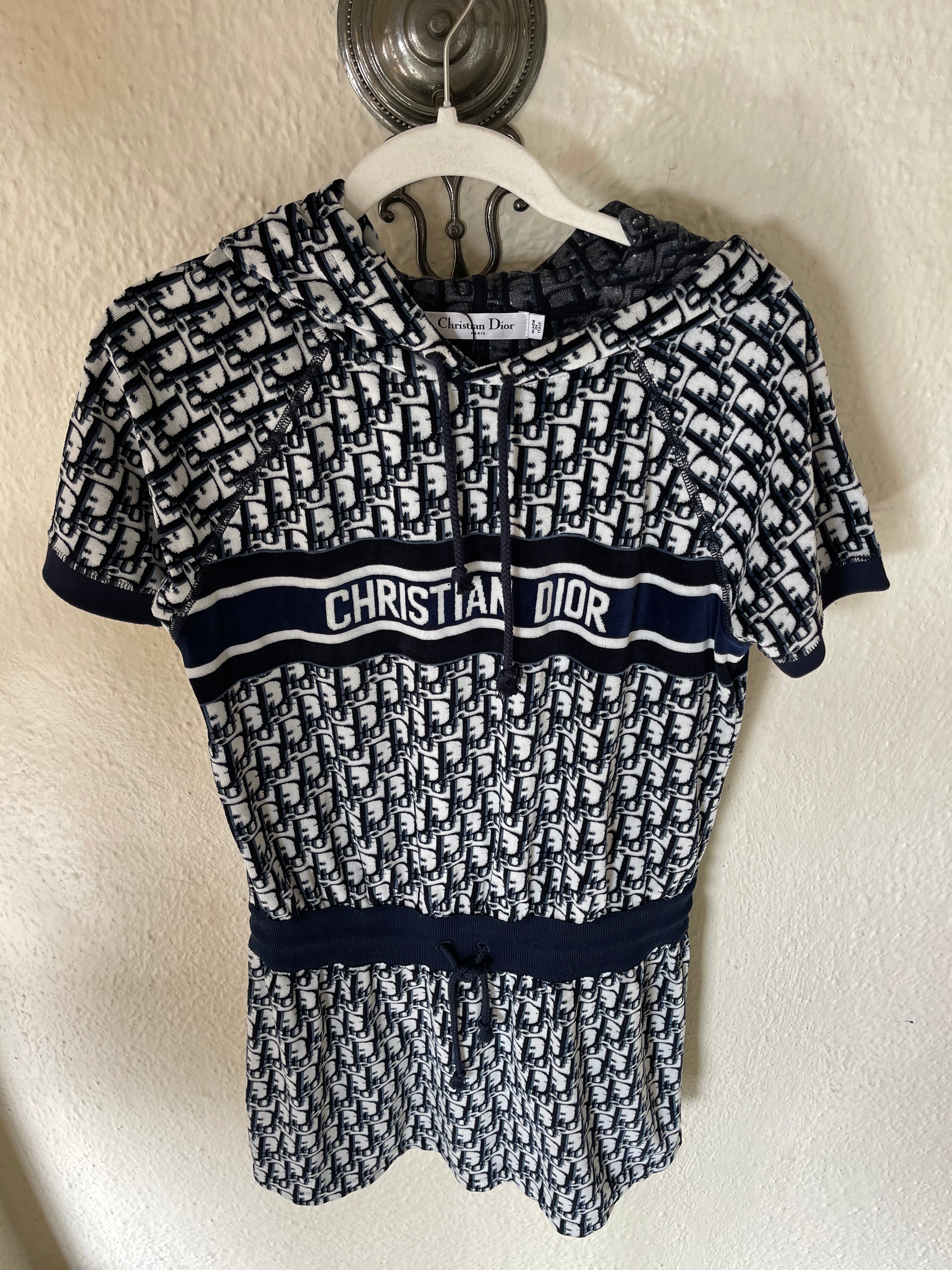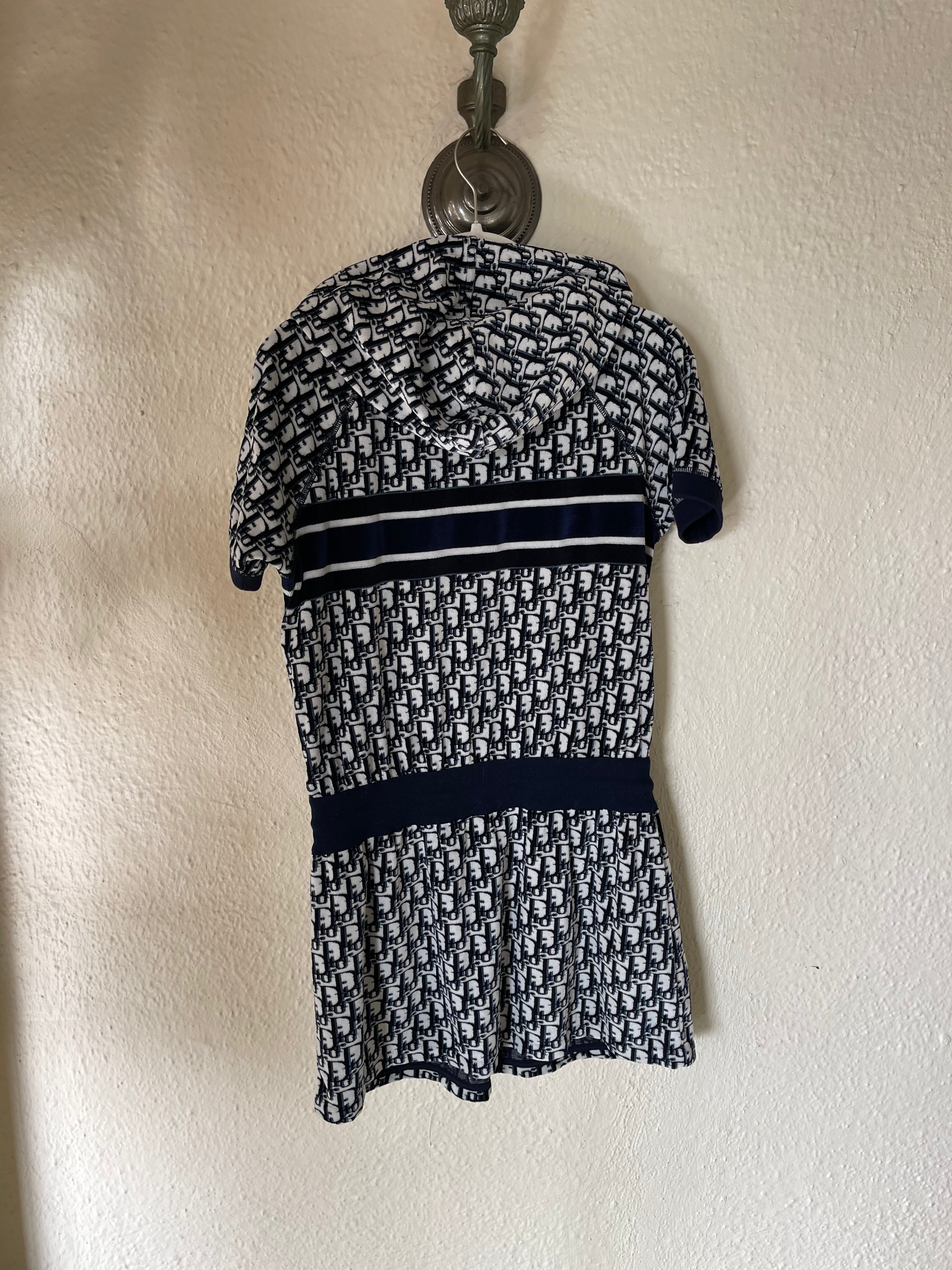 Christian Dior hooded mini — the ultimate y2k dream. Plush navy terry towel fabric, signature oblique monogram, and that bold CHRISTIAN DIOR band across the chest — the resort dress that defined an era.