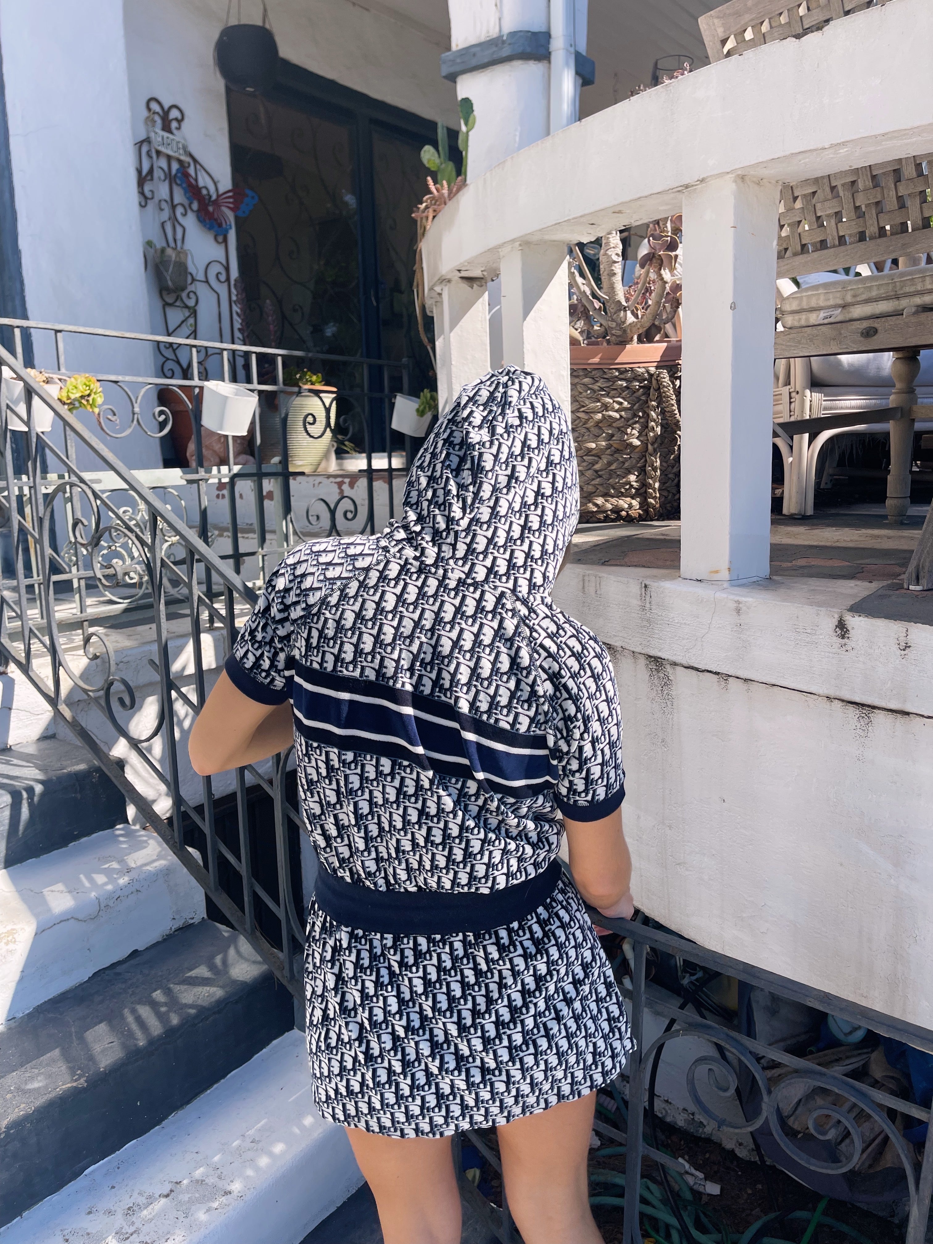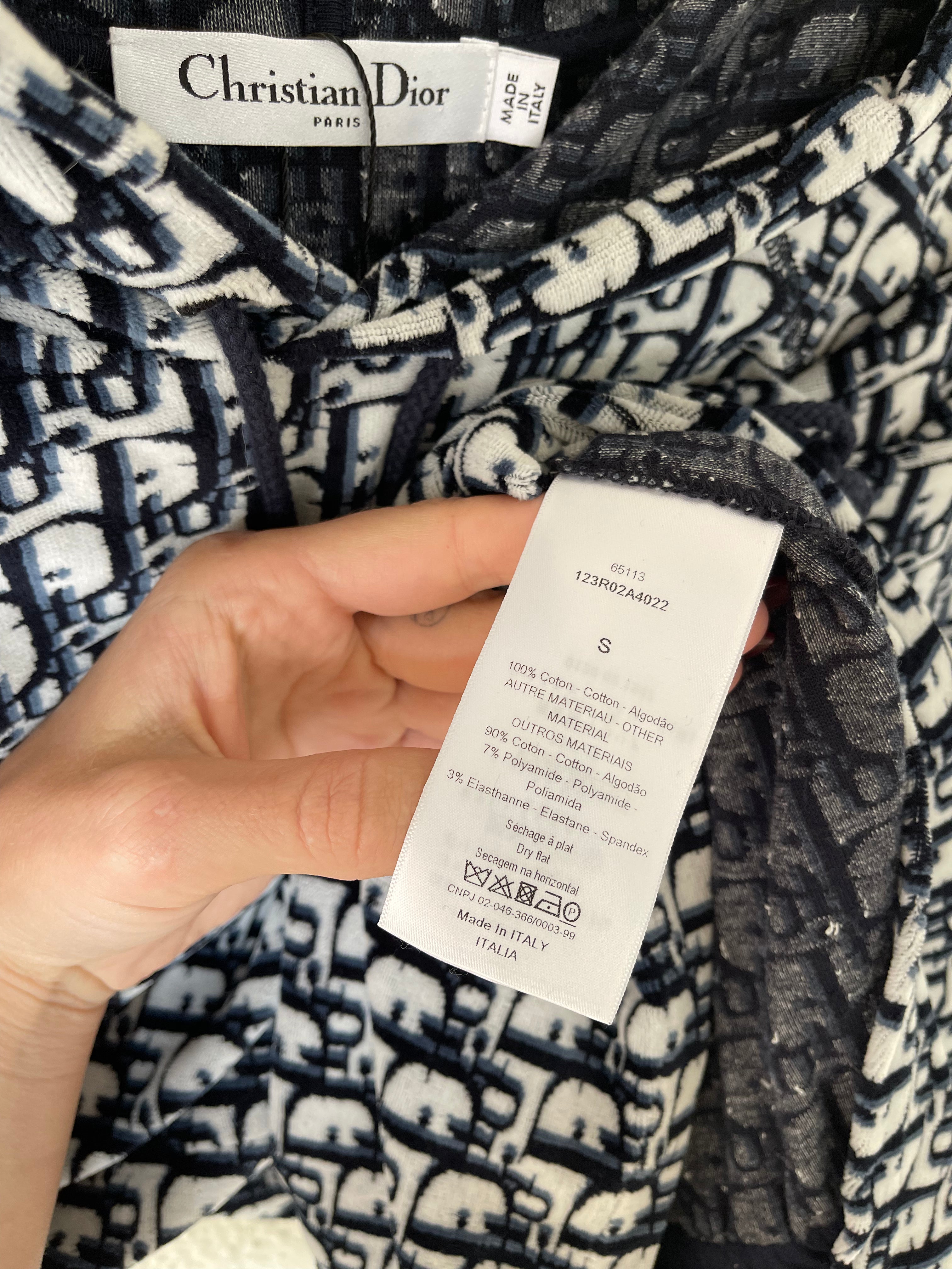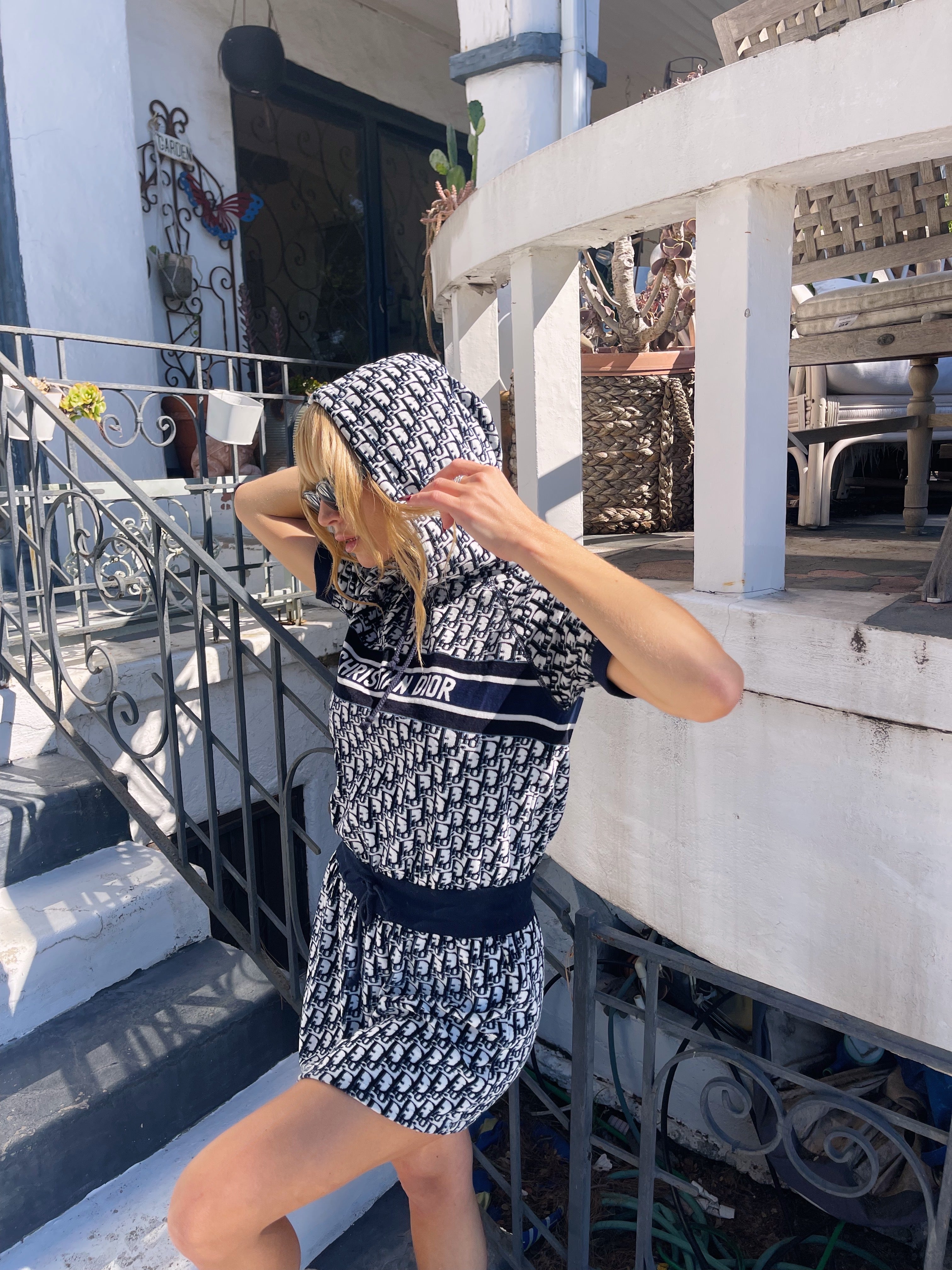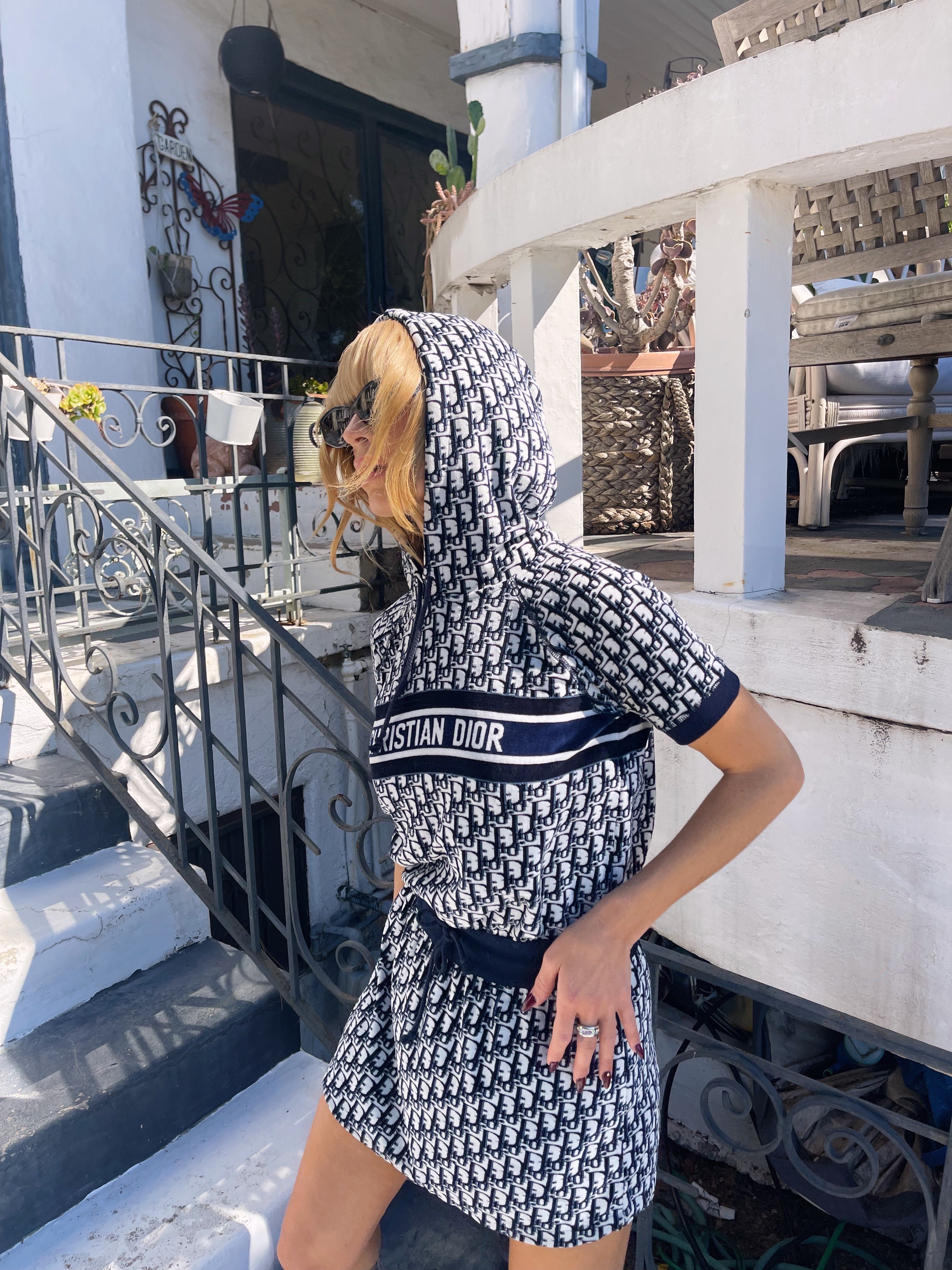 Christian Dior hooded mini — the ultimate y2k dream. Plush navy terry towel fabric, signature oblique monogram, and that bold CHRISTIAN DIOR band across the chest — the resort dress that defined an era.