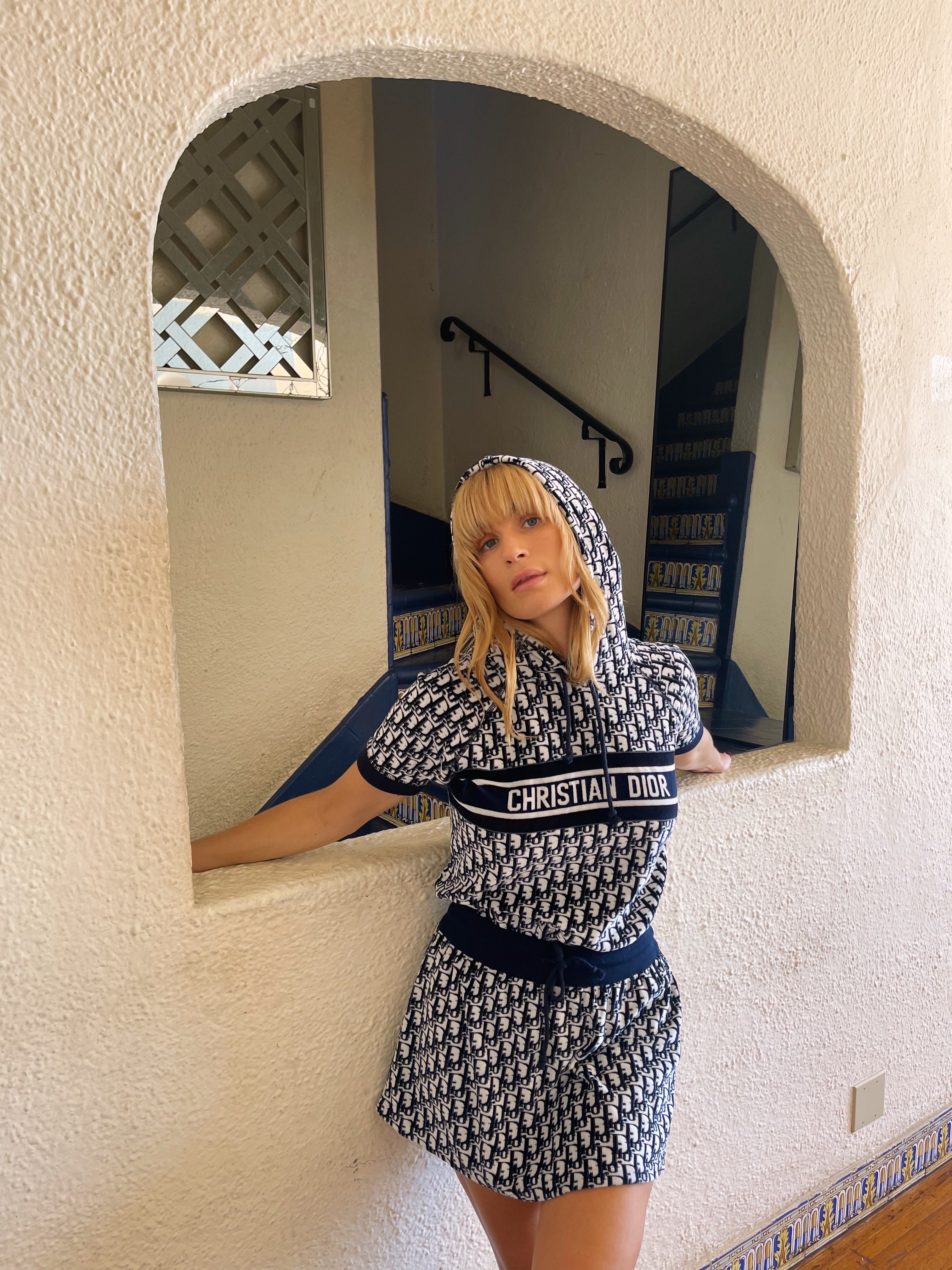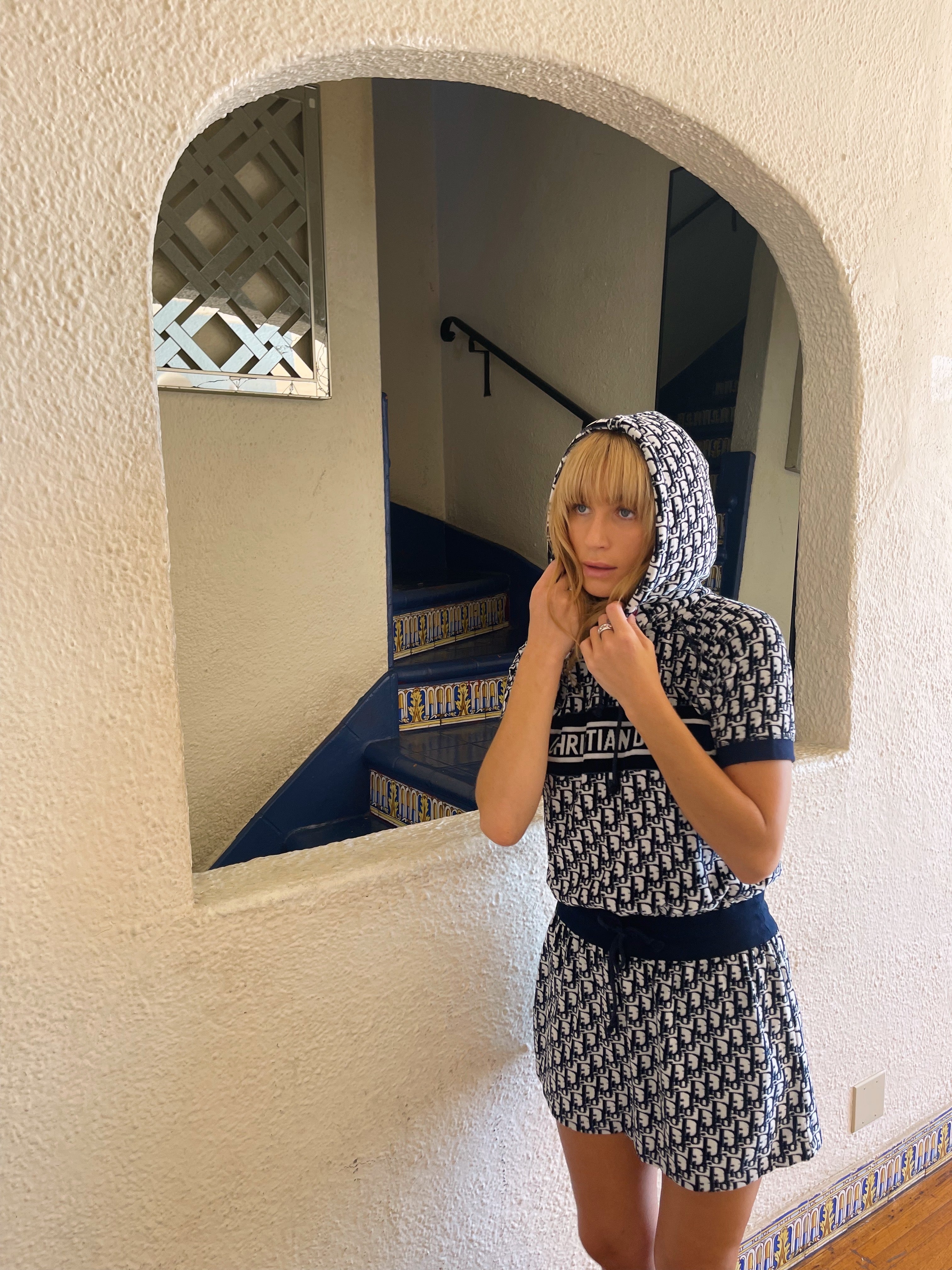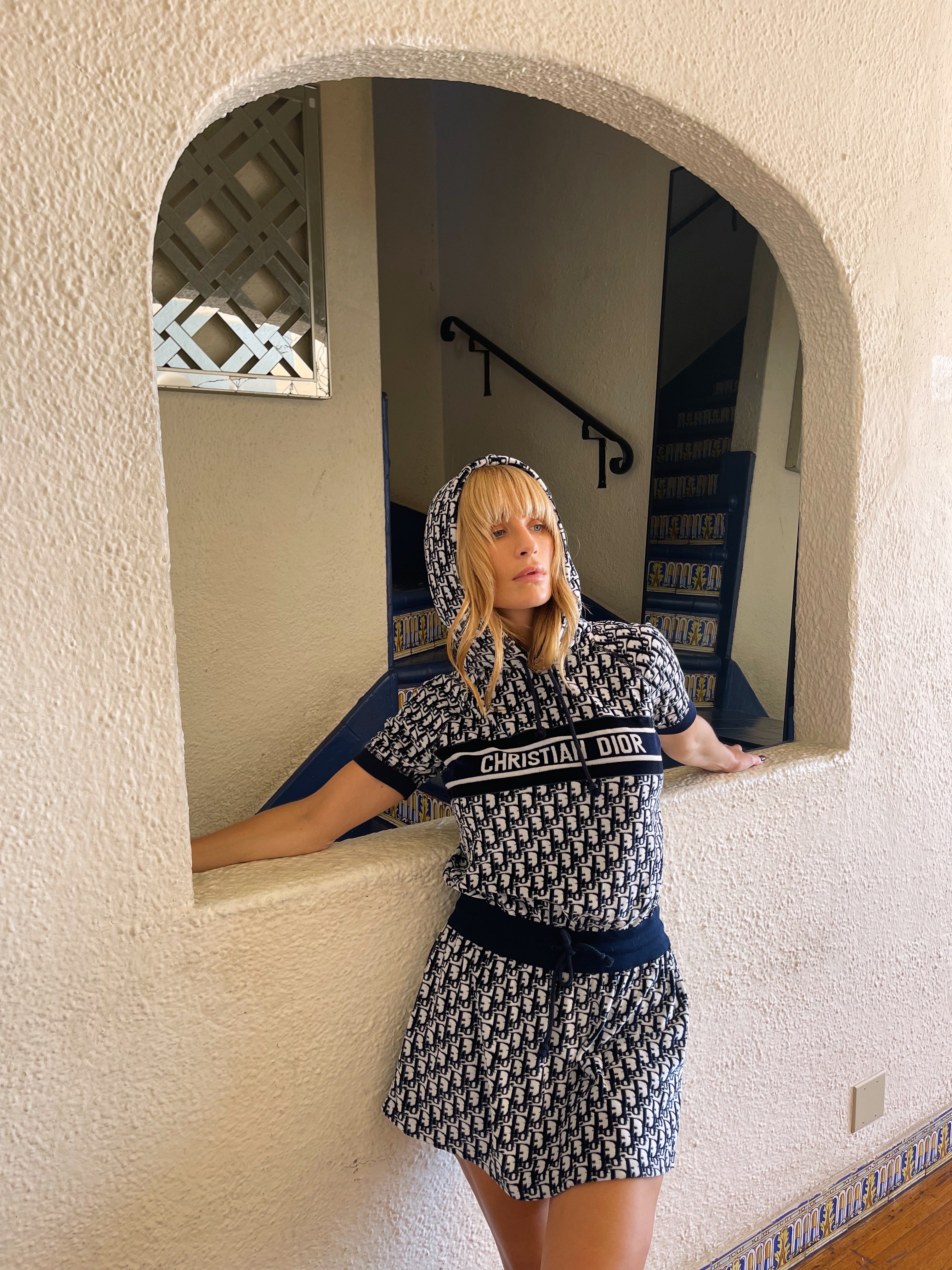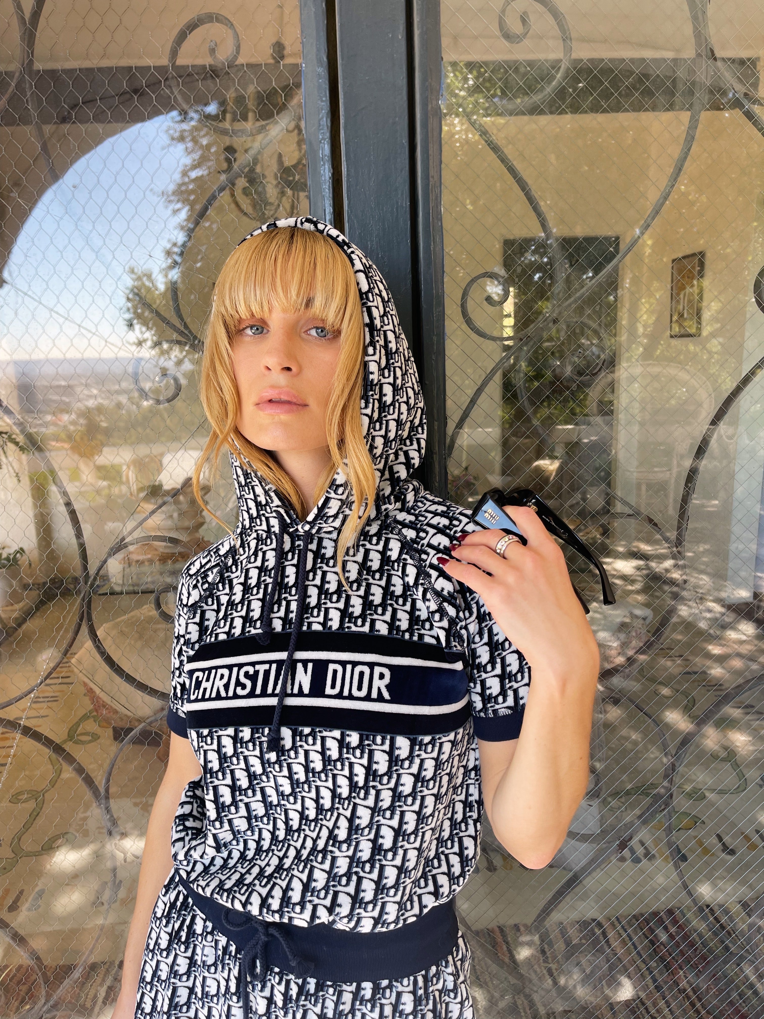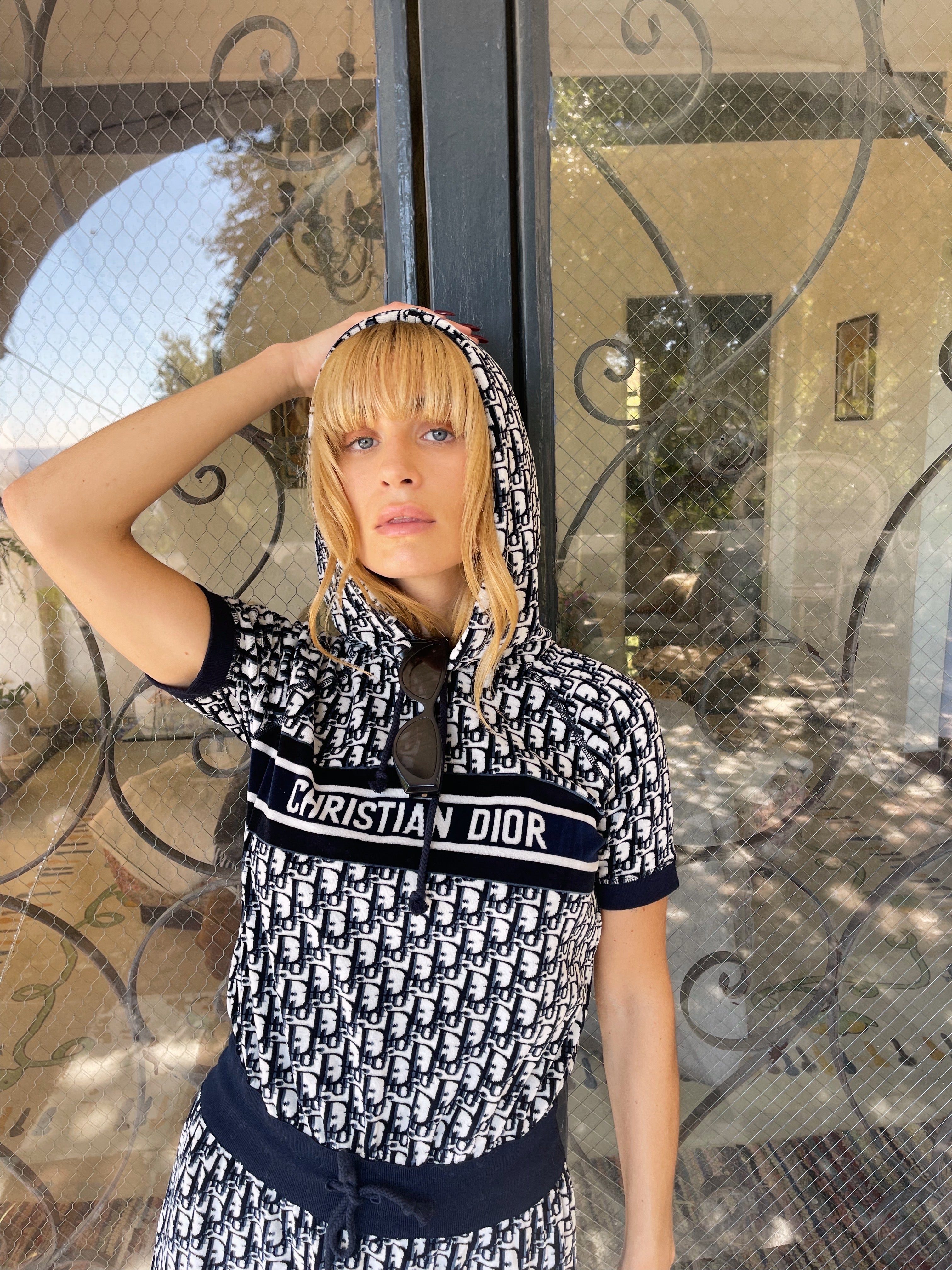 Christian Dior hooded mini — the ultimate y2k dream. Plush navy terry towel fabric, signature oblique monogram, and that bold CHRISTIAN DIOR band across the chest — the resort dress that defined an era.
