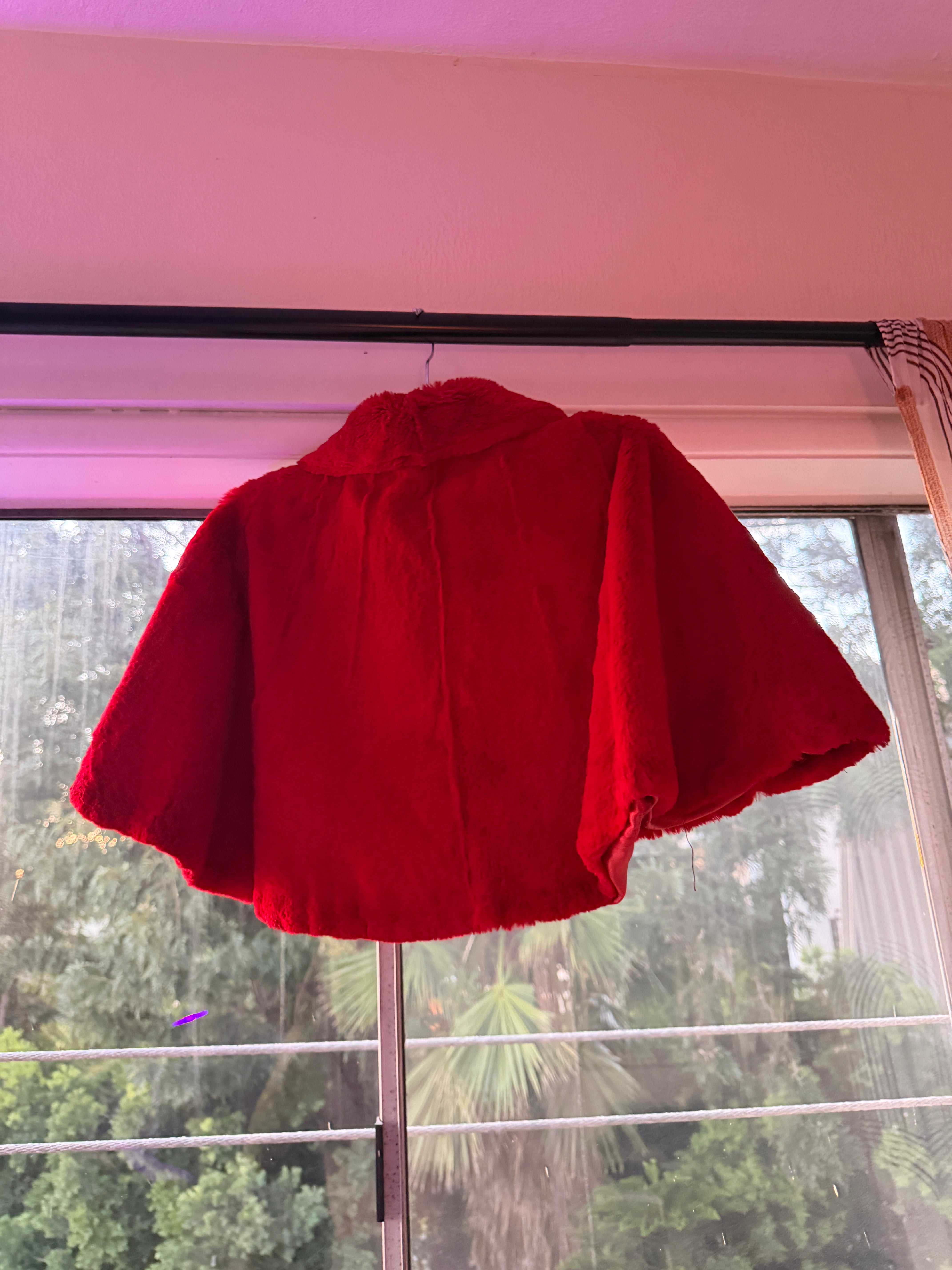 Rare 30s bed jacket is crafted from rich crimson velvet with a softly structured, cropped capelet silhouette — true heirloom lounge piece from the golden age of glamour.