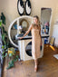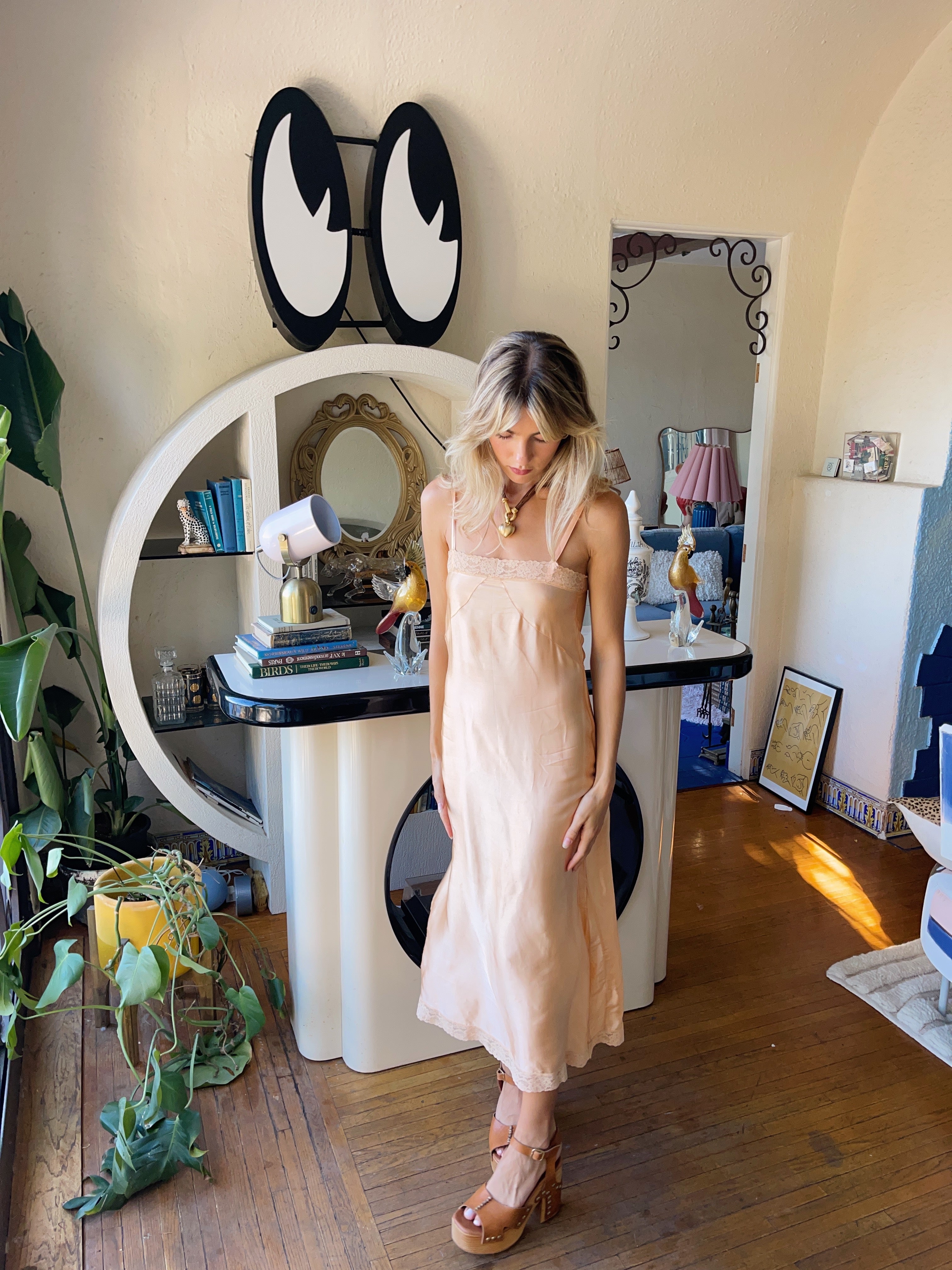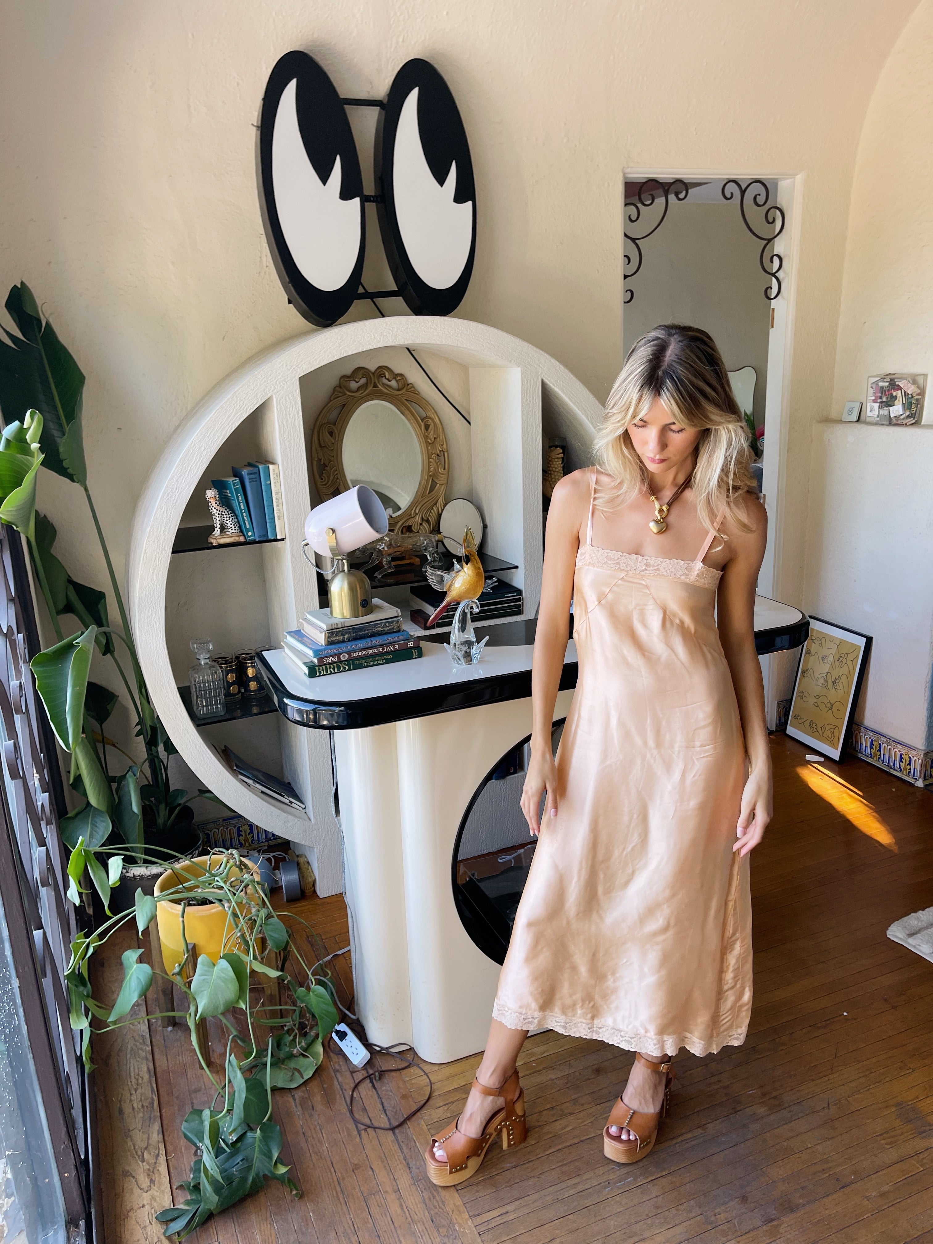 1930s silk slip dress in a muted peach hue — finished with lace trim for that timeless antique boho bridal romance.