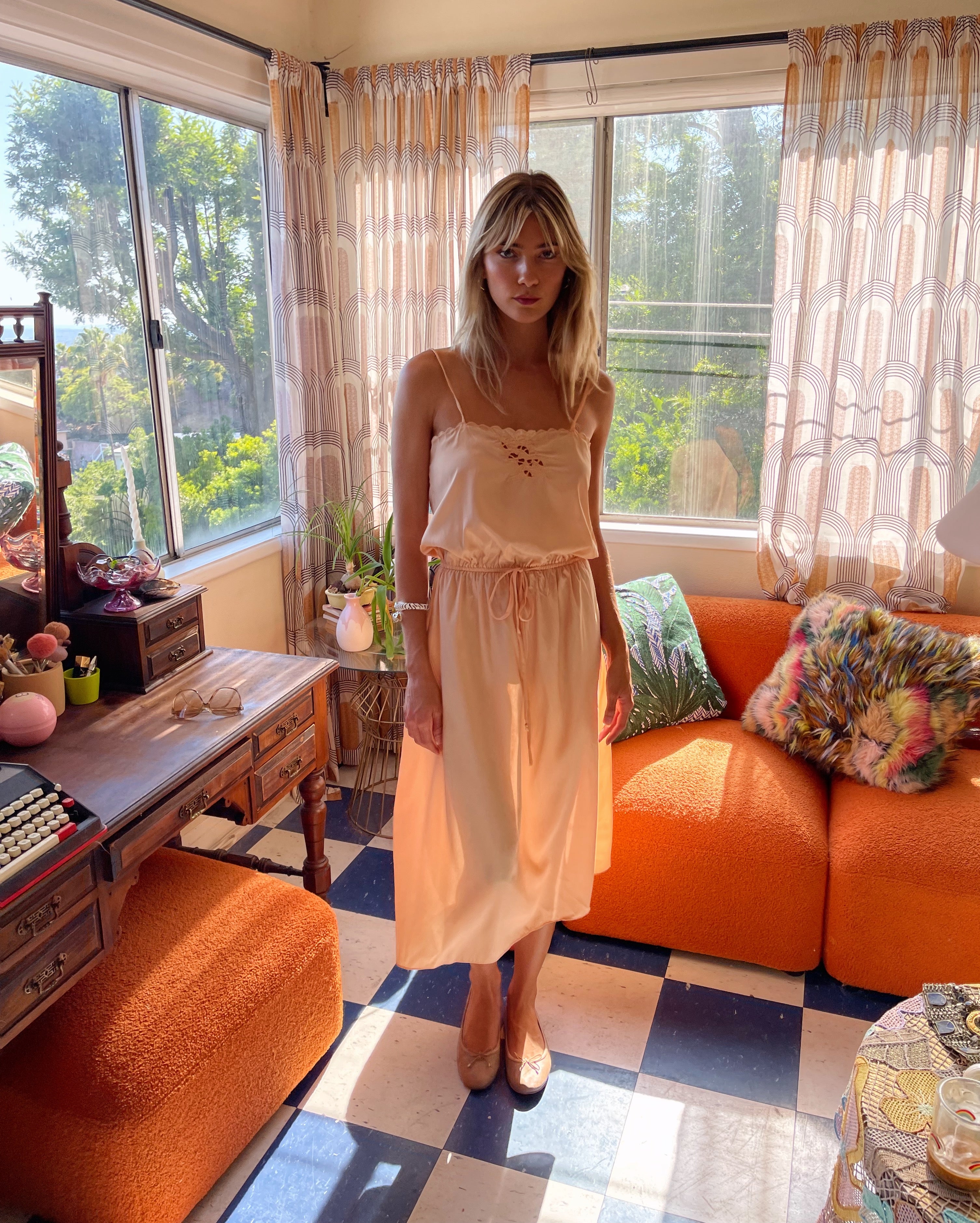 30s Vintage Peach Midi Slip Nightie | Sheer Lace Dress Antique Boho Nightgown VTG