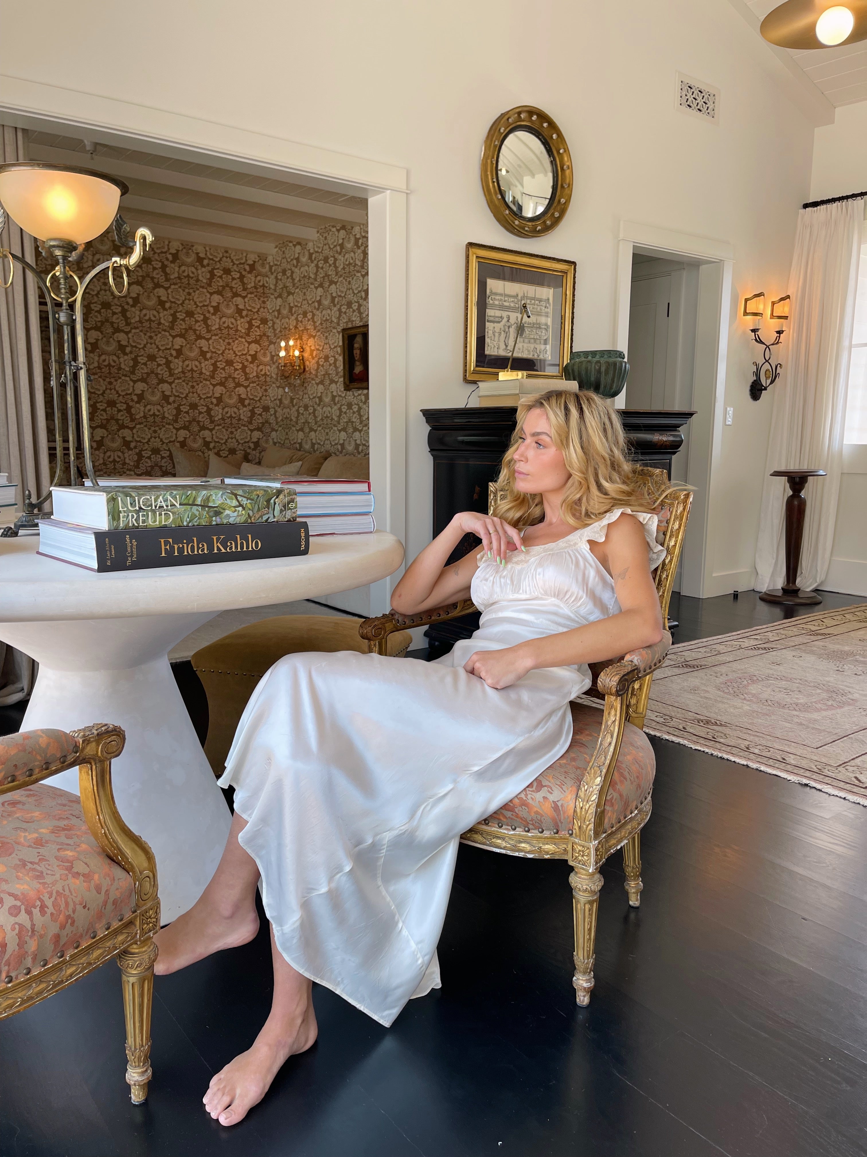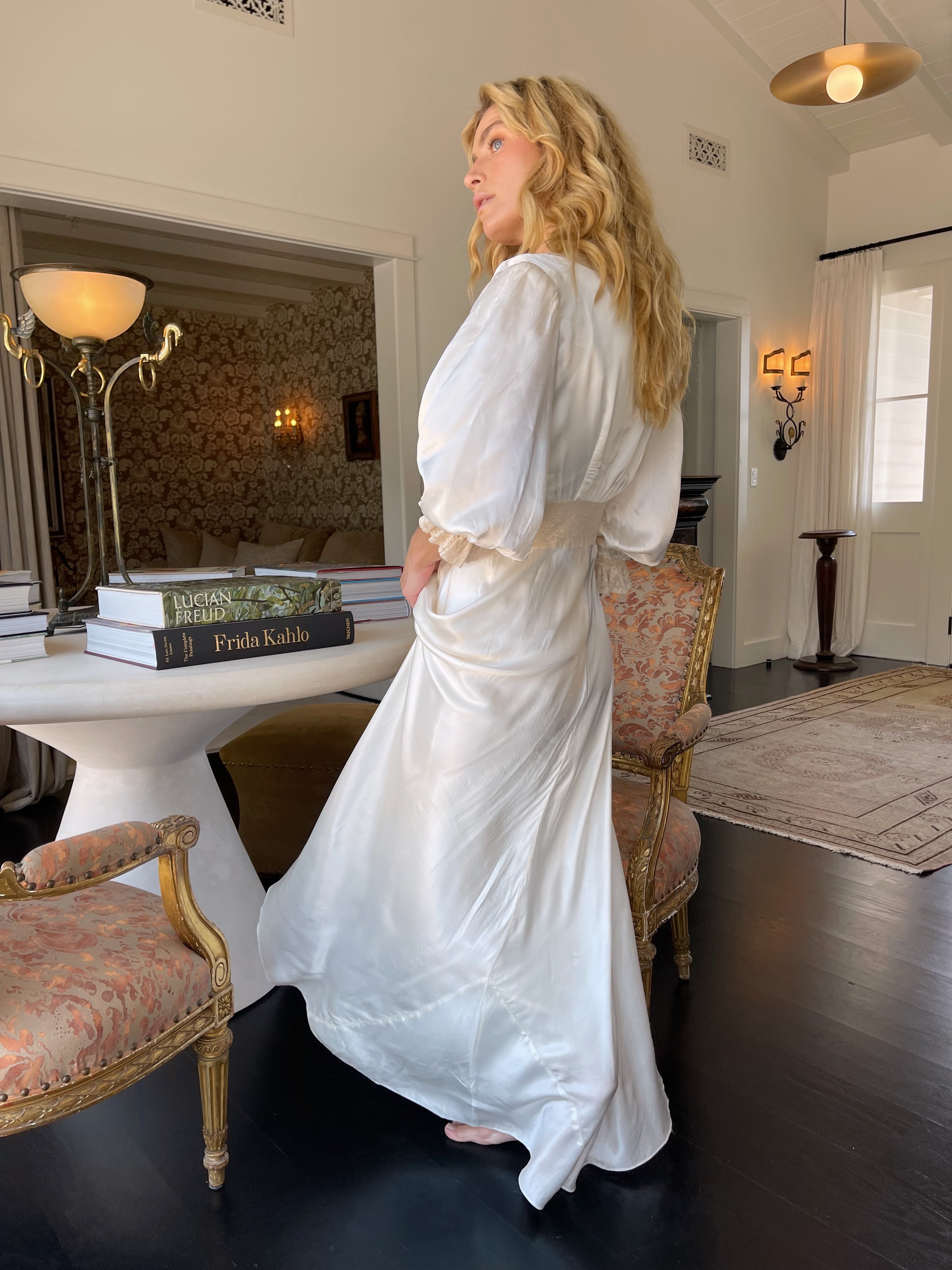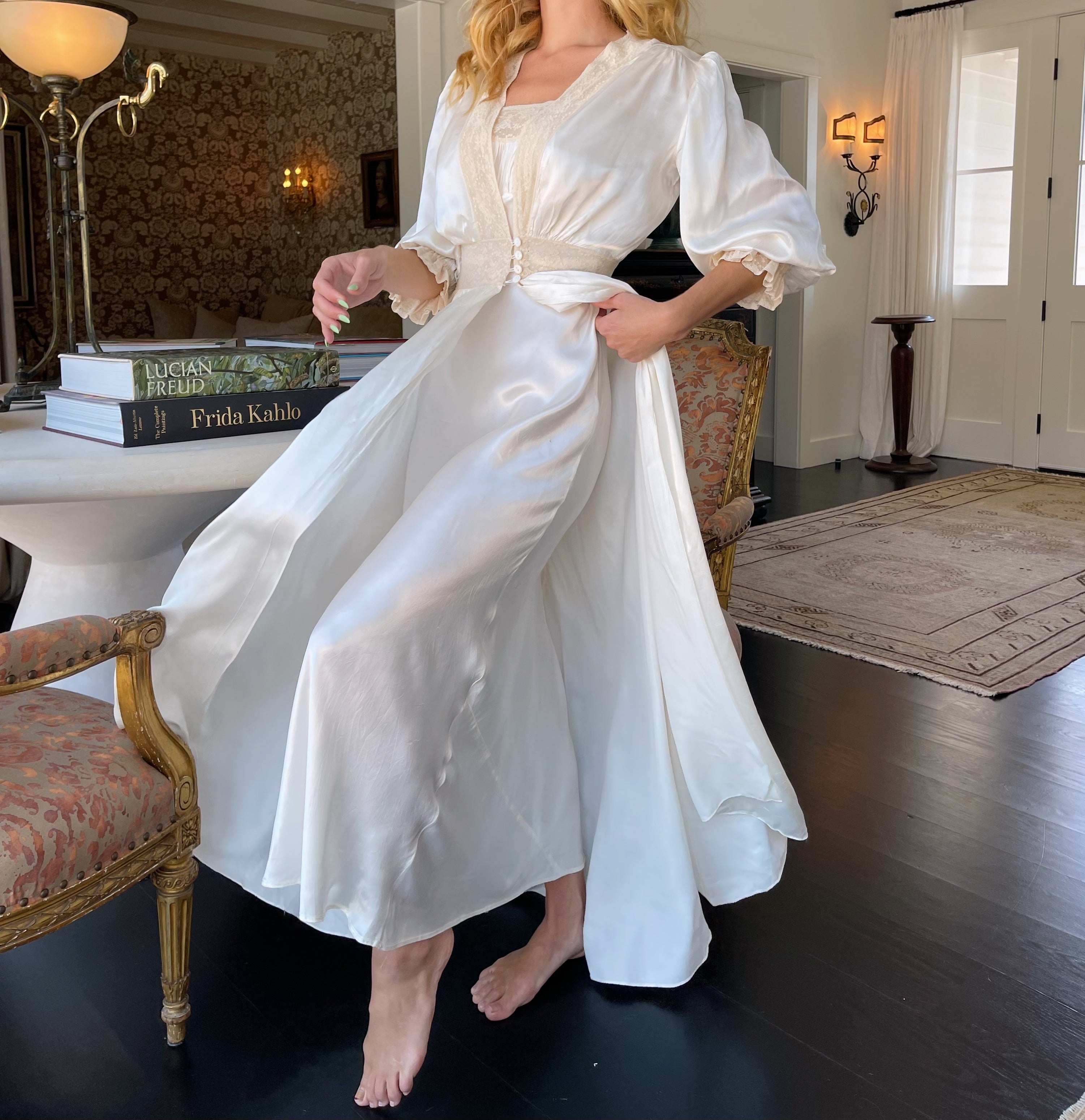 Our Radcliffe peignoir 1930s set features an ivory satin slip gown with delicate lace trim and matching duster — rare antique ensemble perfect for bridal dressing, all chic bridal moments and guest attire for the wedding of an enemy.