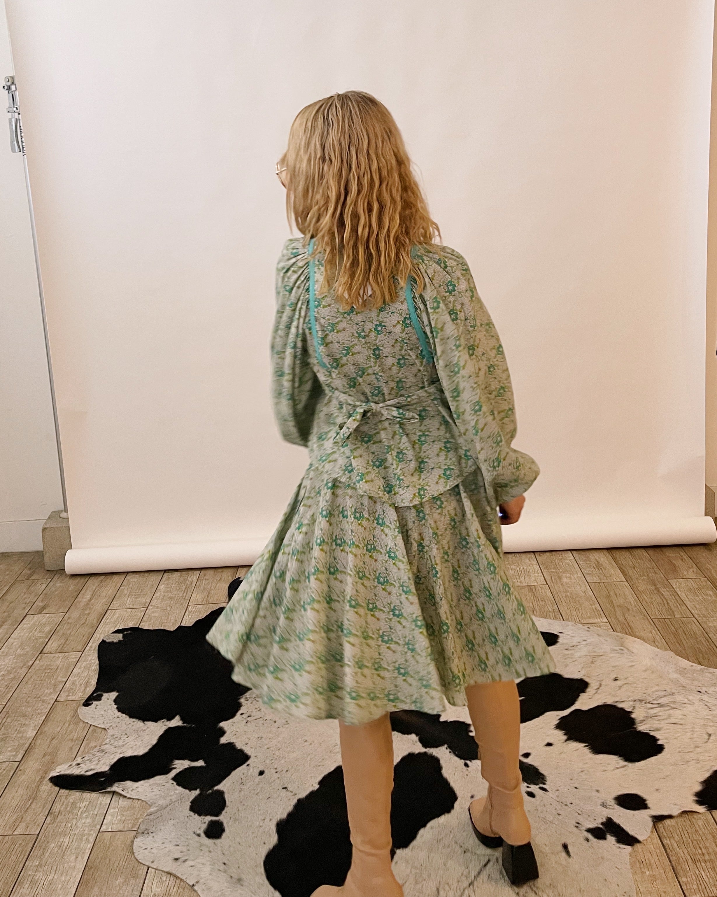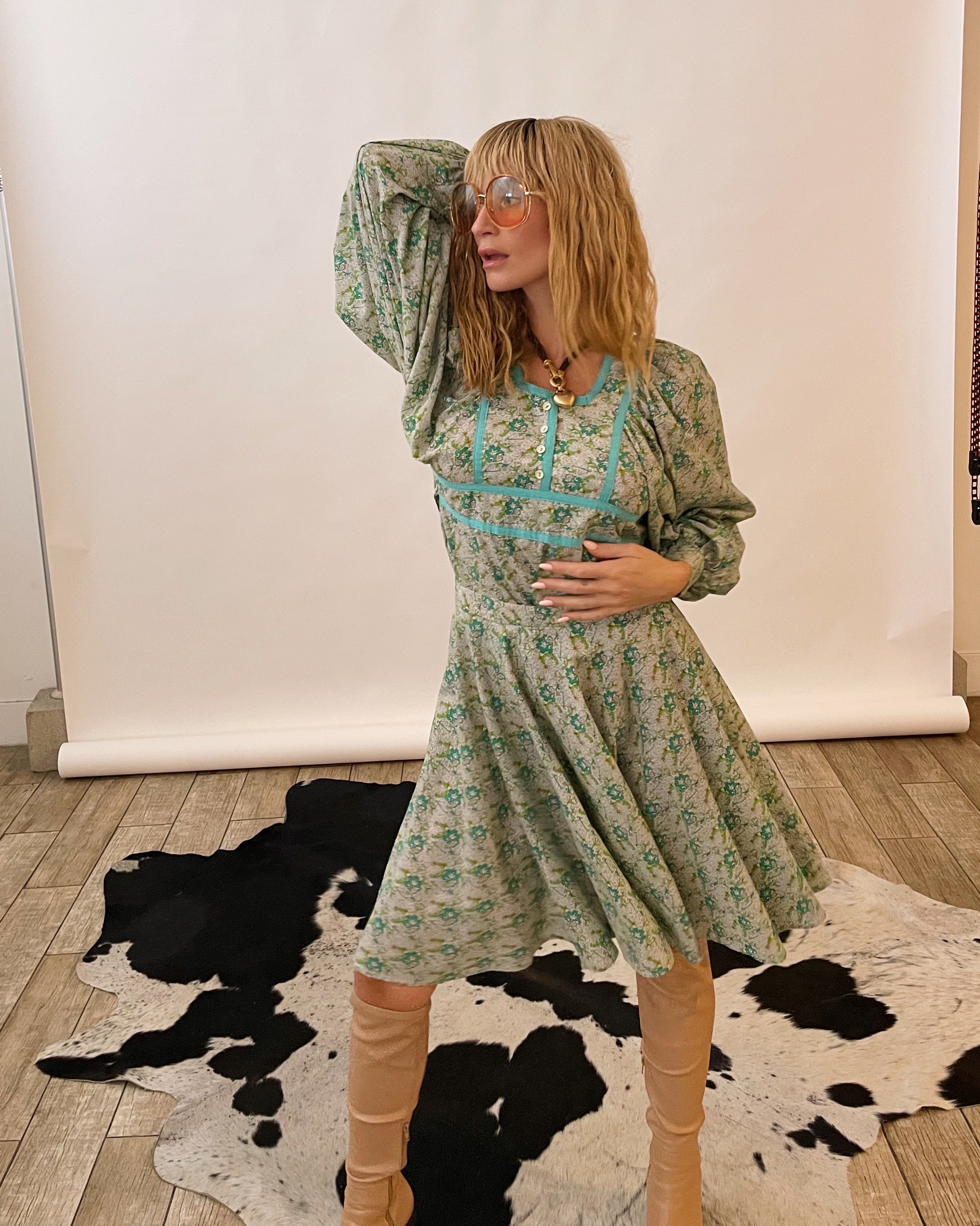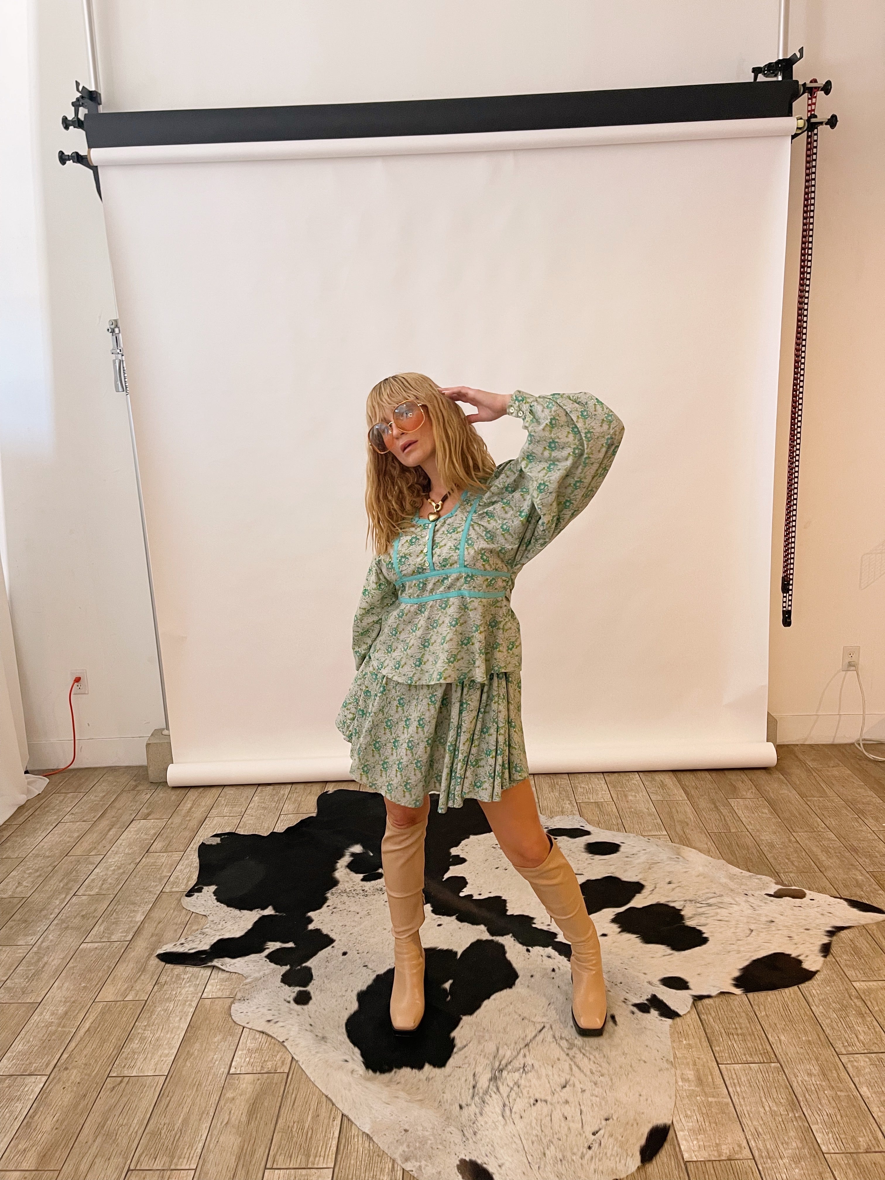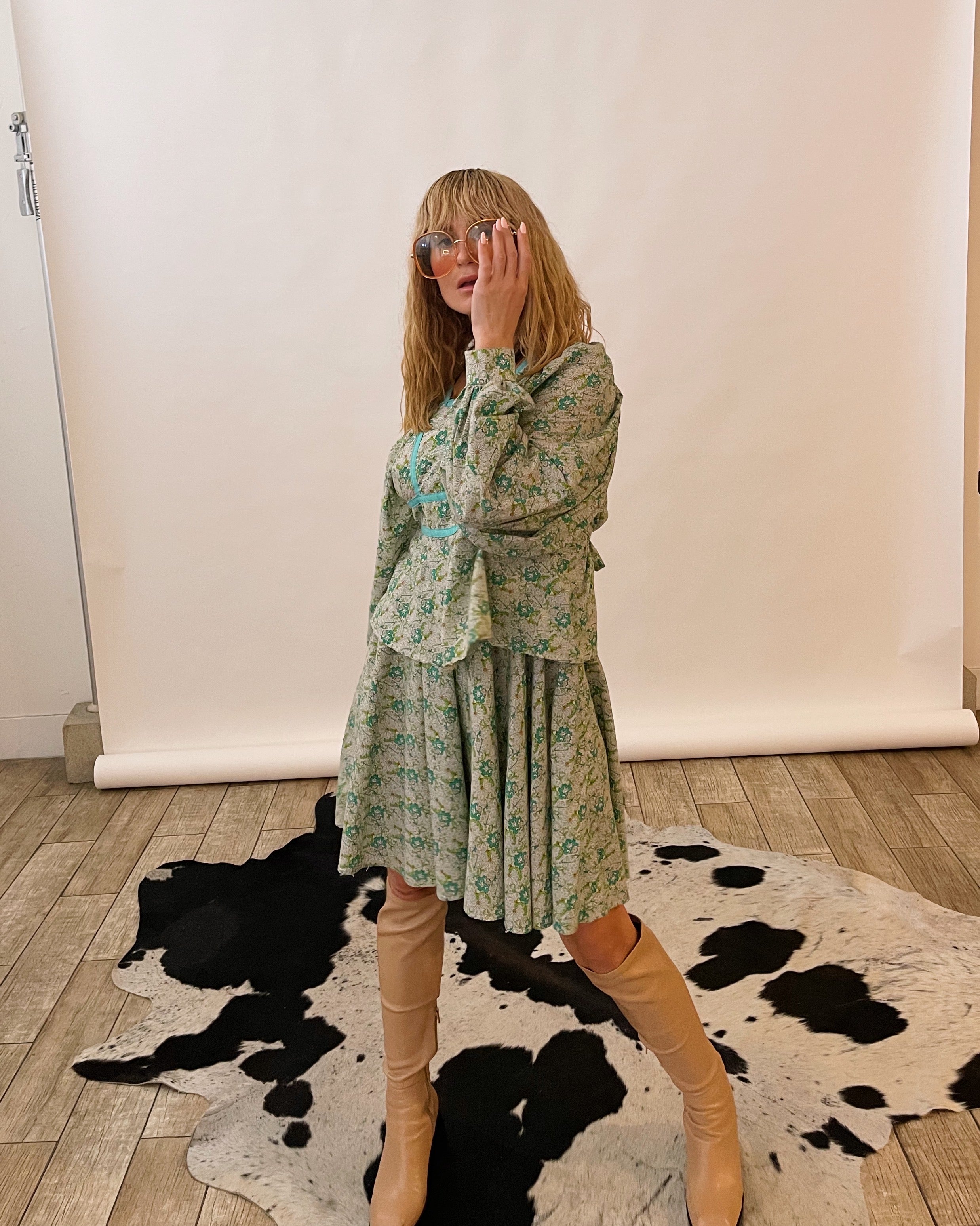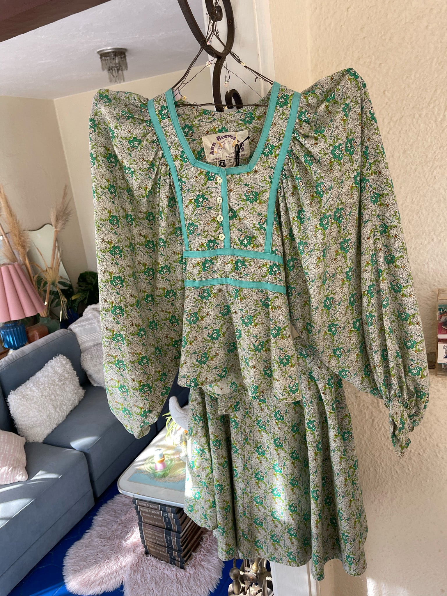 70s daydream — soft mint florals, cloud-sleeve drama, and a twirl-happy skirt that feels straight out of a countryside romance. This rare Ann Reeves set brings all the whimsical, prairie-girl magic with a perfectly structured, London-made twist.