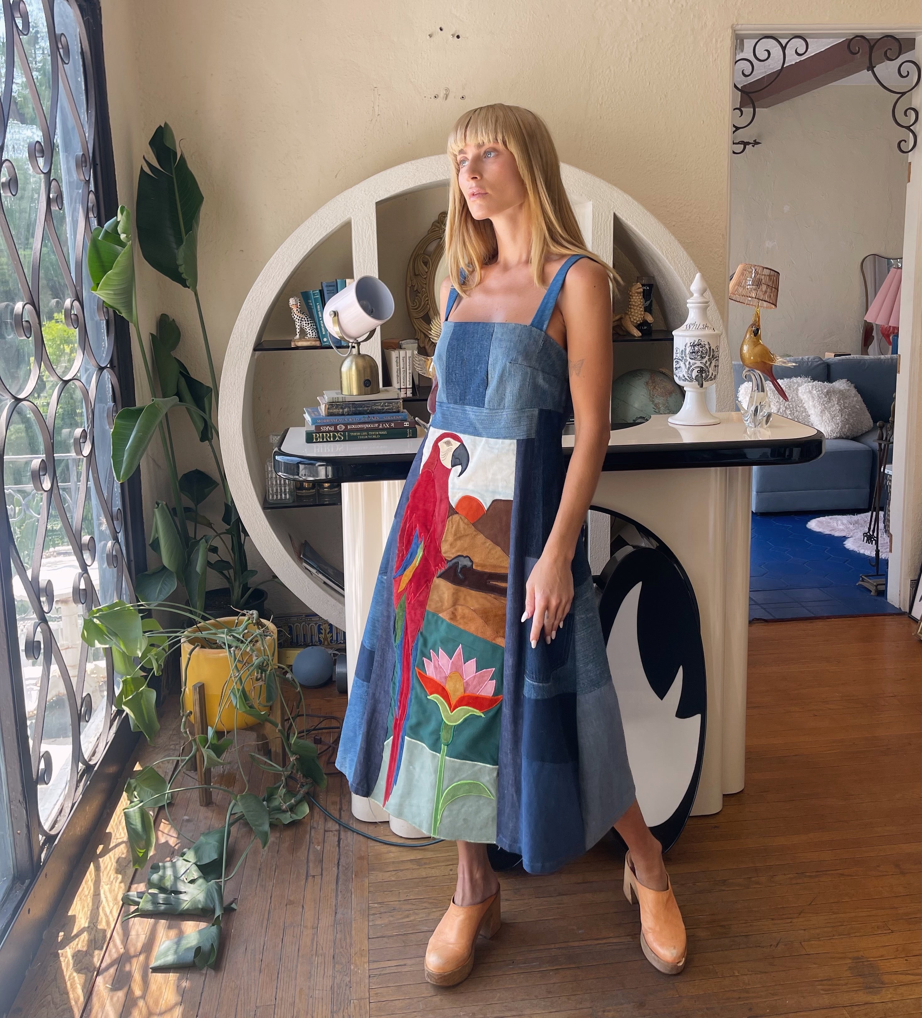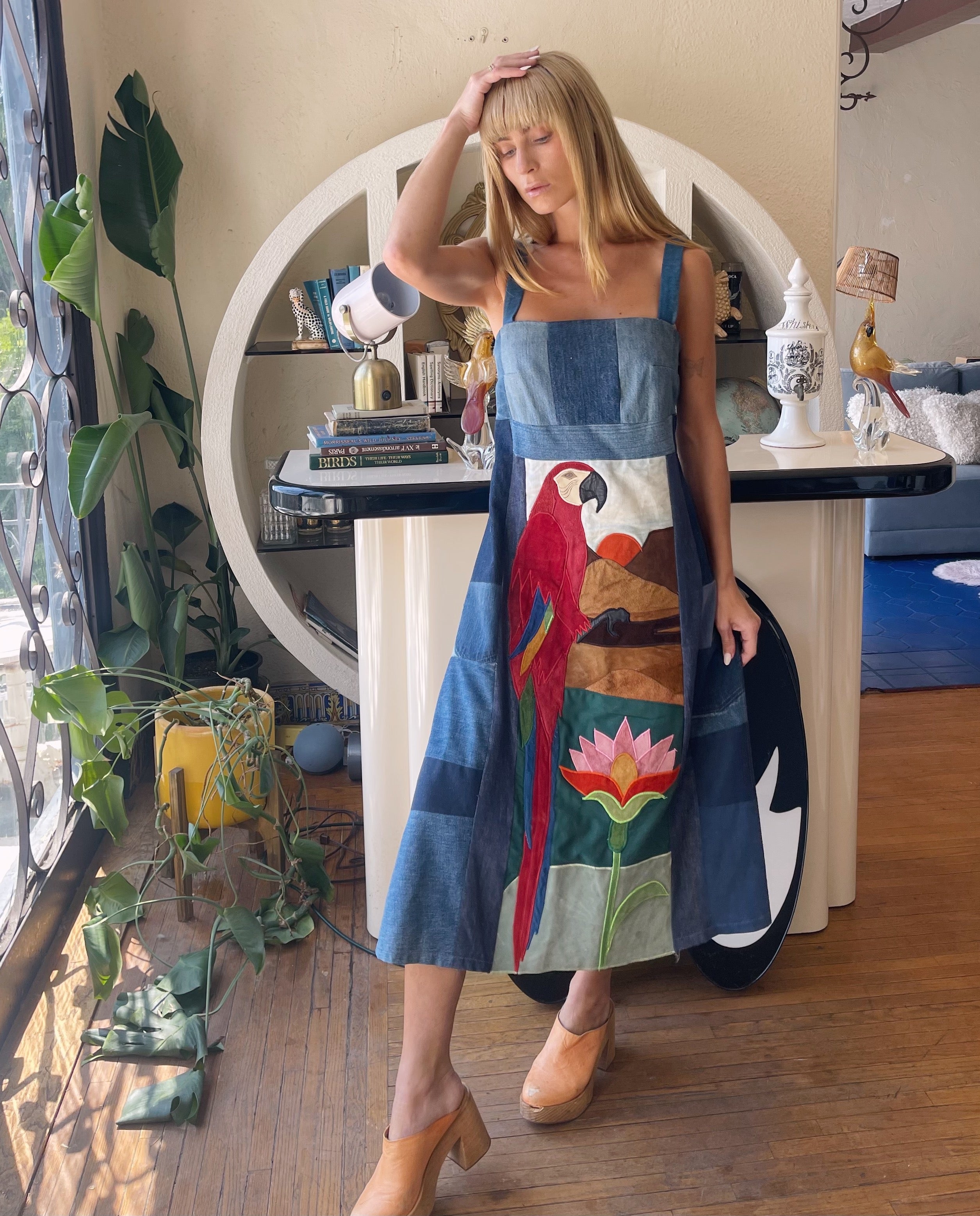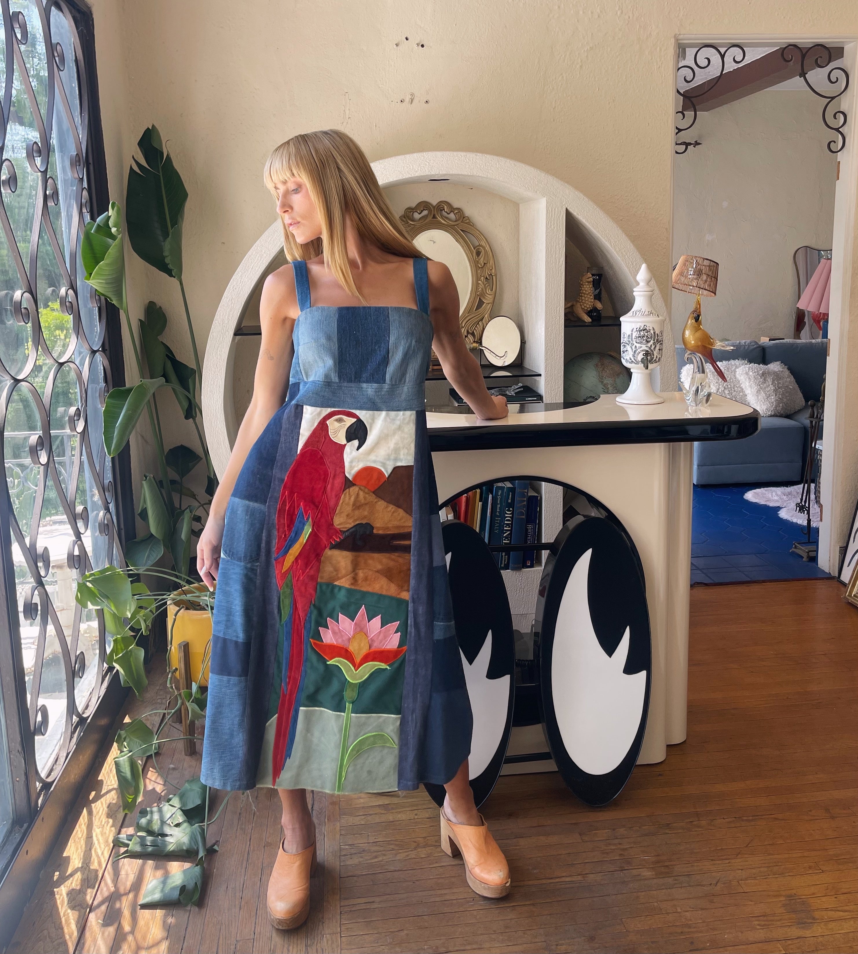 One-of-a-kind 1970s art-to-wear denim dress featuring a hand-stitched tropical parrot and desert scene — part sculpture, part statement, all wearable art.
