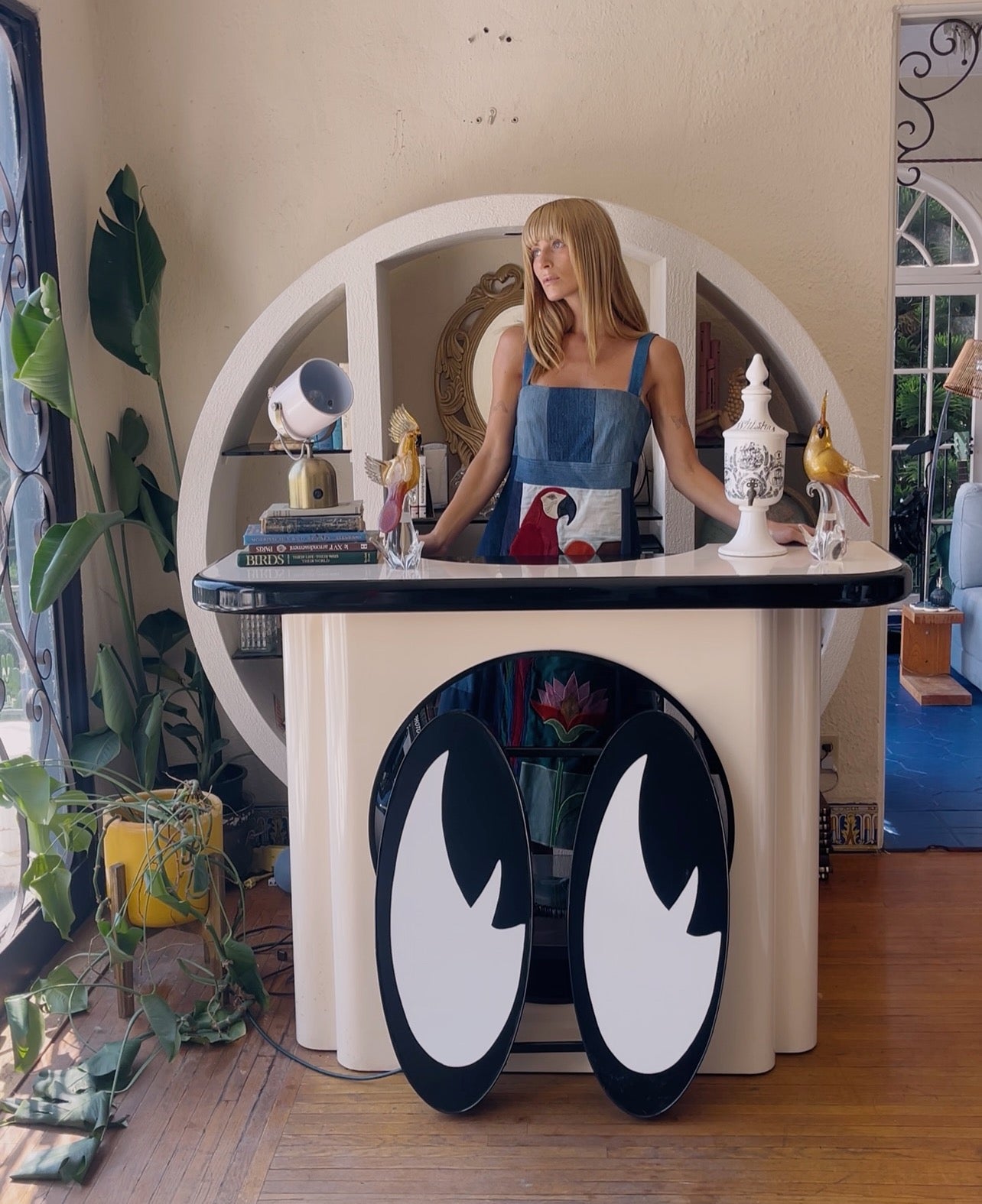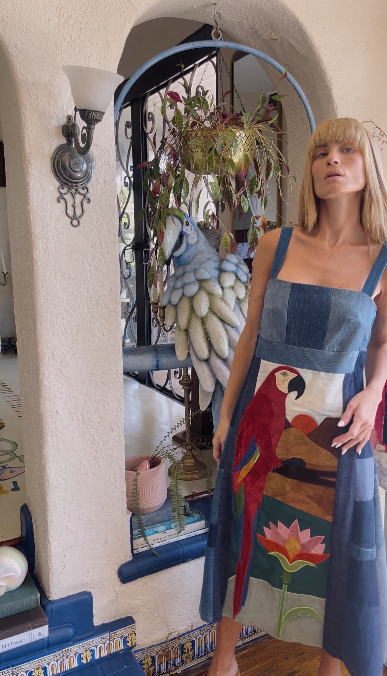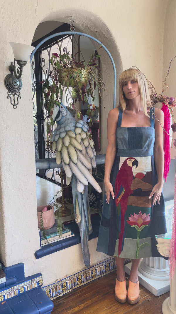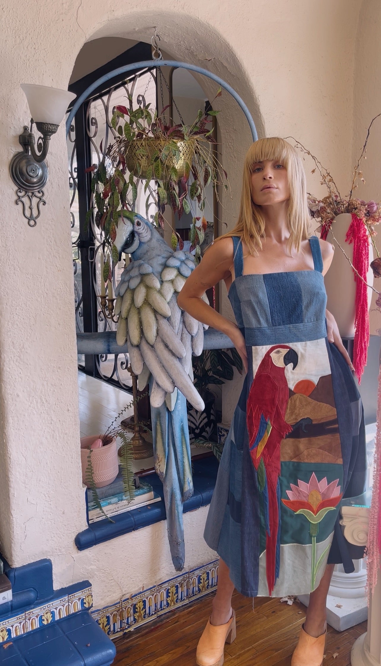 One-of-a-kind 1970s art-to-wear denim dress featuring a hand-stitched tropical parrot and desert scene — part sculpture, part statement, all wearable art.