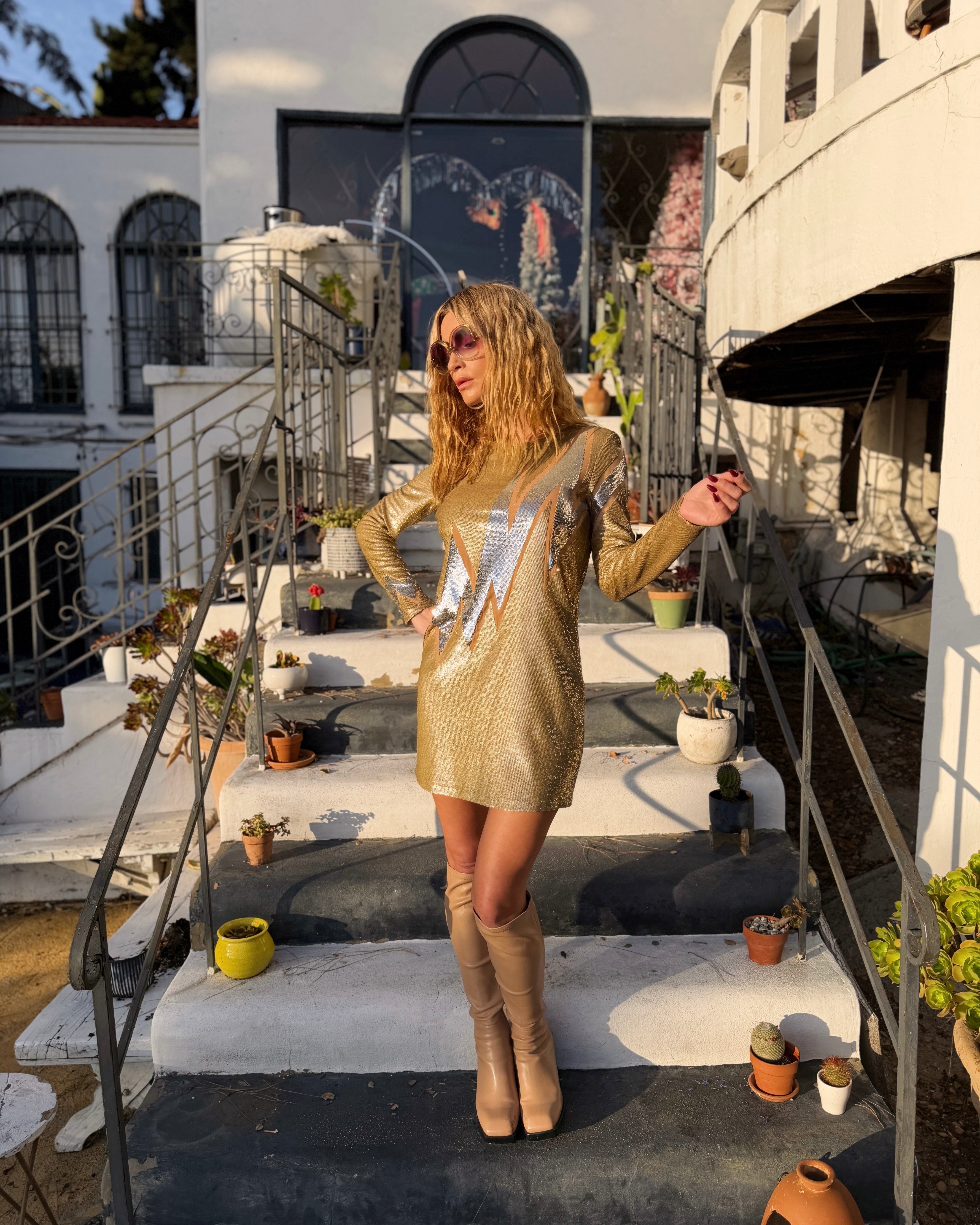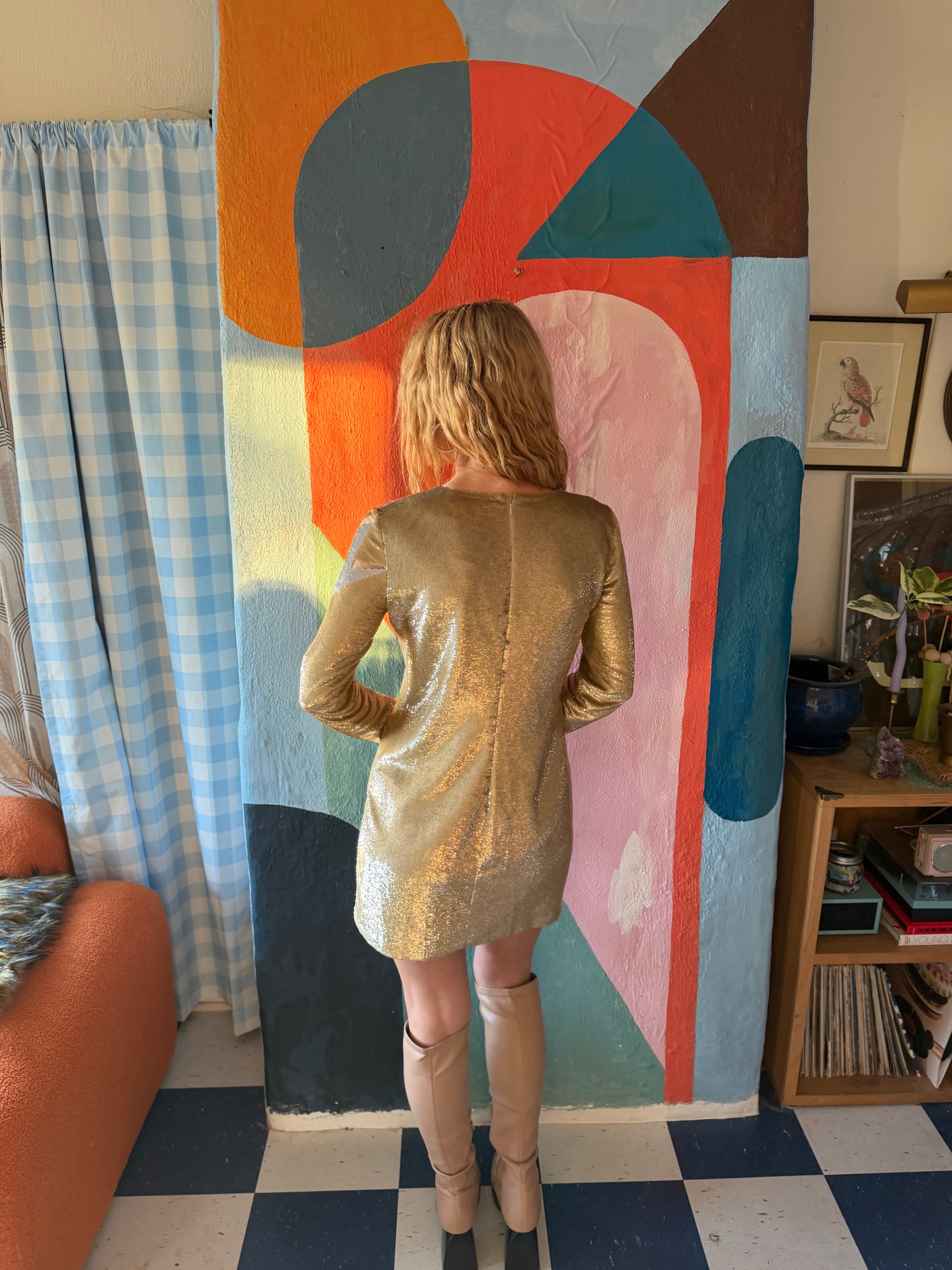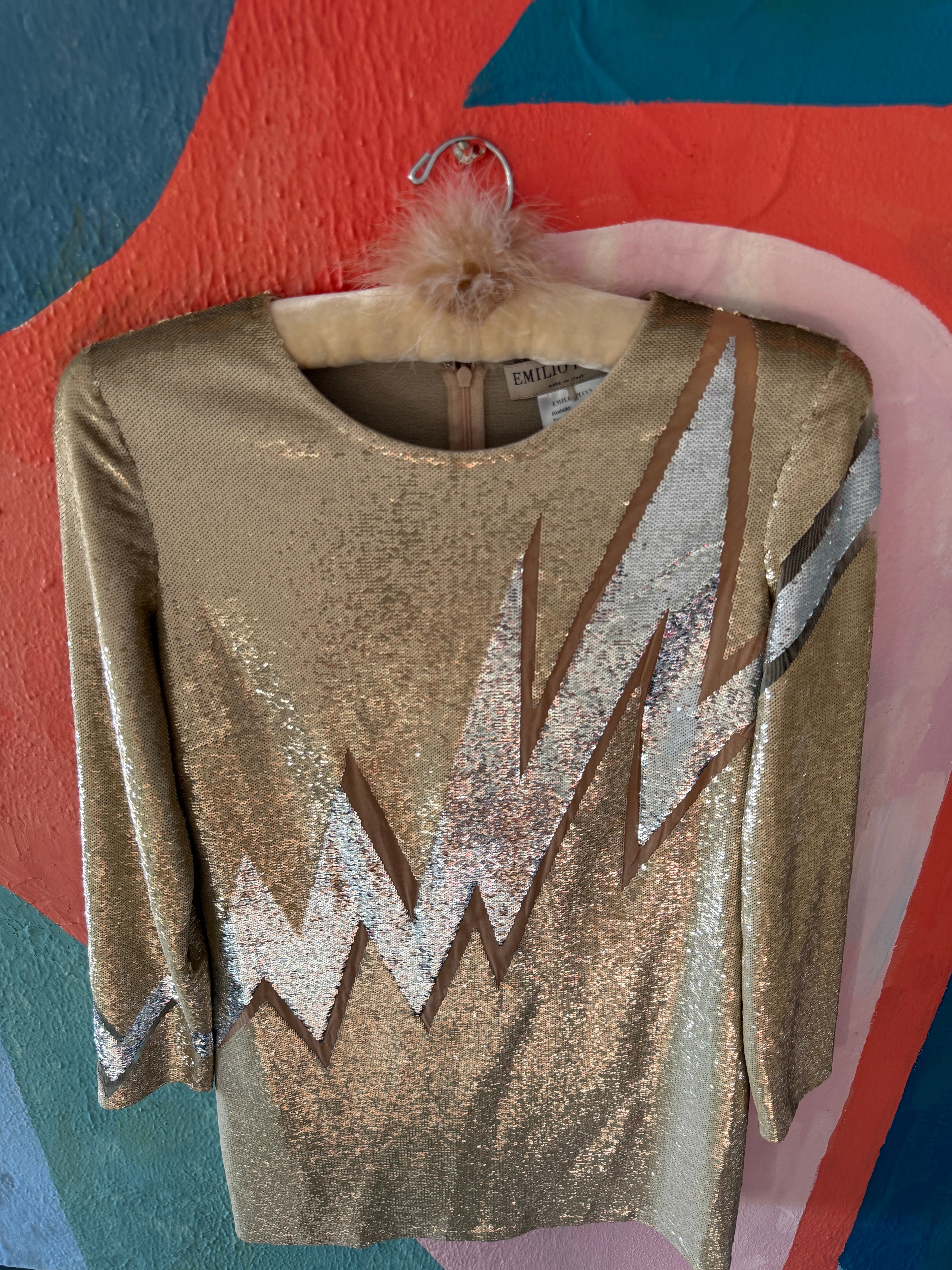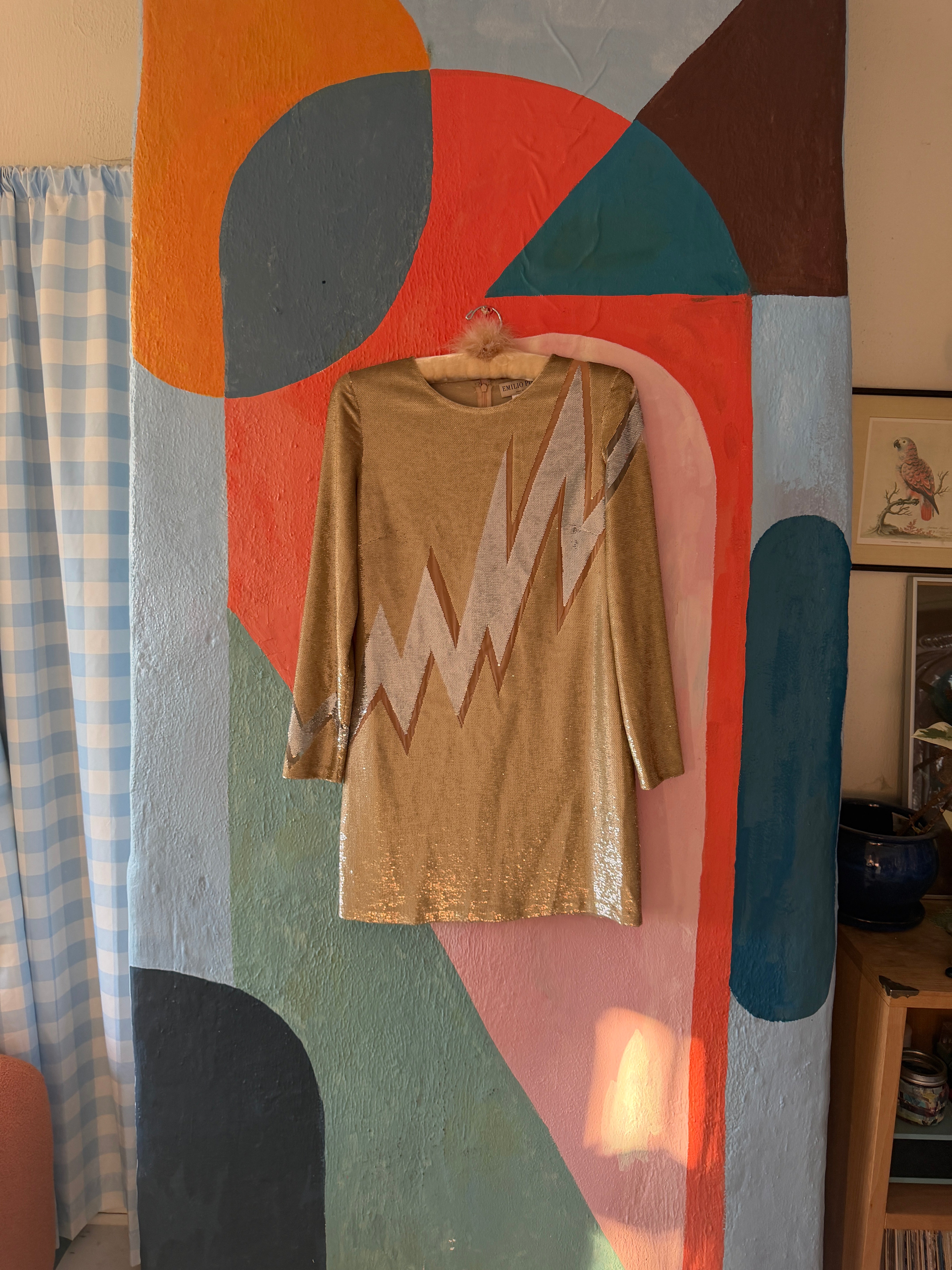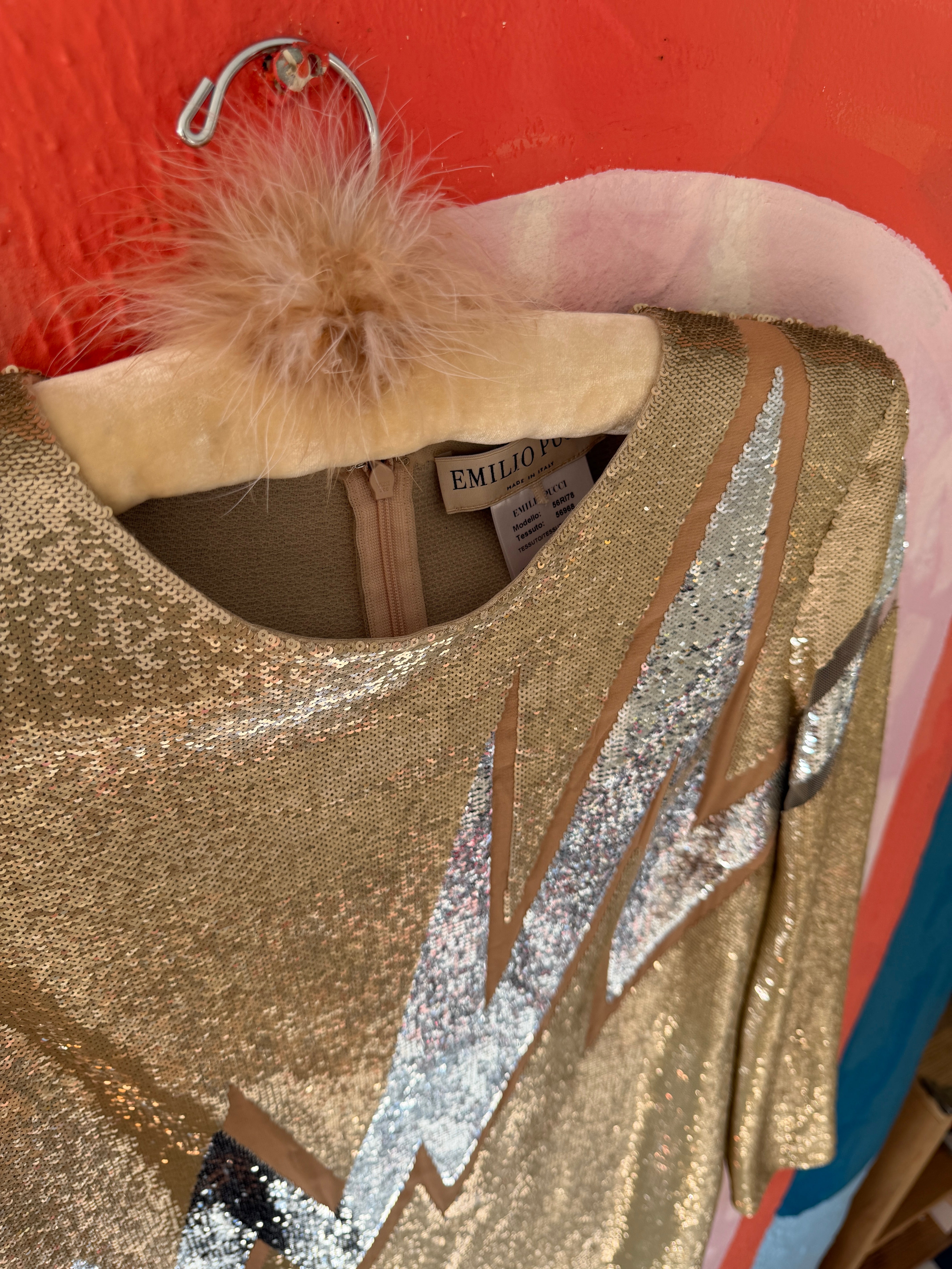 A show-stopping late 1960s–early 1970s Emilio Pucci mini dress, crafted in shimmering metallic gold with bold zig-zag lightning motifs that feel equal parts mod, space-age, and unapologetically glamorous.