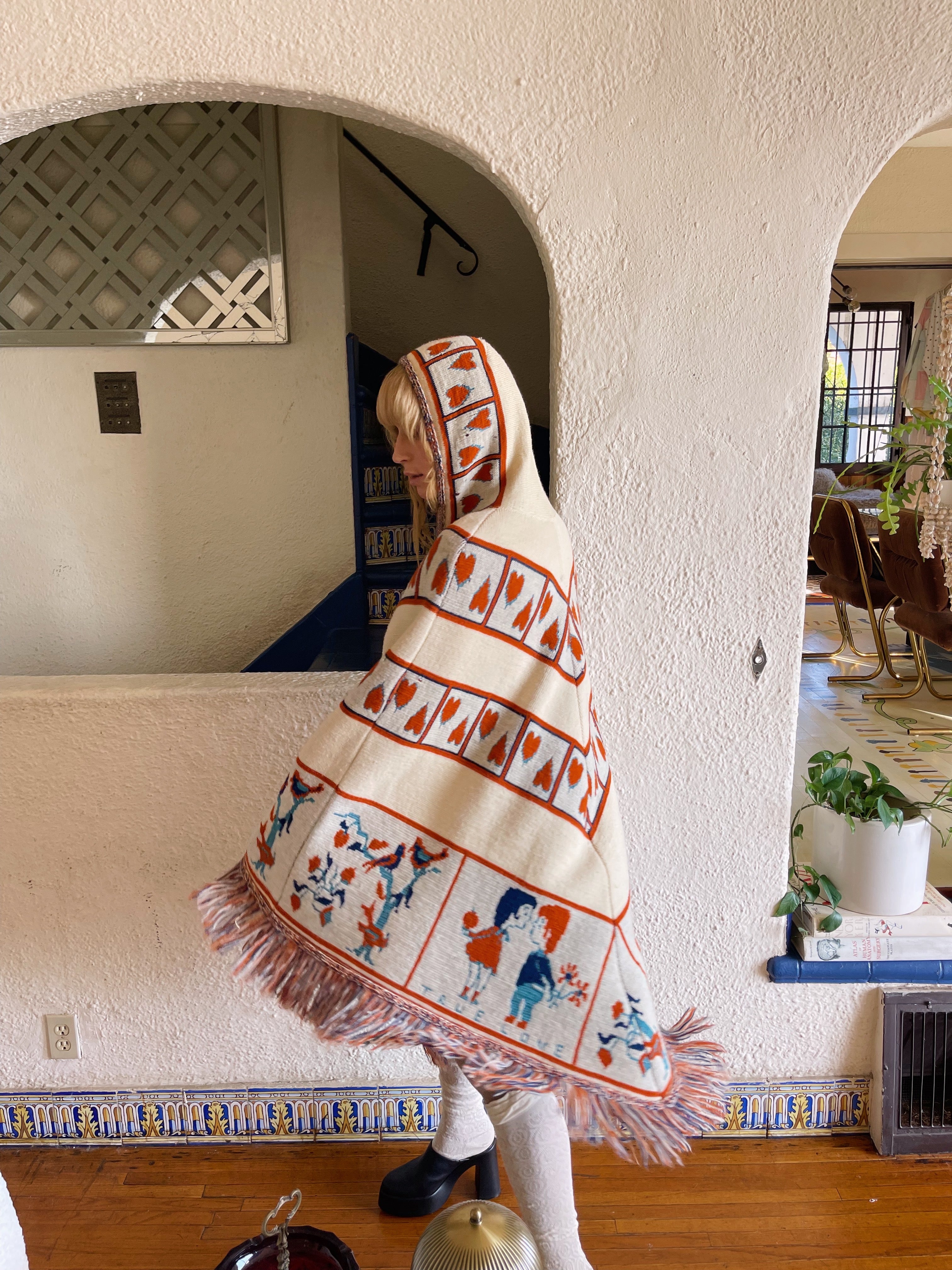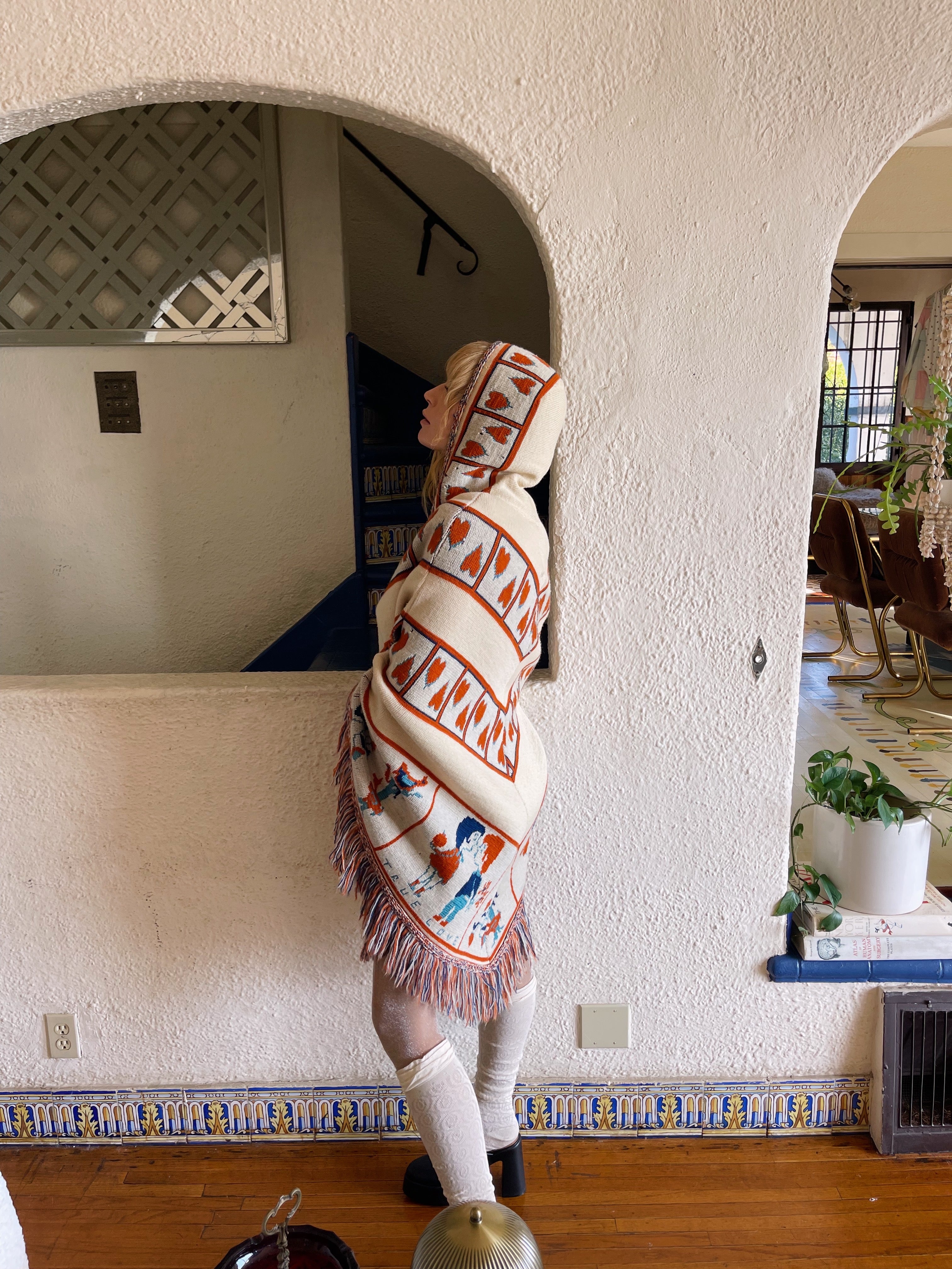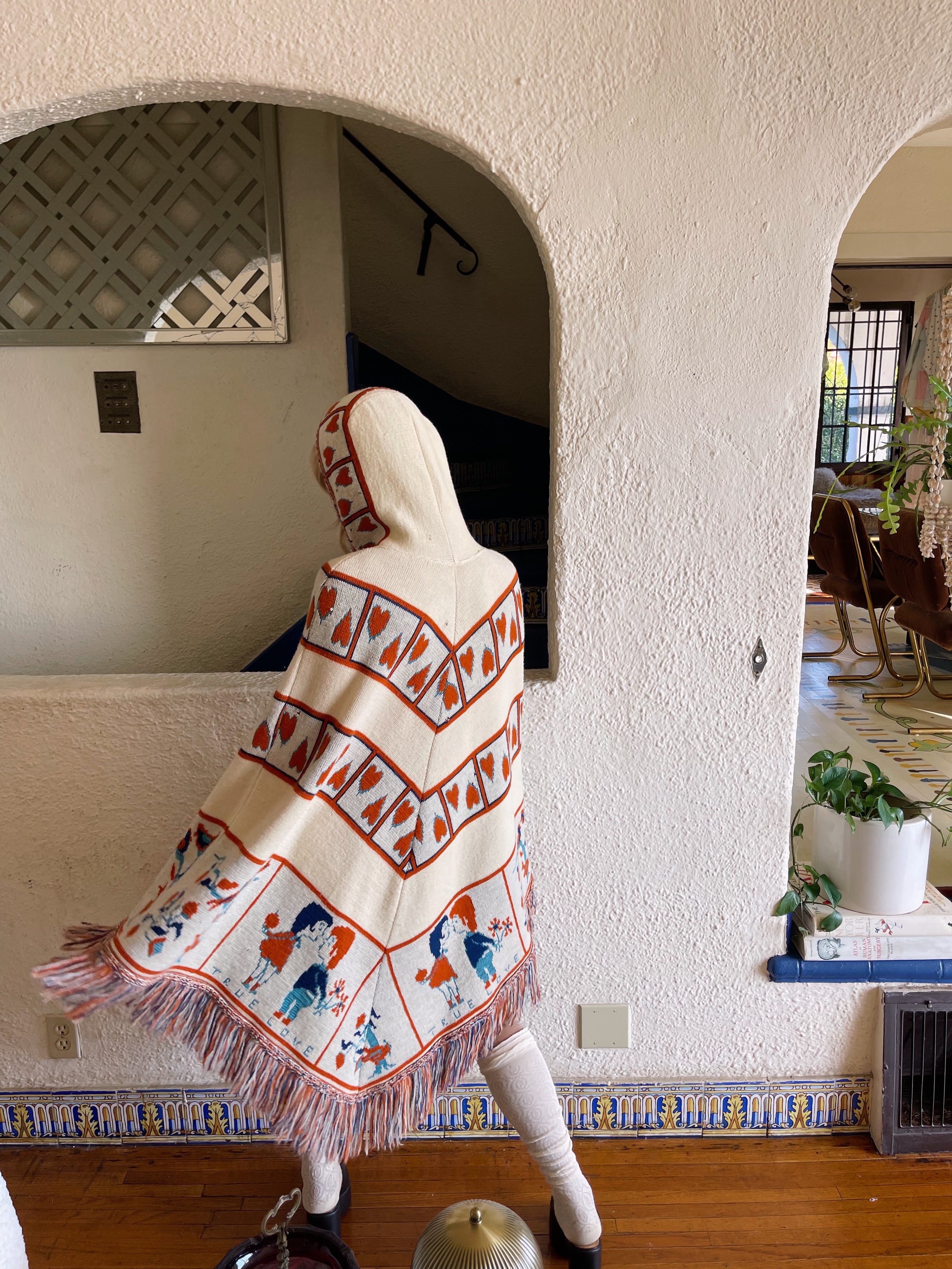 Rare 1970s Sabra knit masterpiece — a fringed hooded poncho featuring whimsical “Deck of Hearts” intarsia lovers in terracotta and denim blue. Part cottage-core fairytale, part tarot-deck fantasy — this piece turns vintage folklore into wearable art. Chloé-meets-hippie romantic.