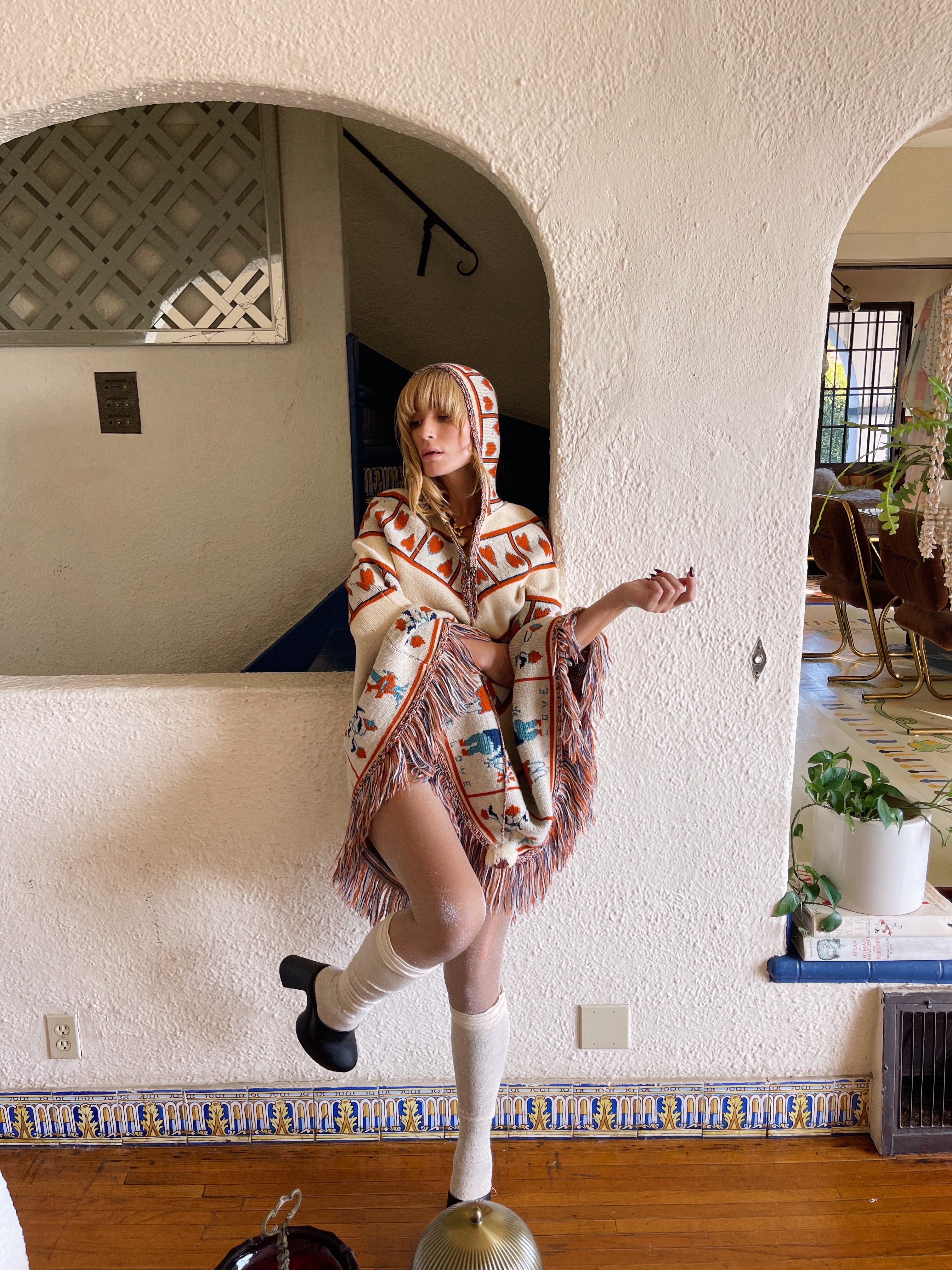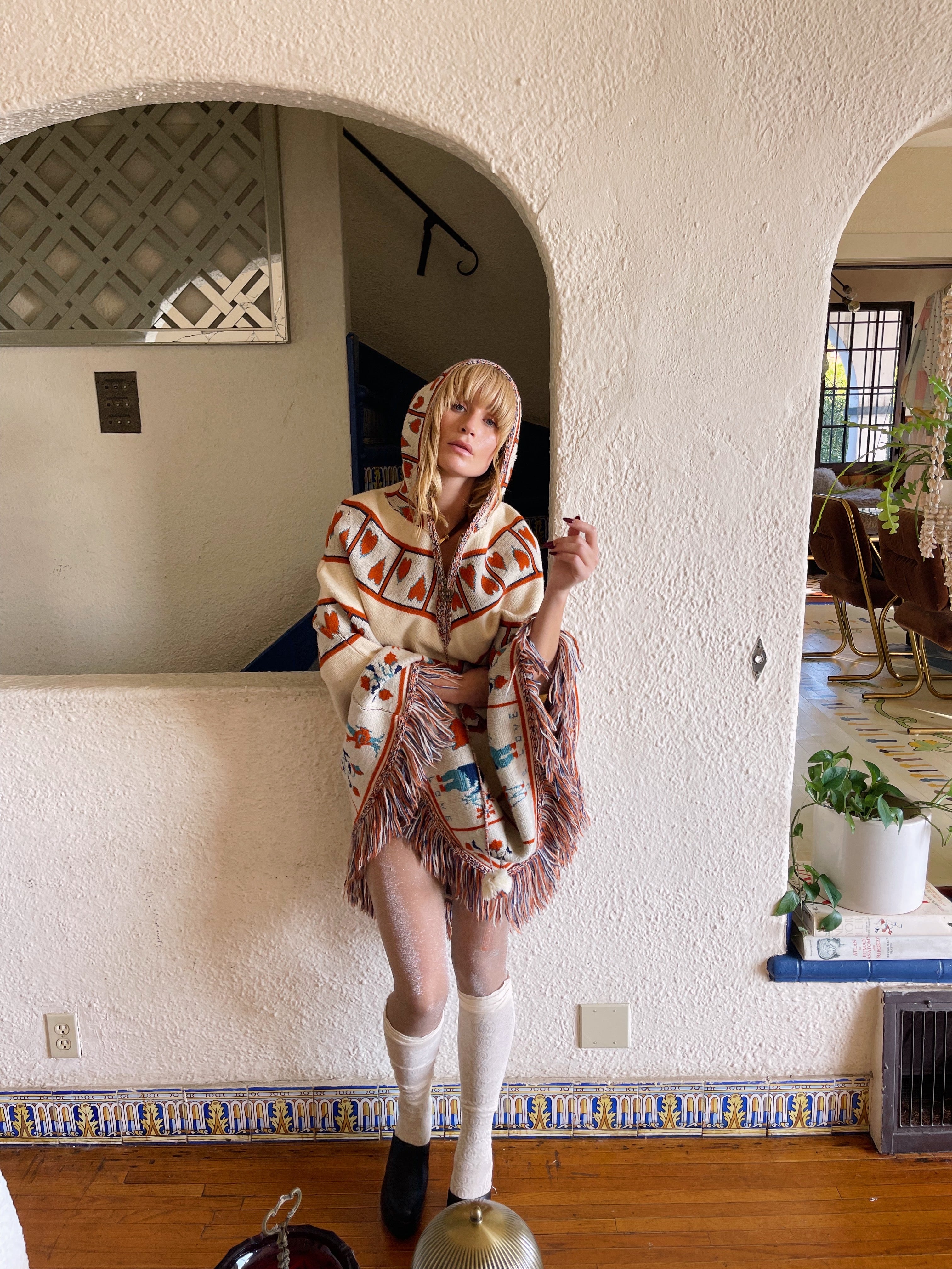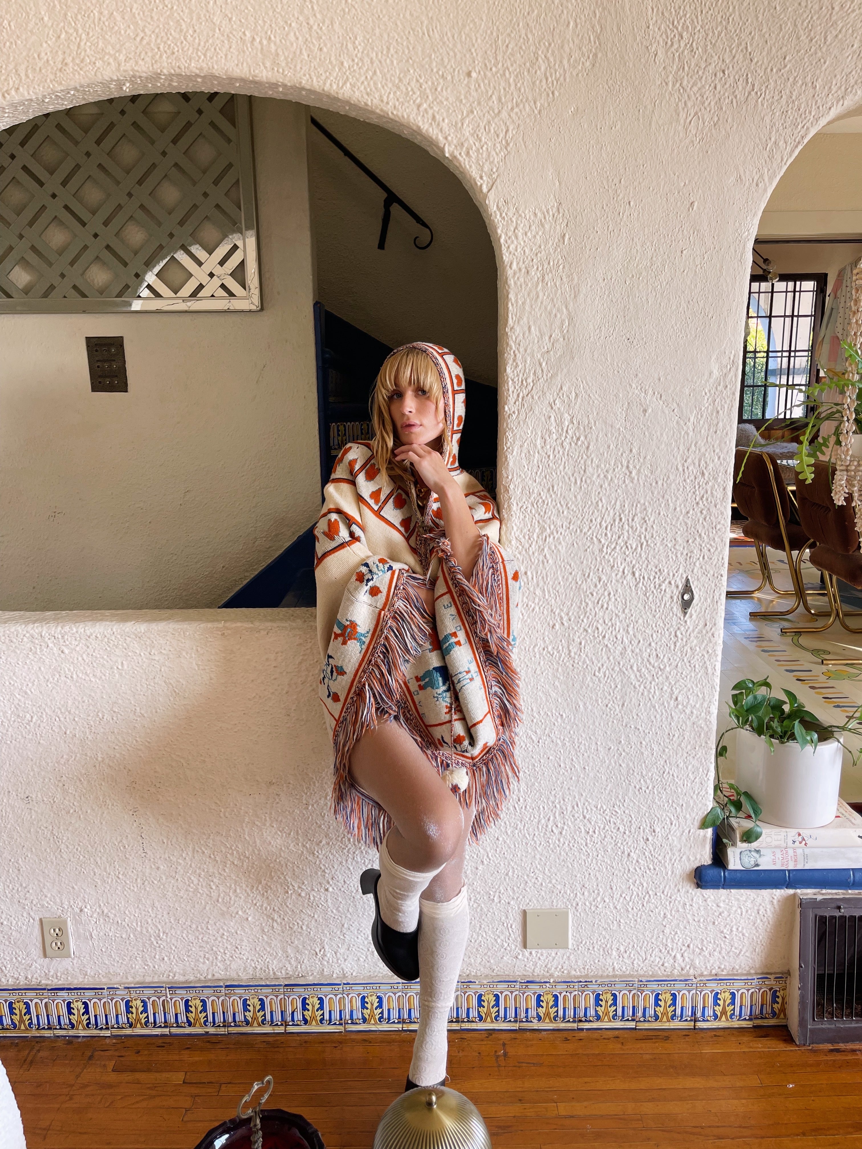 Rare 1970s Sabra knit masterpiece — a fringed hooded poncho featuring whimsical “Deck of Hearts” intarsia lovers in terracotta and denim blue. Part cottage-core fairytale, part tarot-deck fantasy — this piece turns vintage folklore into wearable art. Chloé-meets-hippie romantic.