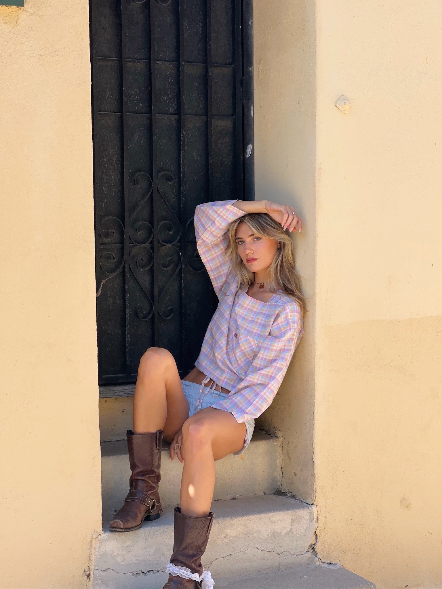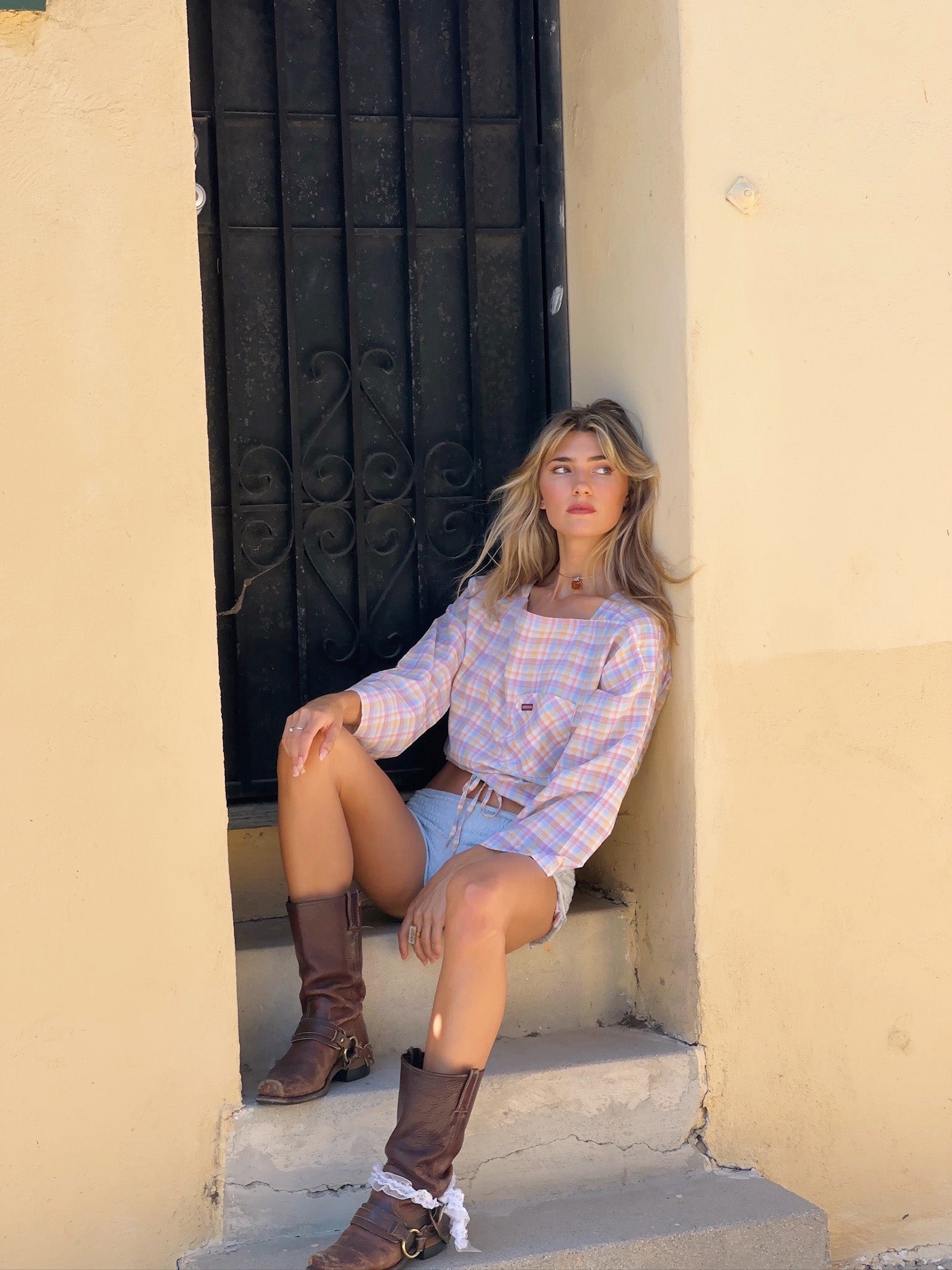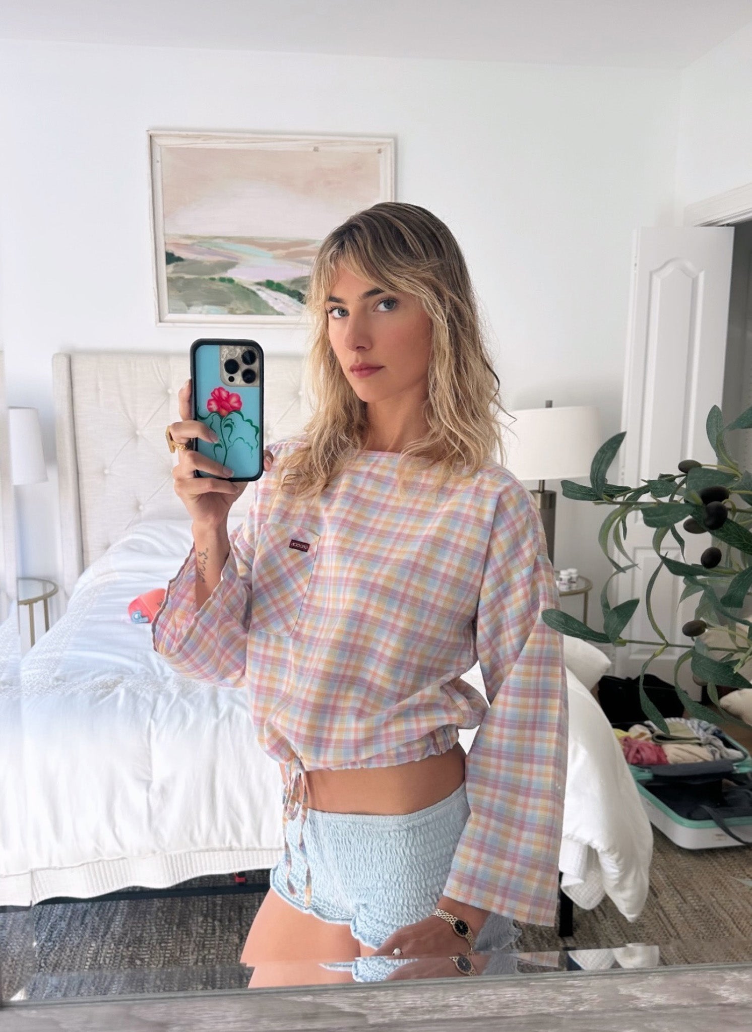 Dreamy 1970s Sasson pastel plaid top — a flirty cropped peasant blouse with soft bell sleeves, drawstring waist, and the perfect day date addition.