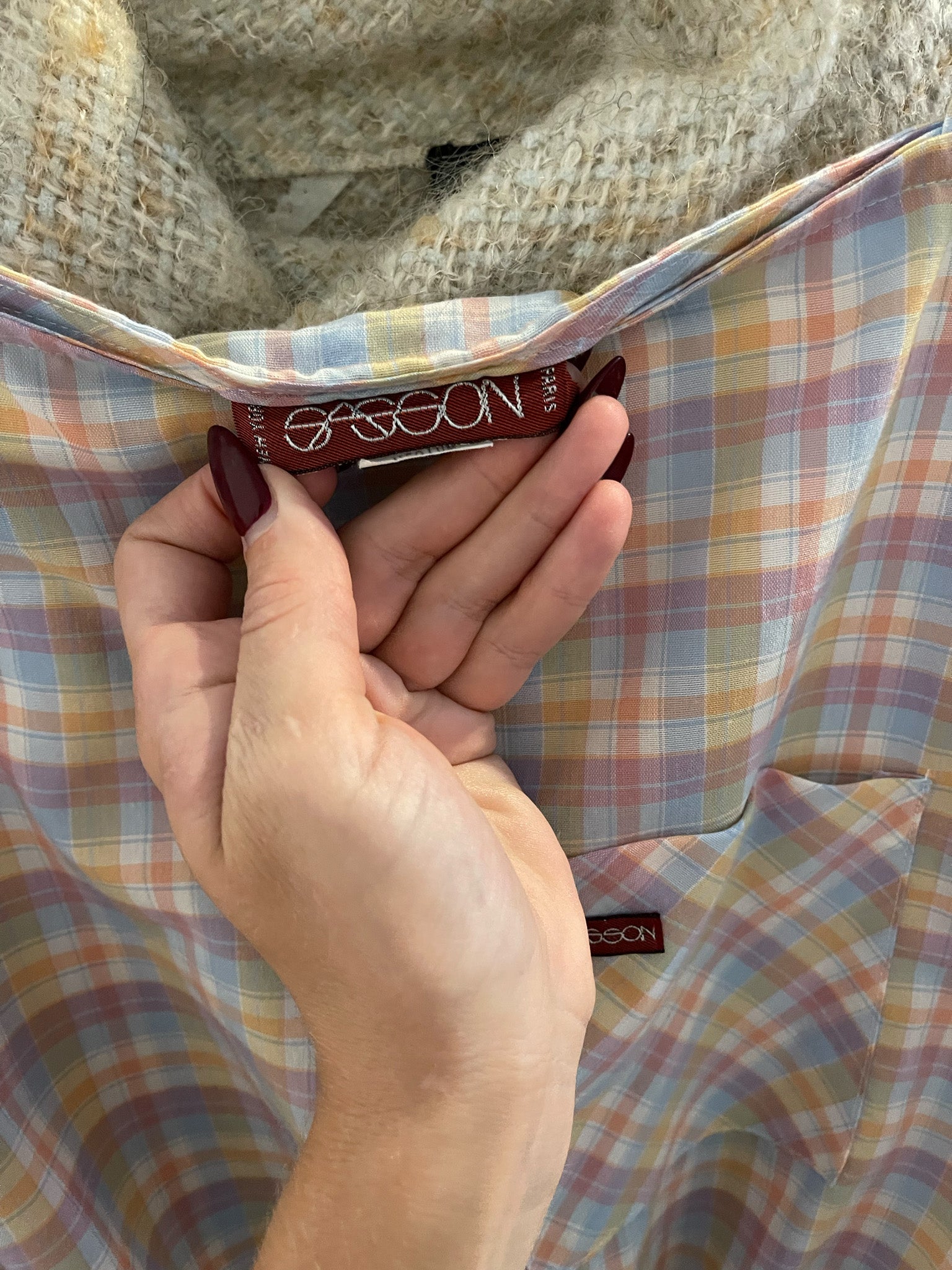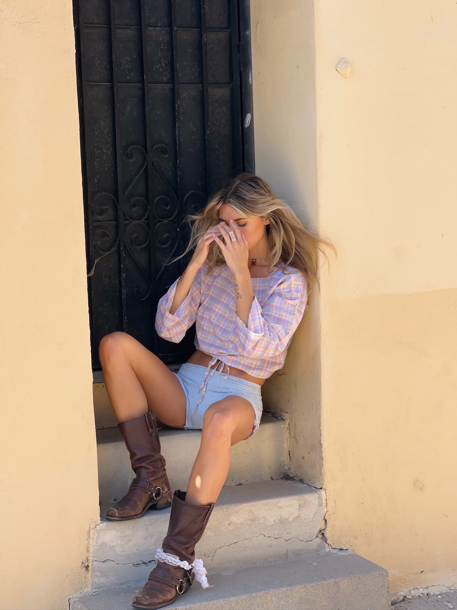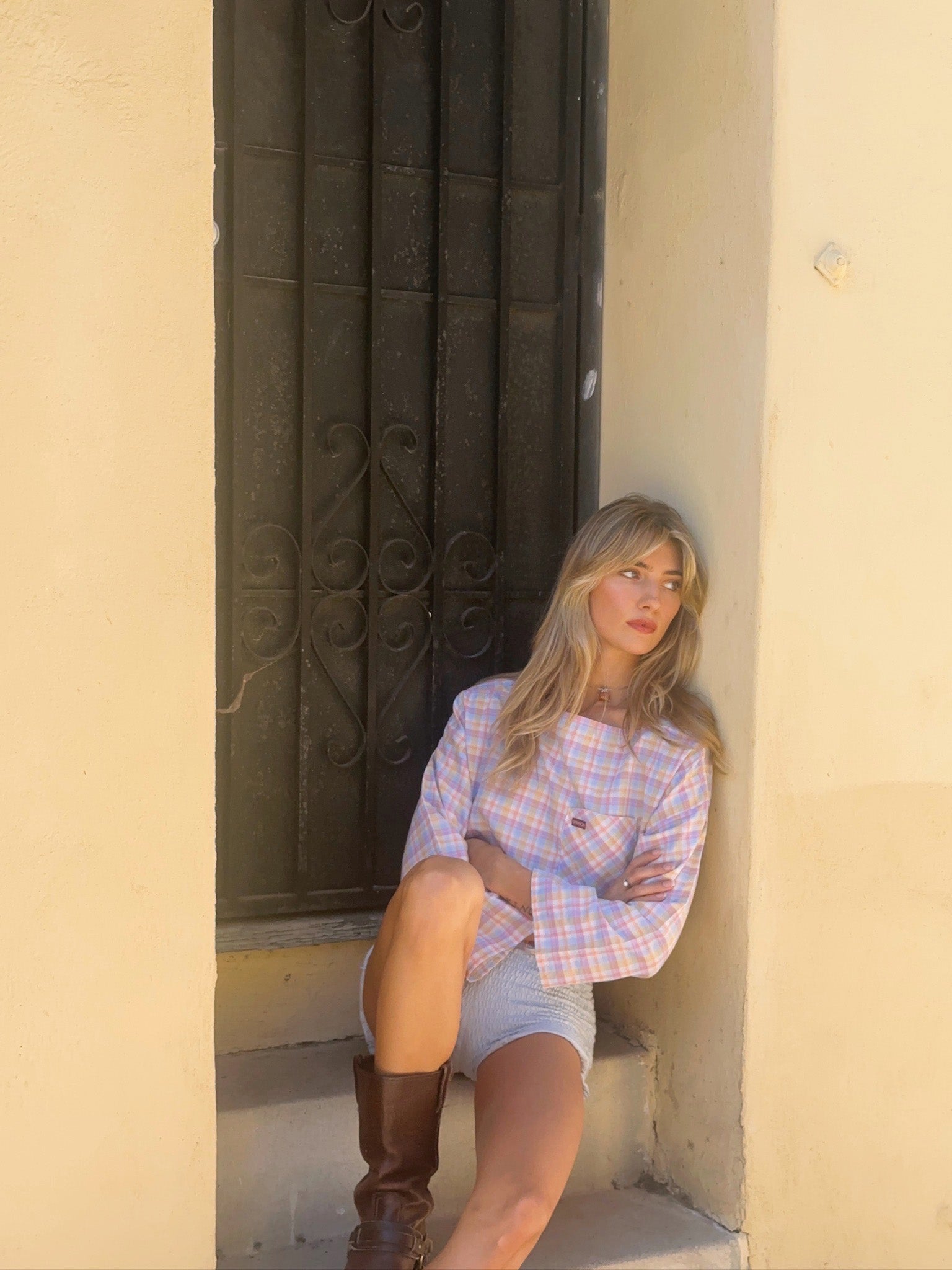Dreamy 1970s Sasson pastel plaid top — a flirty cropped peasant blouse with soft bell sleeves, drawstring waist, and the perfect day date addition.