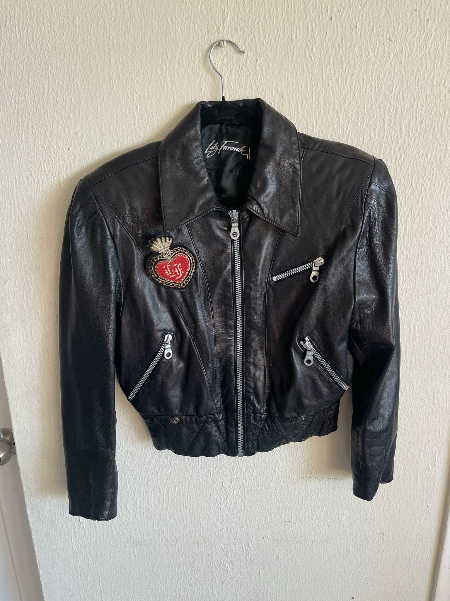 80s Vintage Lily Farouche Black Leather Moto Jacket | Studded Heart “Lily Forever” Embroidered Biker Jacket