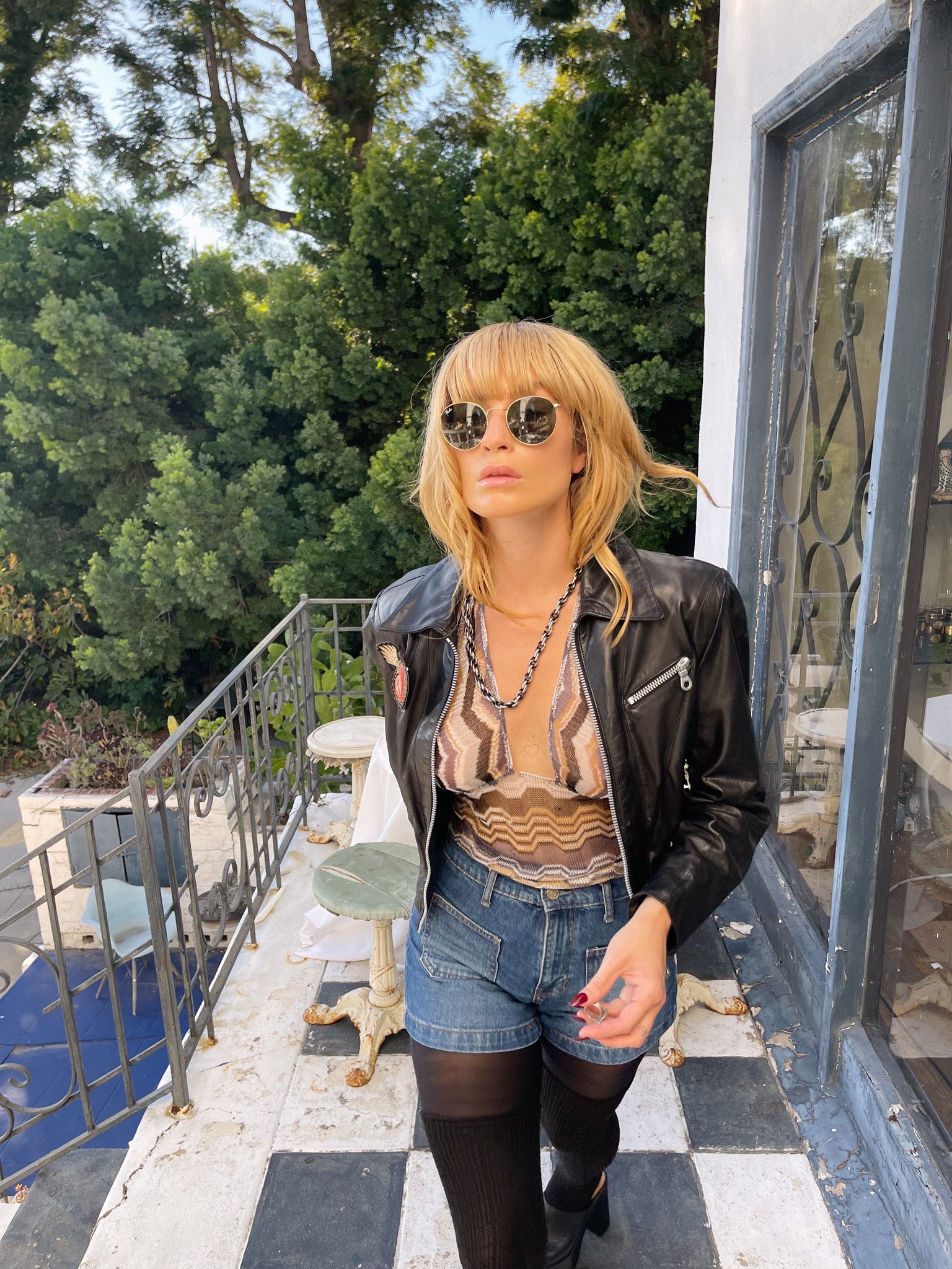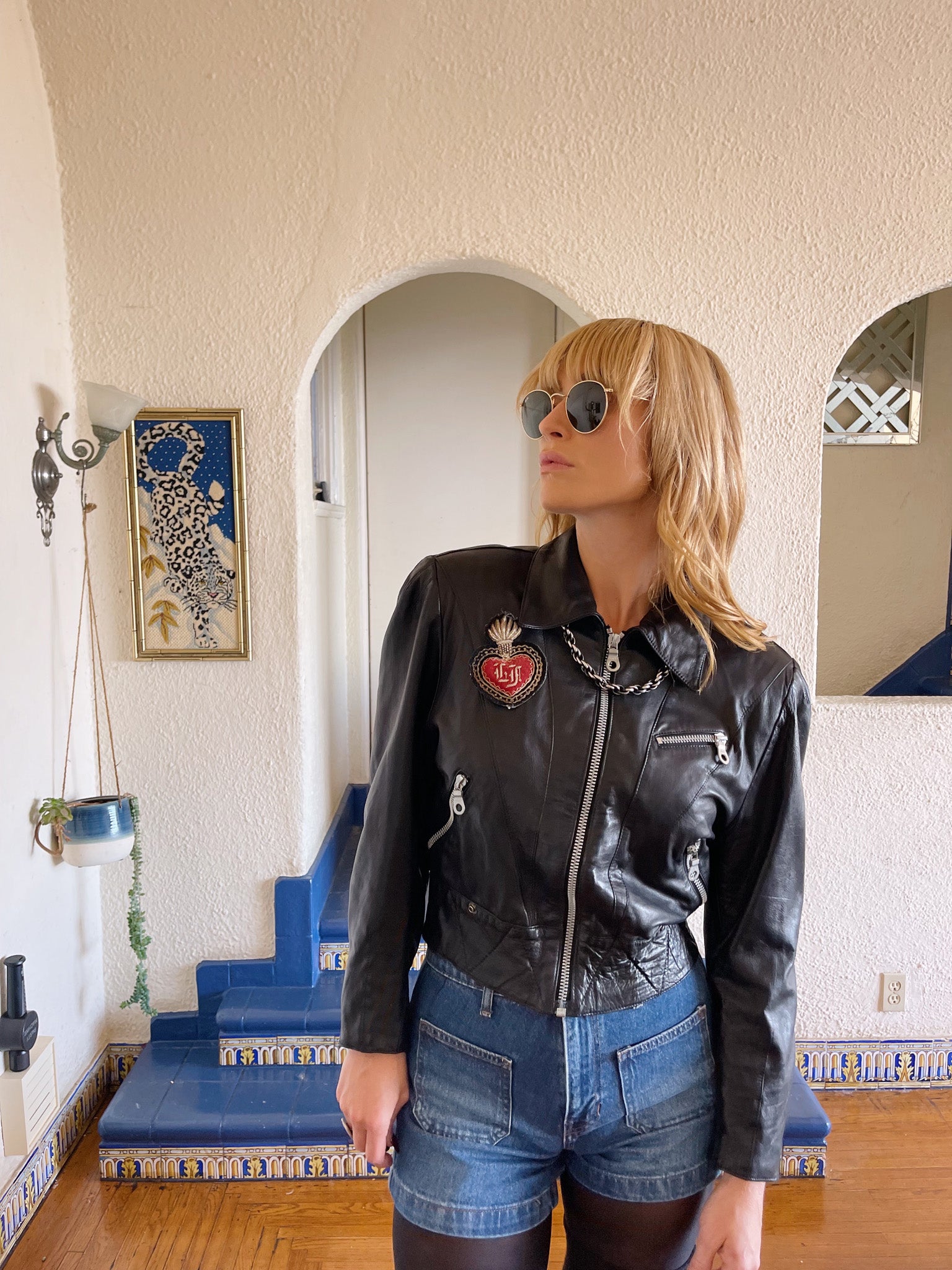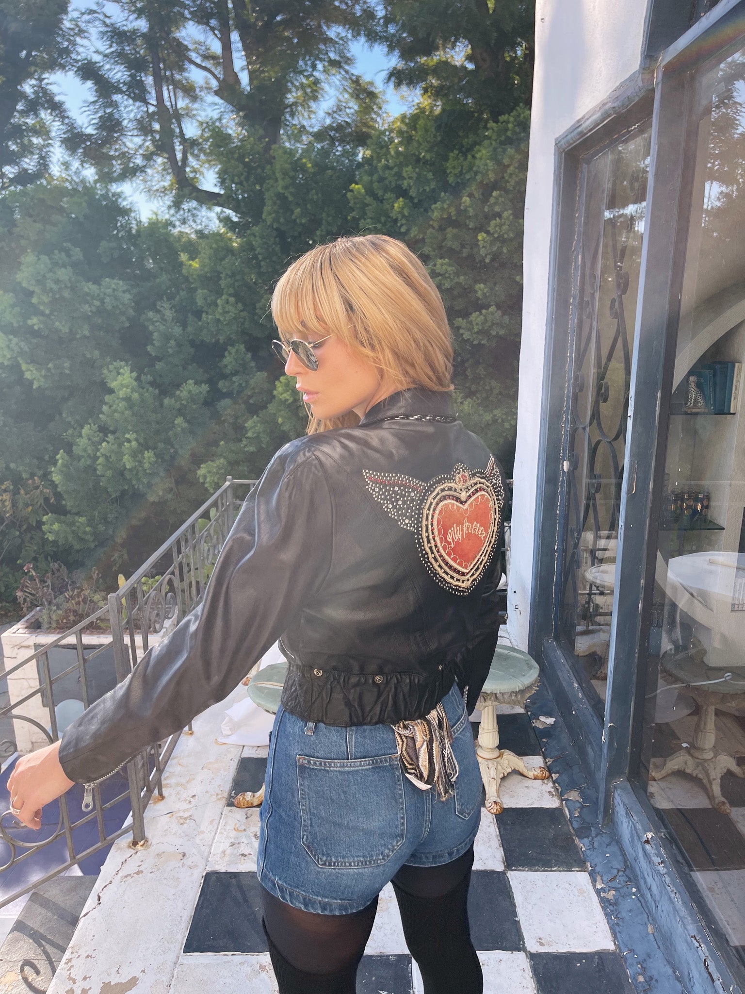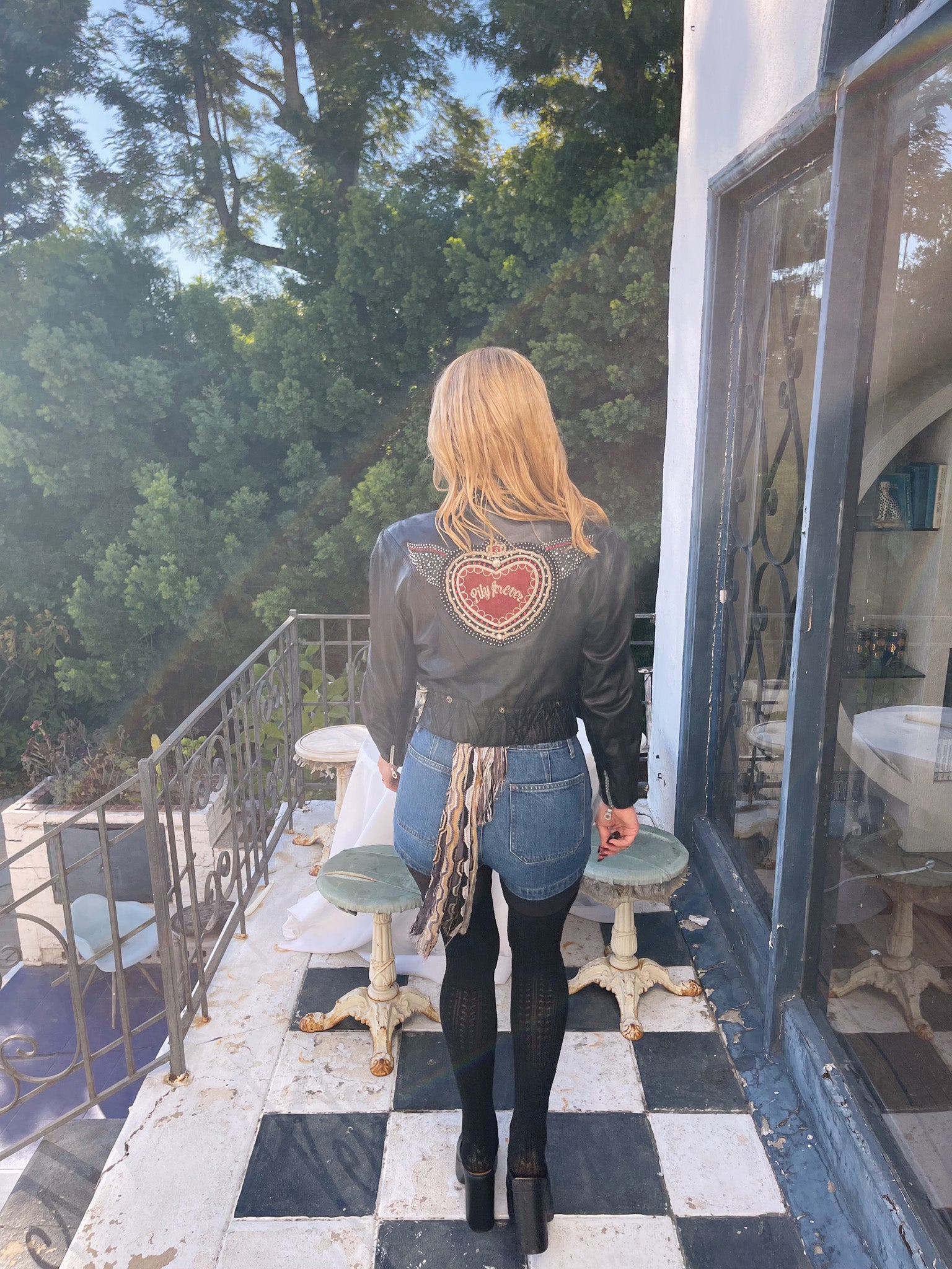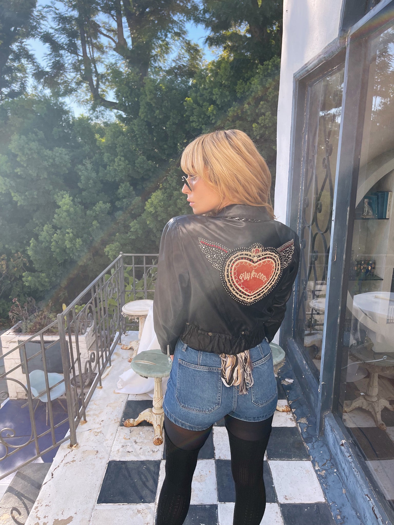 Edgy 80s Lily Farouche says it all with this leather biker - definition of attitude and allure. Hand-embroidered, studded, and finished with a sacred heart that reads Lily Forever, giving rock goddess meets romantic rebel.