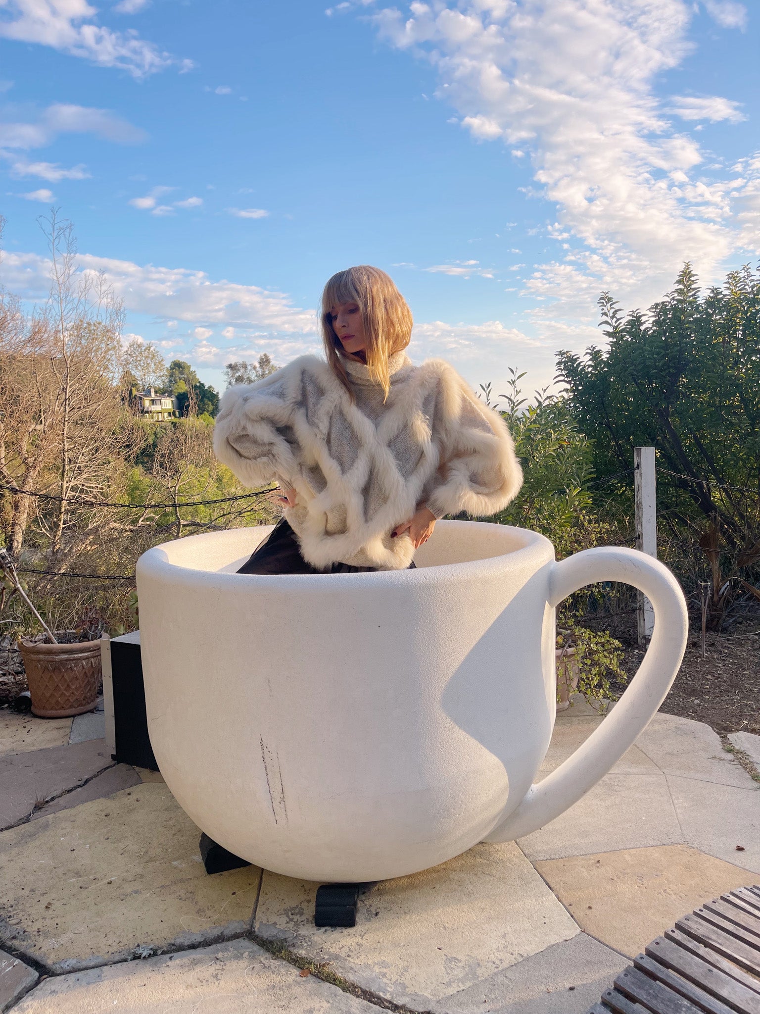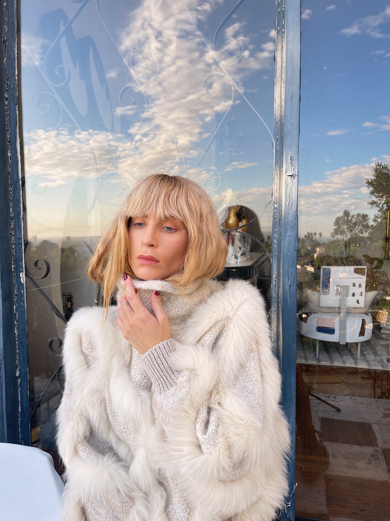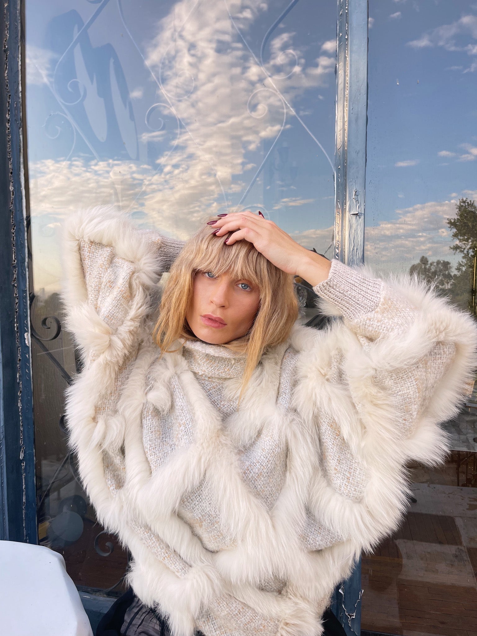 Rare vintage Schjelde turtleneck sweater — a sculptural blend of soft knit and luxe fox fur trim that feels straight off a 80s runway in the Alps. The mix of cozy boucle texture and dimensional fur paneling gives it that understated editorial drama.
