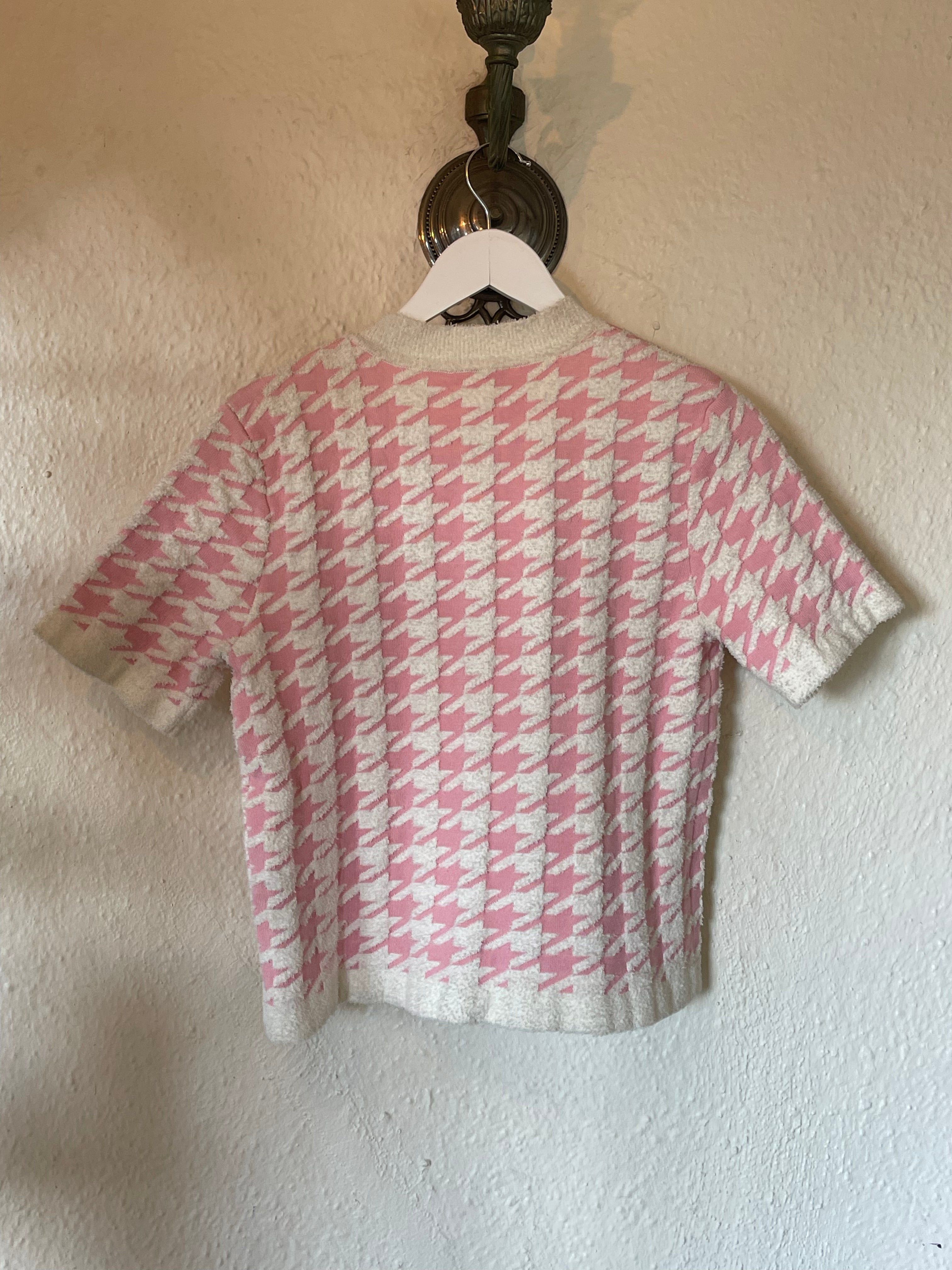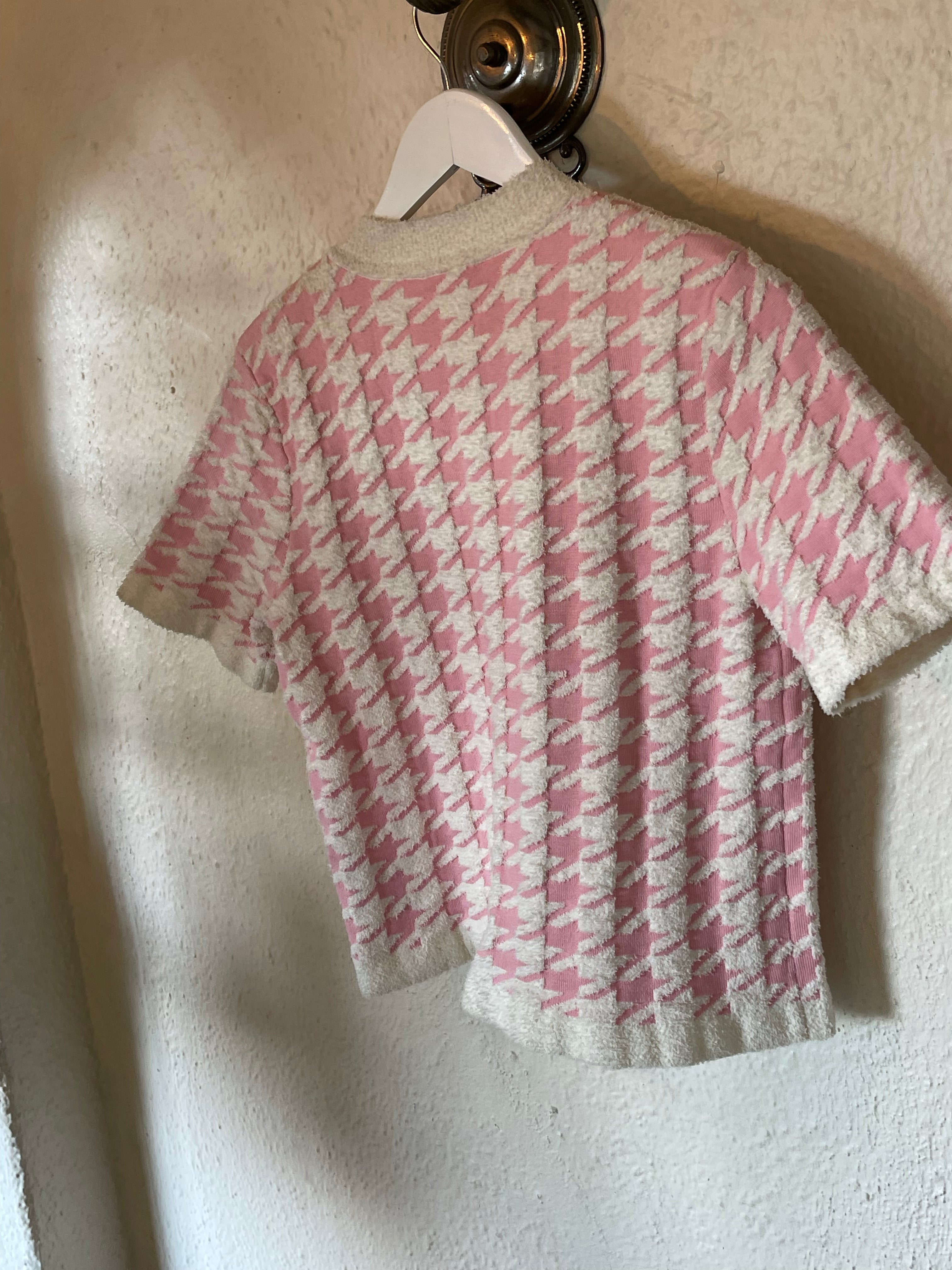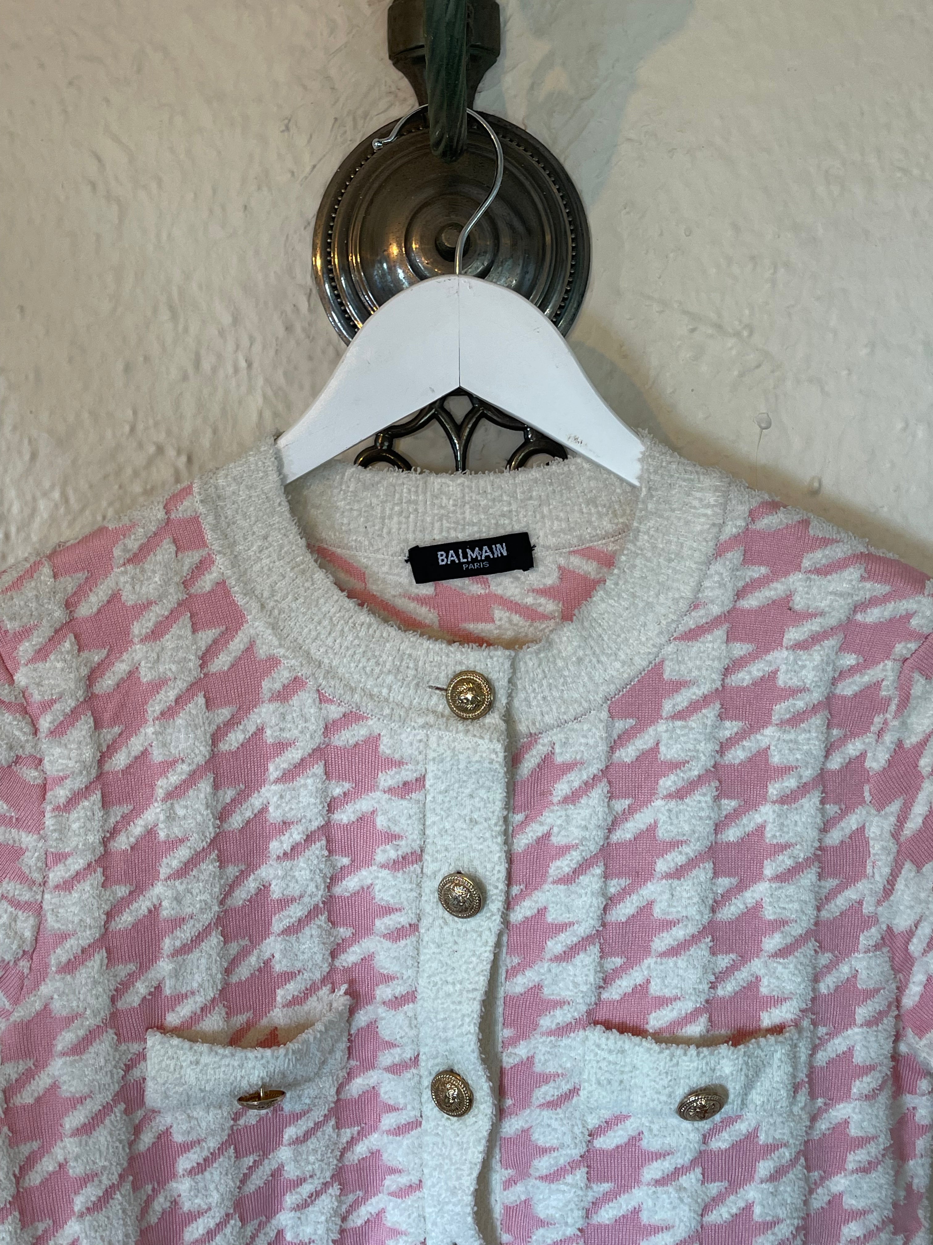 90s Vintage BALMAIN Pink & White Houndstooth Knit Short Sleeve Cardigan with Gold Buttons