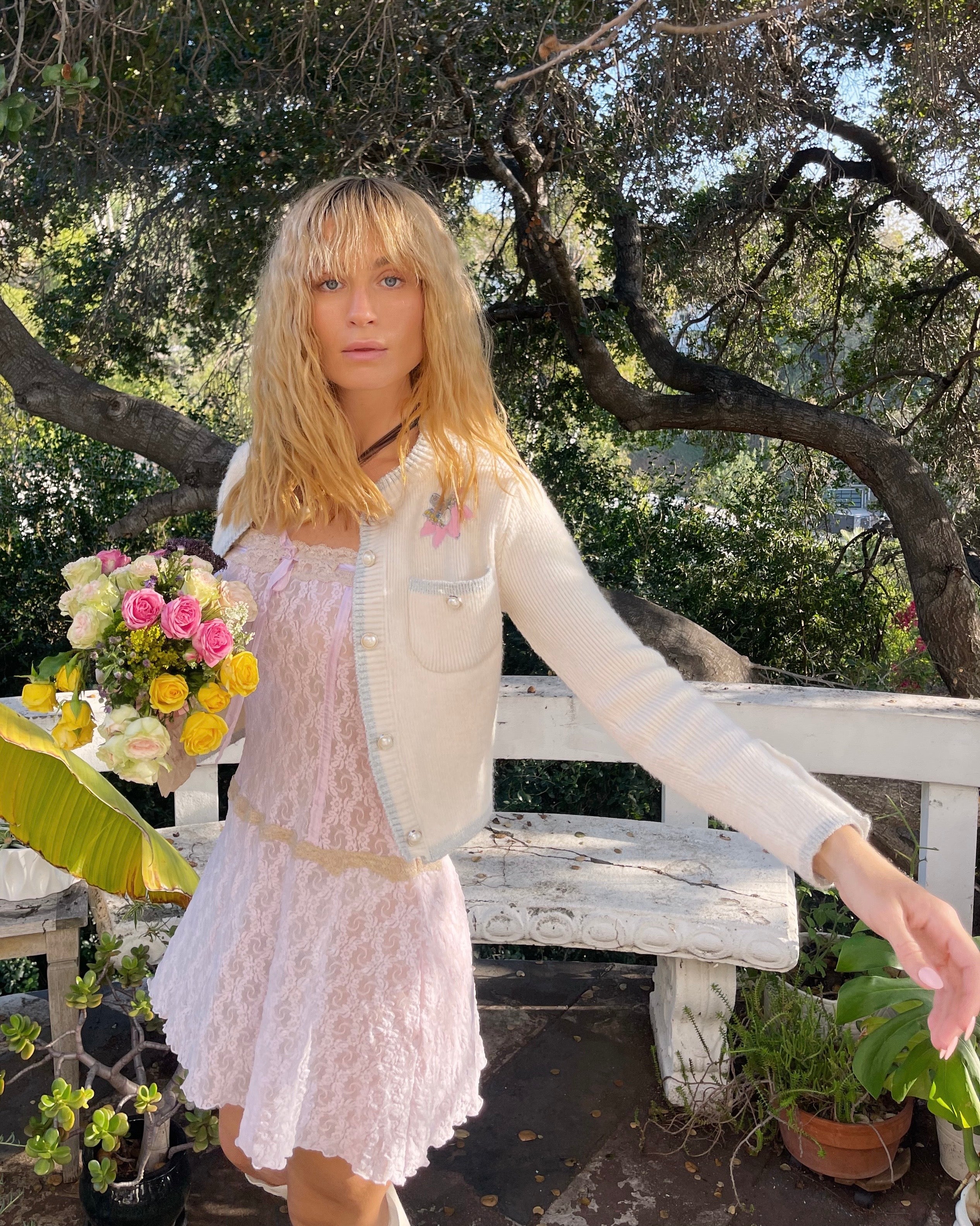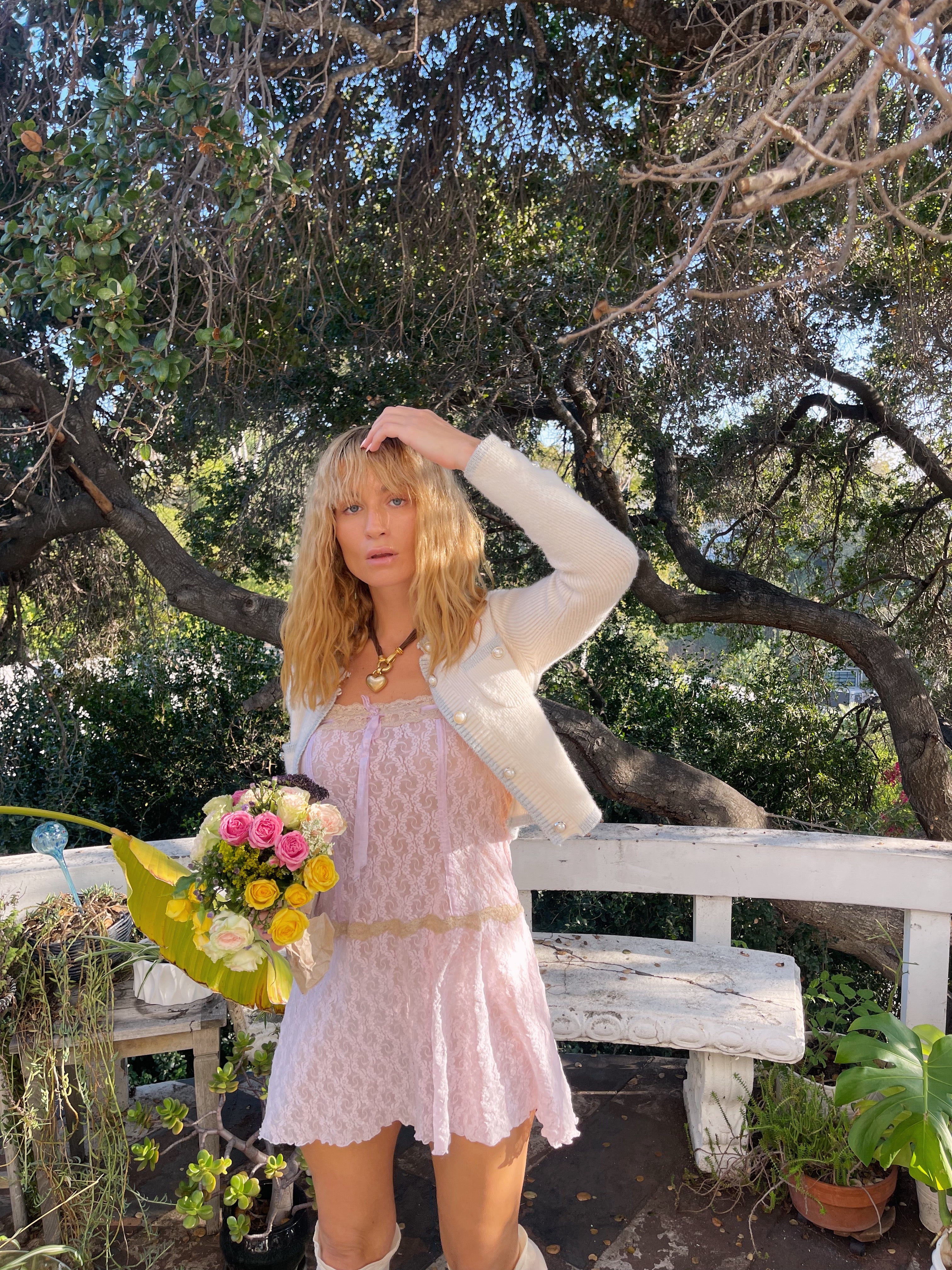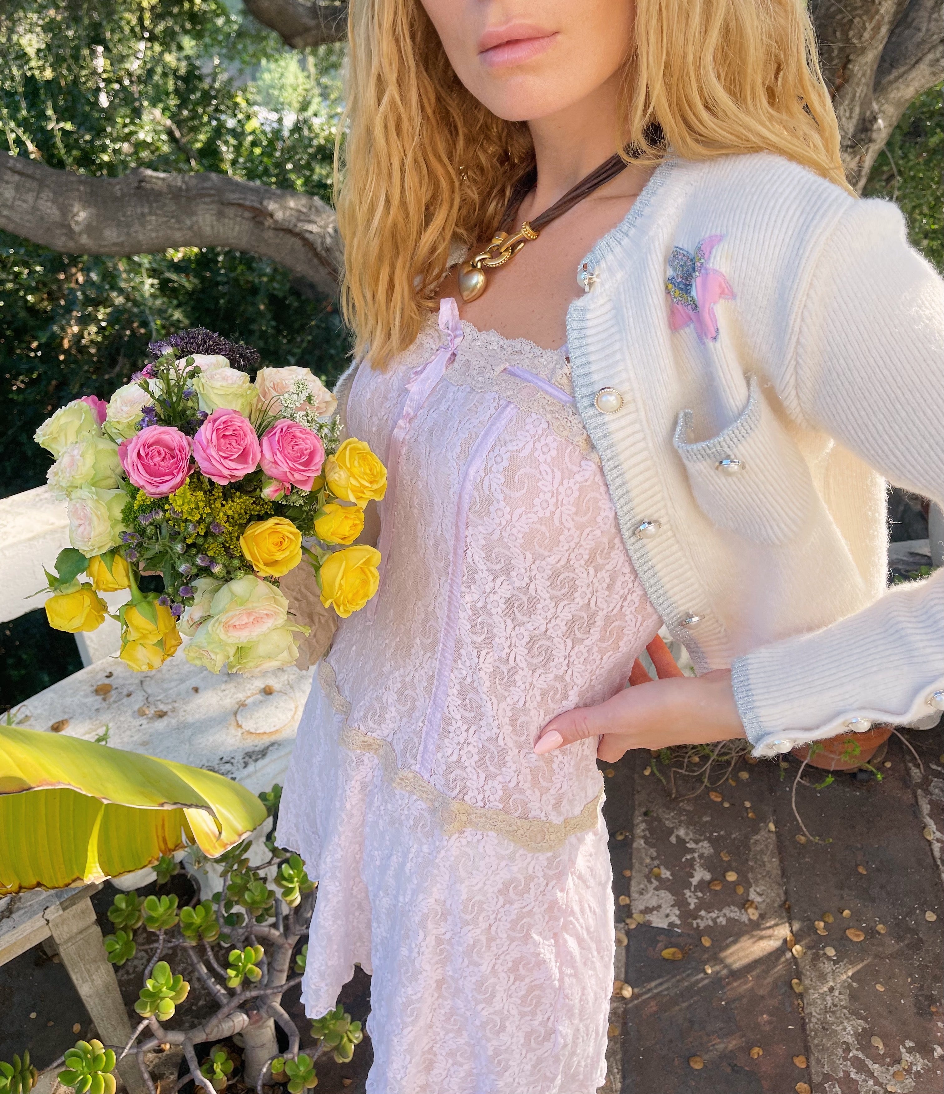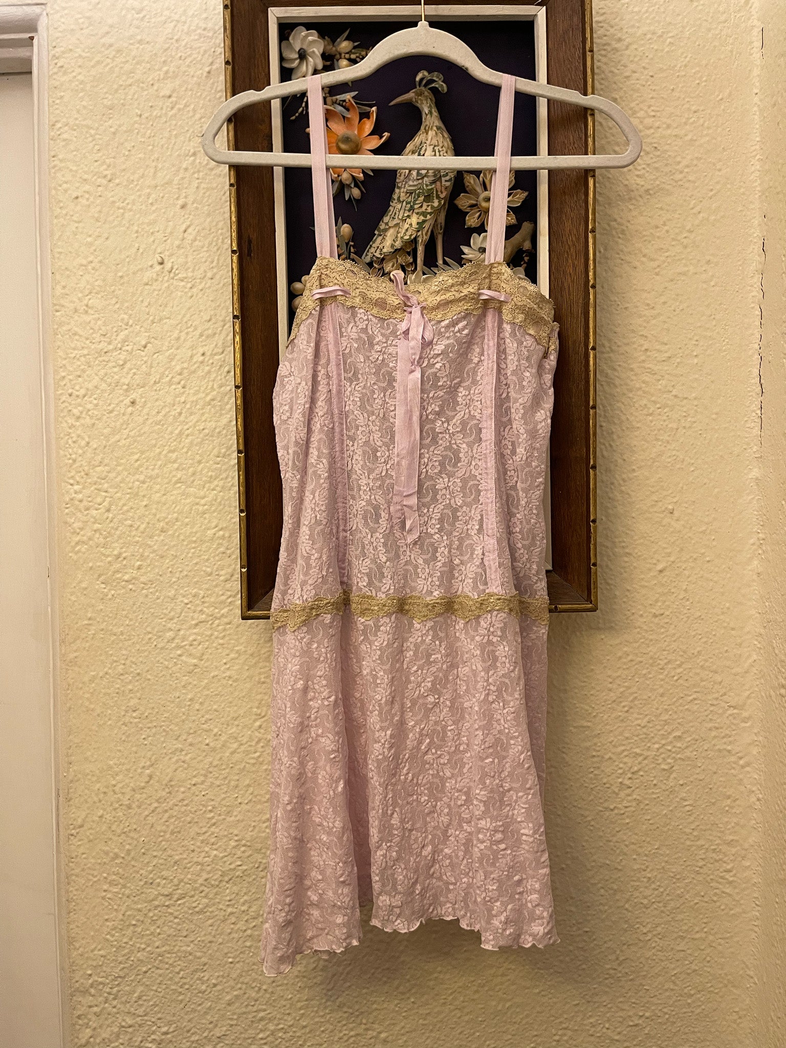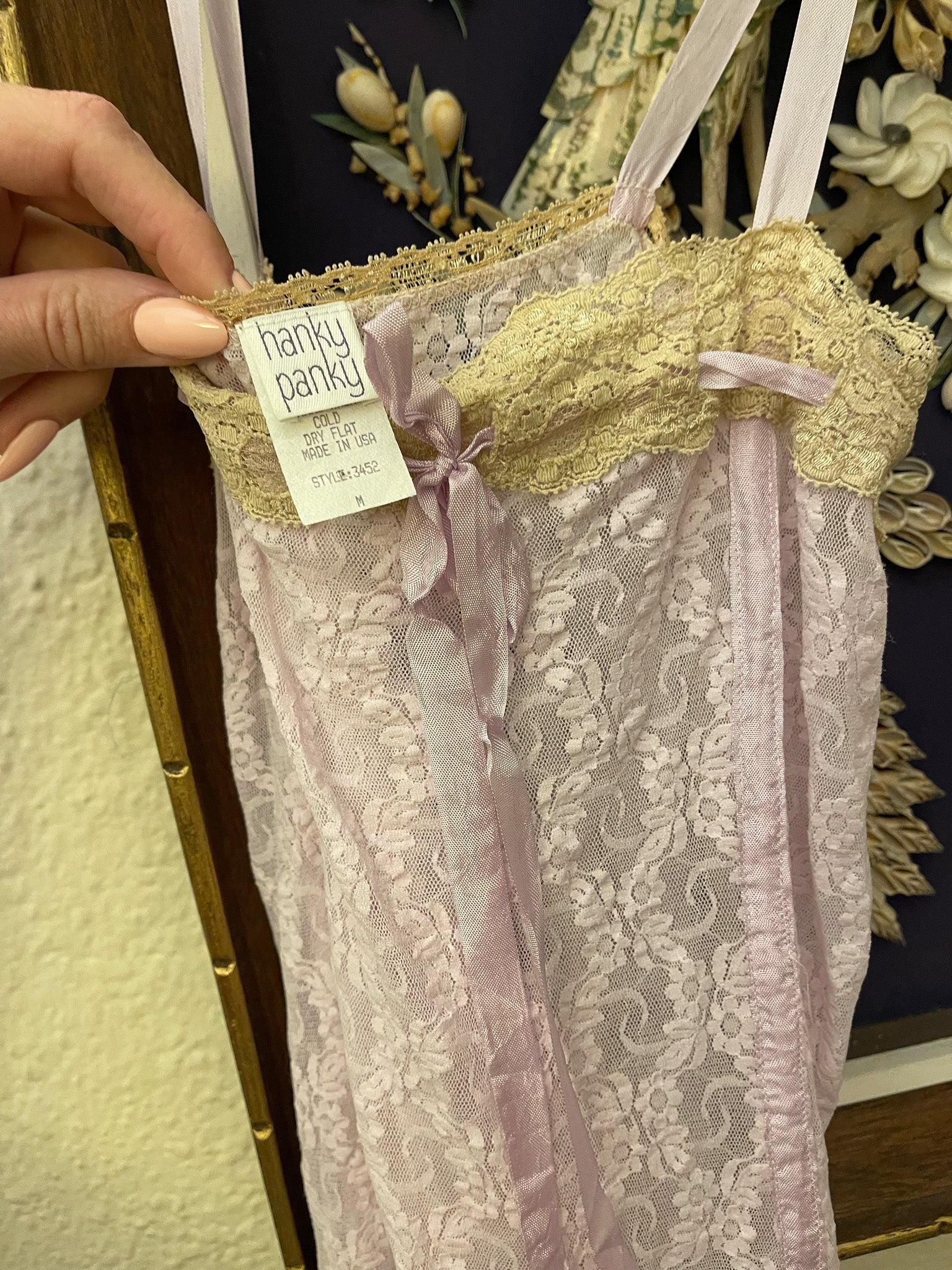 Soft lavender lace, golden trim, and a ribbon-tie front — this rare Hanky Panky slip is pure coquette energy. Dreamy and delicate.