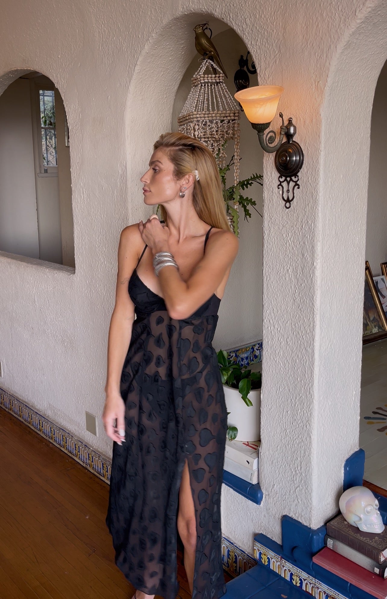 Iconic y2k Victoria’s Secret — this sheer black slip dress is giving sweet fantasy with its heart print mesh, built-in bustier, and matching thong to seal the deal.