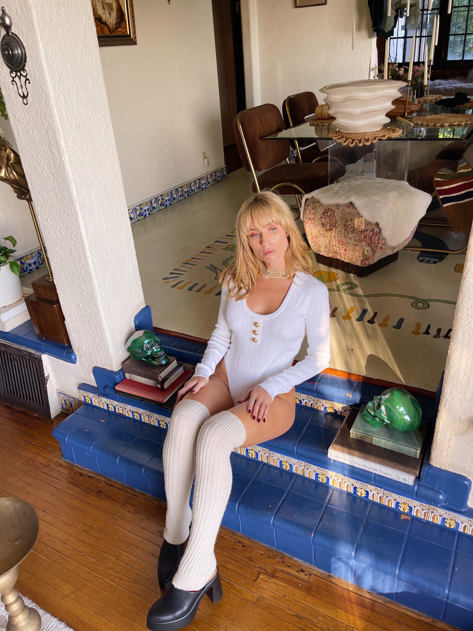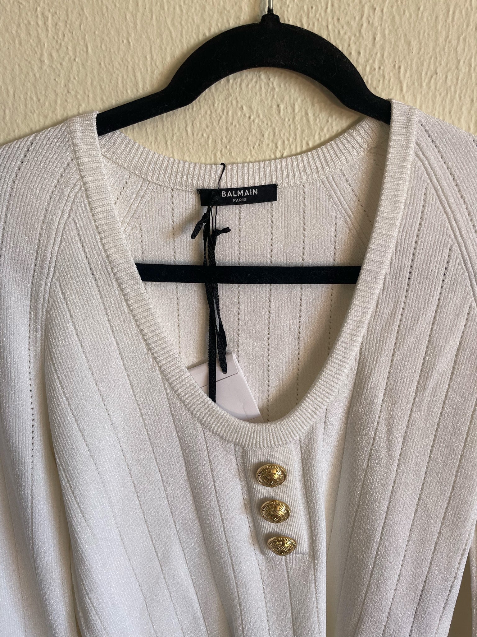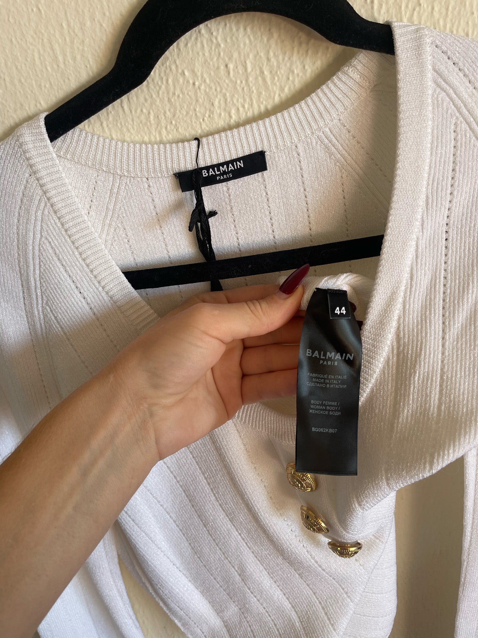 Pristine Balmain Paris white ribbed bodysuit — detailed with the house’s signature gold embossed buttons and that iconic French silhouette that hugs like couture.