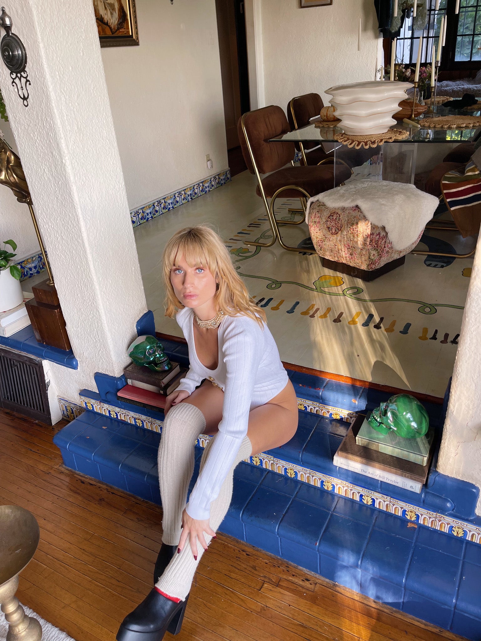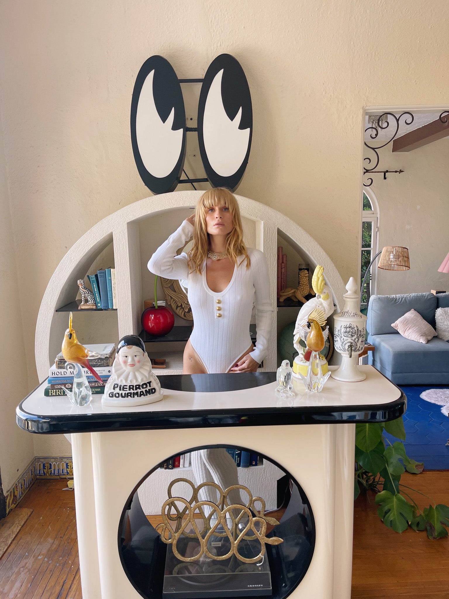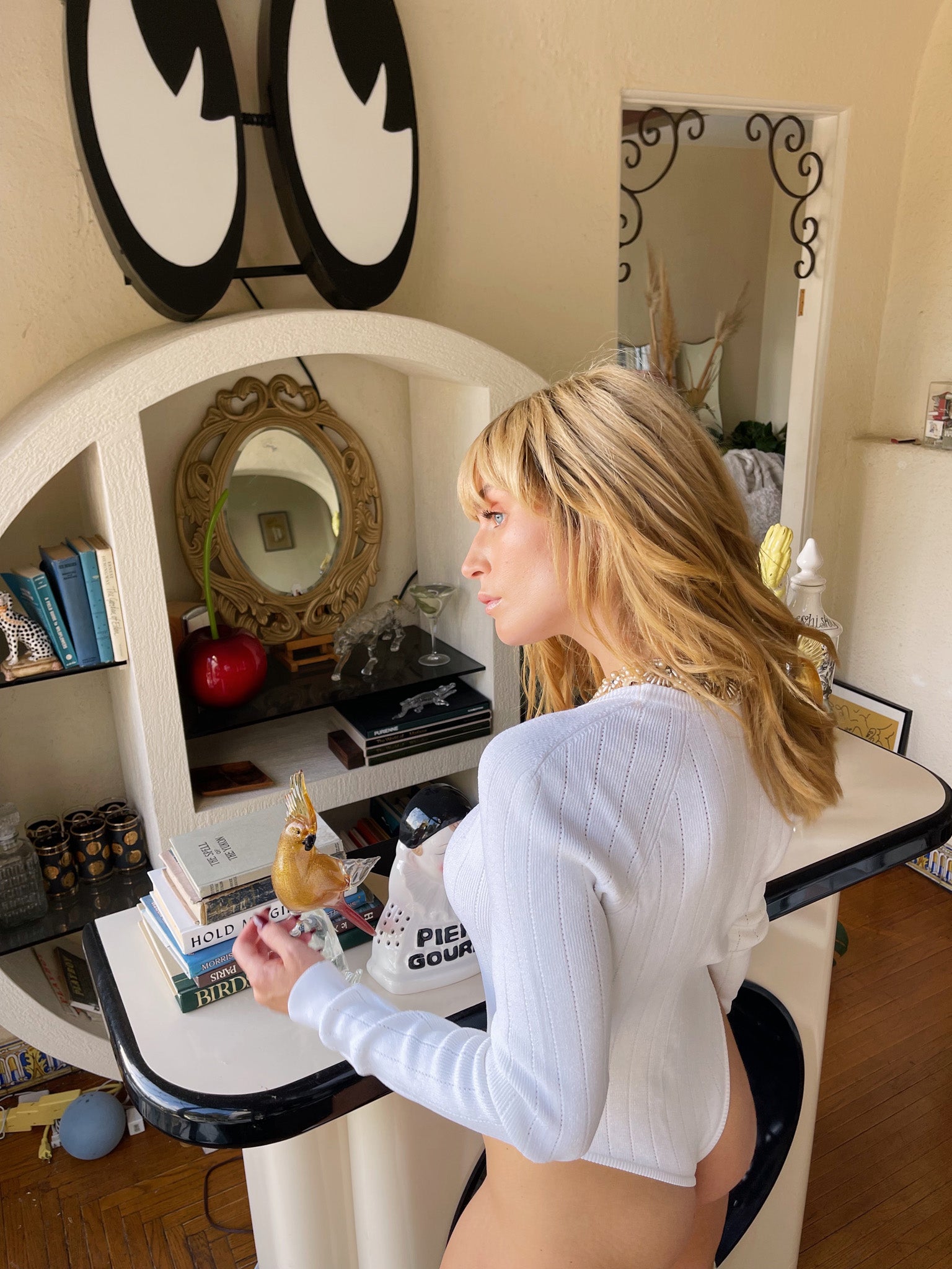 Pristine Balmain Paris white ribbed bodysuit — detailed with the house’s signature gold embossed buttons and that iconic French silhouette that hugs like couture.